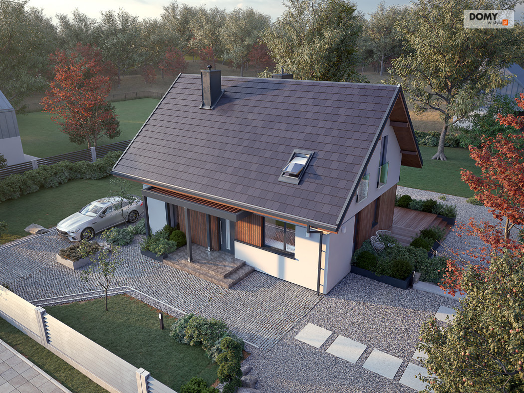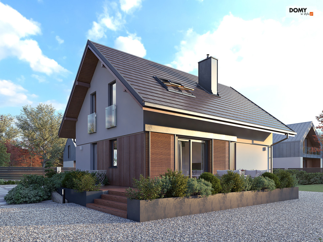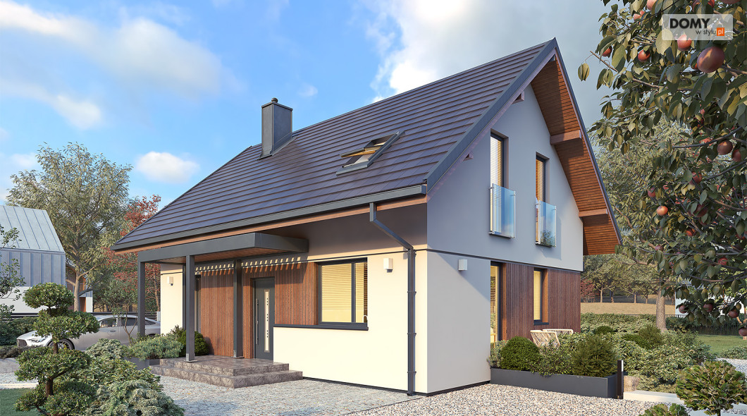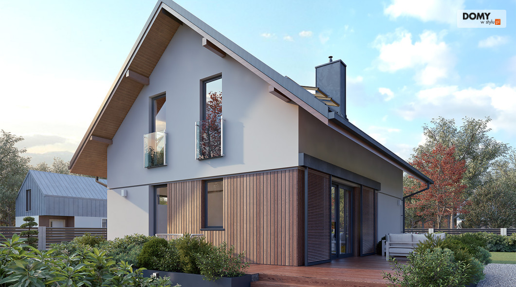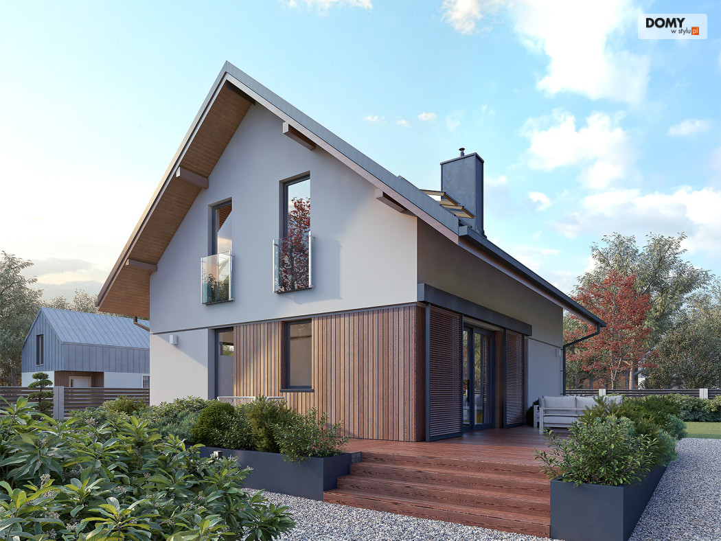 Anka dr-ST to niewielki dom z użytkowym poddaszem o optymalnej powierzchni 115 m2. Projekt stworzony został w technologii szkieletu drewnianego. Klasyczna bryła przykryta została dwuspadowym dachem w grafitowym kolorze. Na elewacji pojawił się biały tynk oraz drewniana szalówka w kolorze naturalnego drewna. Strefa dzienna to przestronny salon z kominkiem, jadalnia oraz otwarta kuchnia. Strefa nocna to trzy wygodne sypialnie oraz rodzinna łazienka.