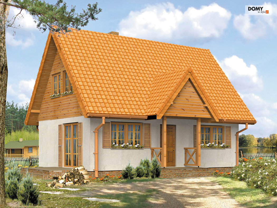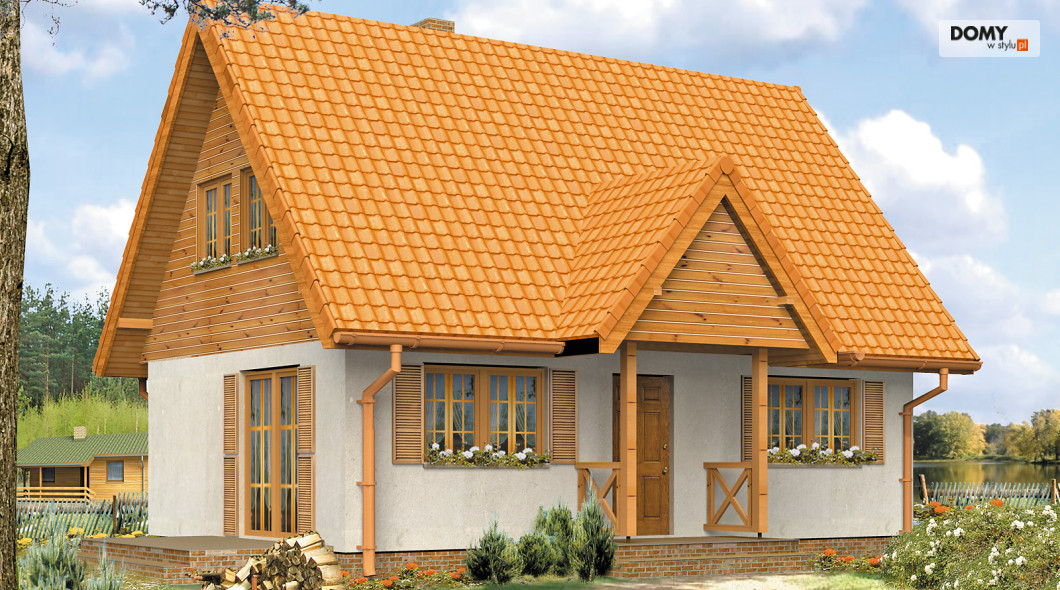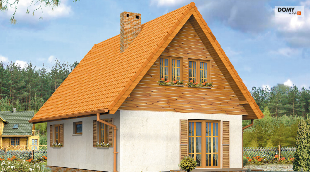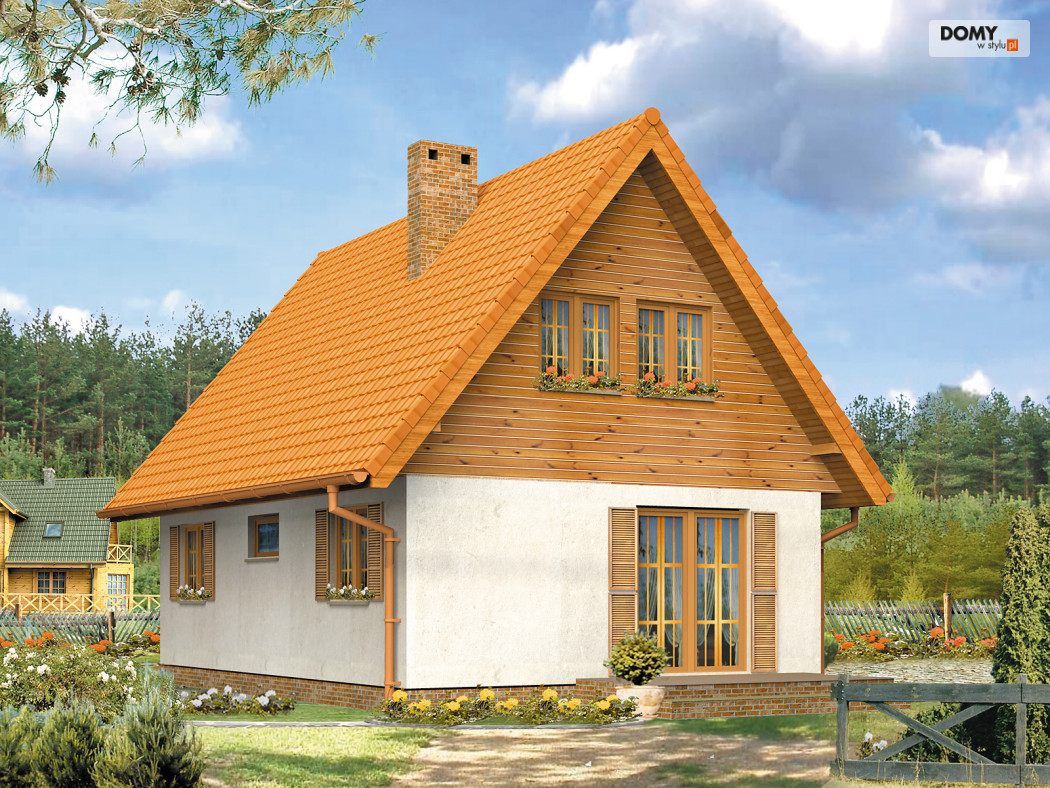 Dom letniskowy z użytkowym poddaszem. Kuchnia z jadalnią i pokojem dziennym połączone w jedną wspólną przestrzeń. Dwa pokoje na parterze i dwie sypialnie na poddaszu.
