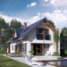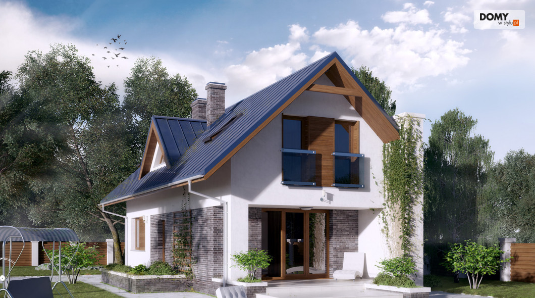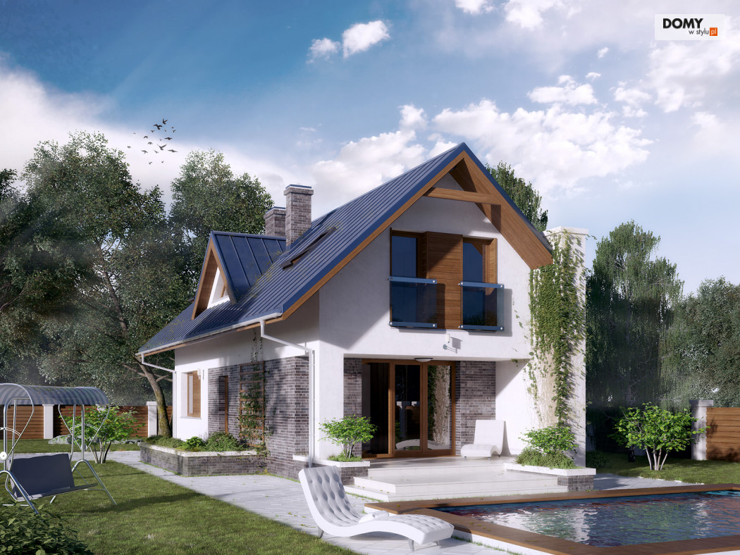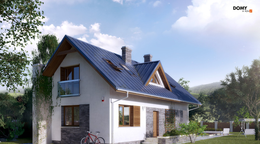 Budynek jednorodzinny, parterowy z użytkowym poddaszem przeznaczony dla 4-osobowej rodziny. Projekt idealnie wpisuje się na wąską działkę. Ściana przeciwpożarowa umożliwia jego budowę po granicy działki. Na parterze znajduje się kuchnia z jadalnią i spiżarnią, salon, wc i kotłownia. Na poddaszu zaprojektowano trzy sypialnie i łazienkę. Największa sypialnia posiada dodatkowo własną łazienkę i garderobę.
