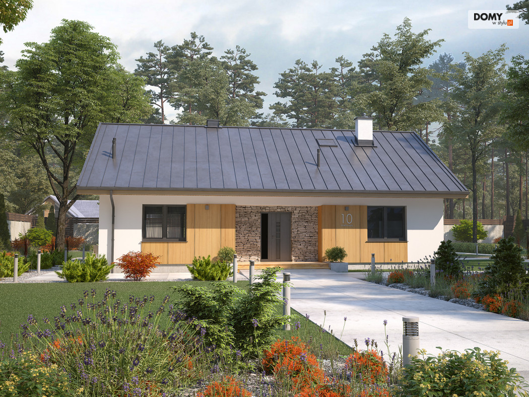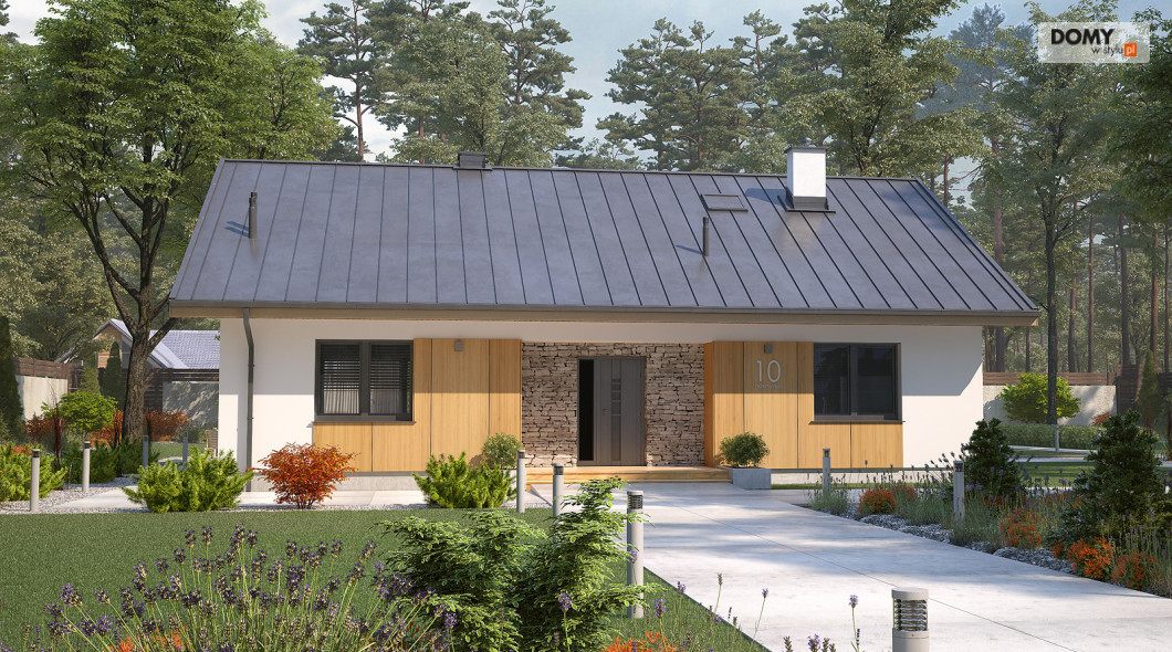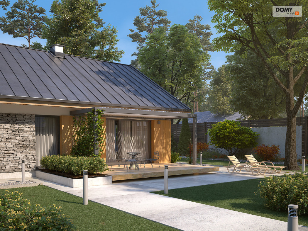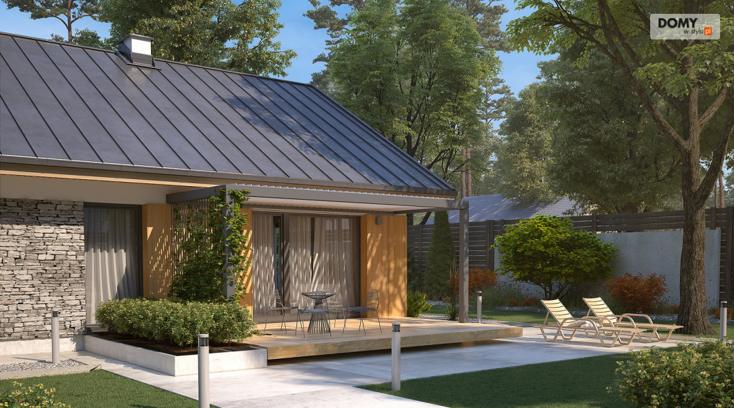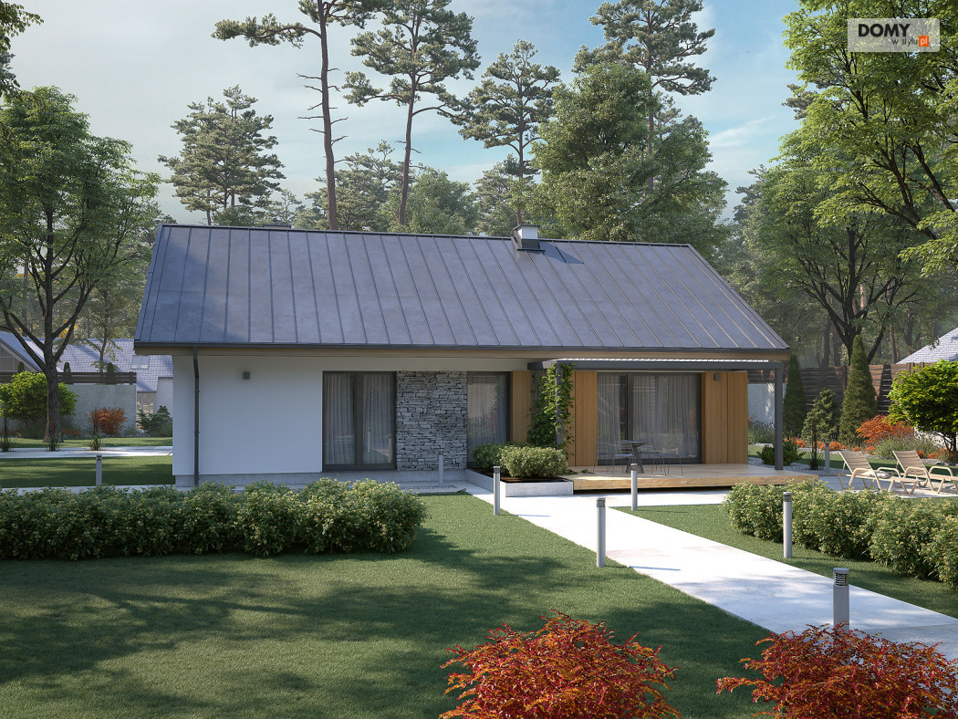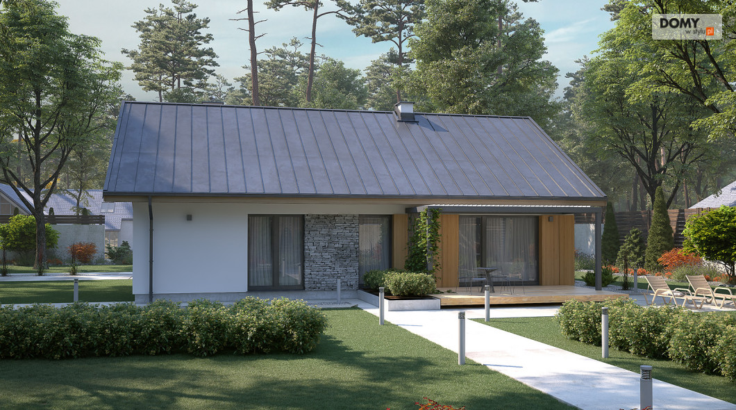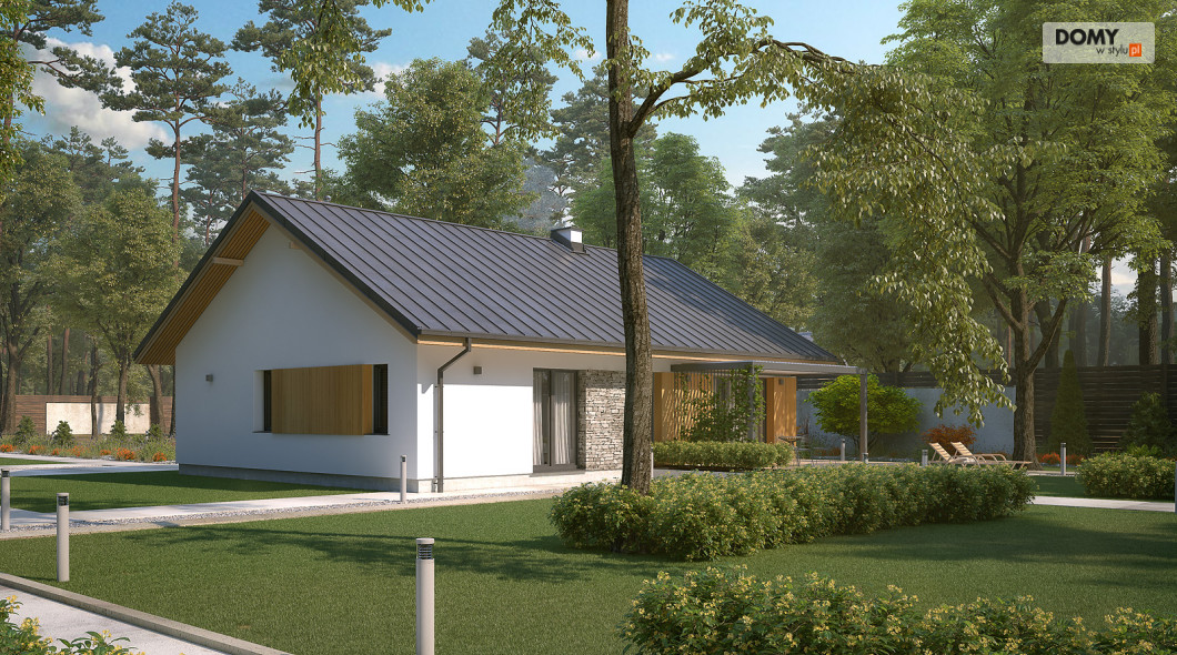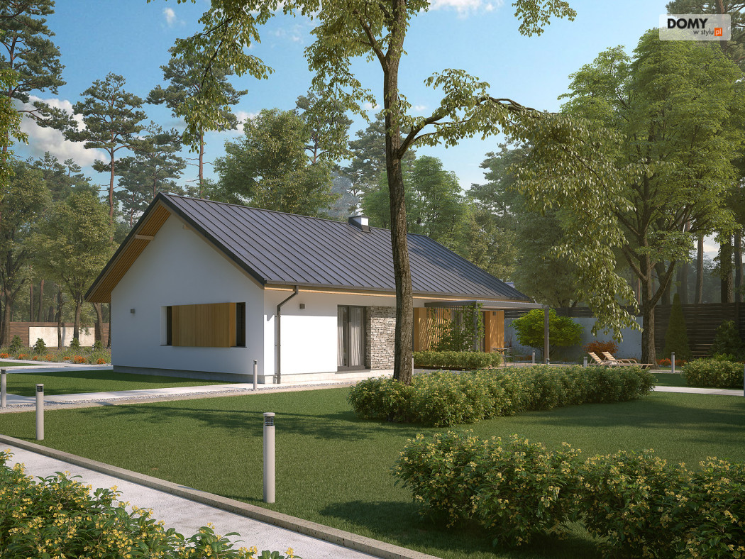 Fistaszek 6 to projekt domu parterowego zaprojektowany z myślą o 4-osobowej rodzinie. Układ funkcjonalny został podzielony na dwie strefy: dzienną i nocną. W strefie dziennej znajduje się kuchnia ze spiżarnią oraz przestronny salon z miejscem na duży stół jadalniany. Strefa nocna obejmuje trzy sypialnie, w tym jedną z prywatną garderobą. Dodatkowo zaprojektowano oddzielne wc oraz łazienkę z miejscem na kocioł gazowy. Program użytkowy oparto na prostym rzucie oraz zaprojektowano dwuspadowy dach. Wprowadzone rozwiązania wpłyną na zmniejszenie kosztów budowy takiego domu.
