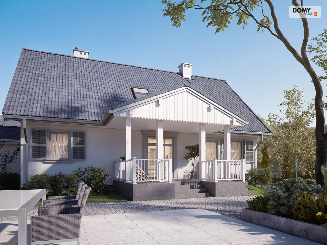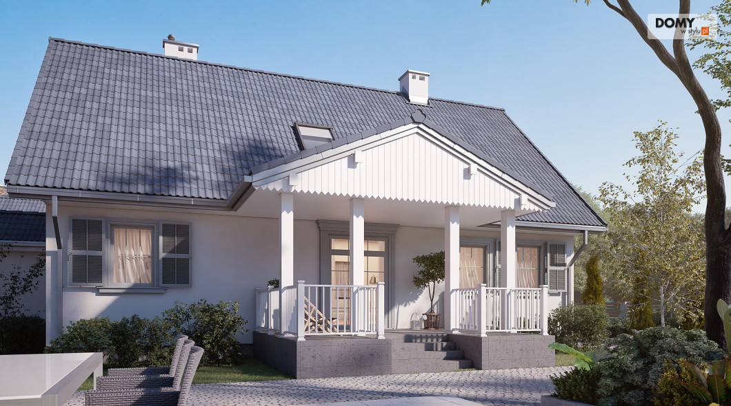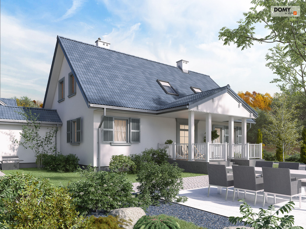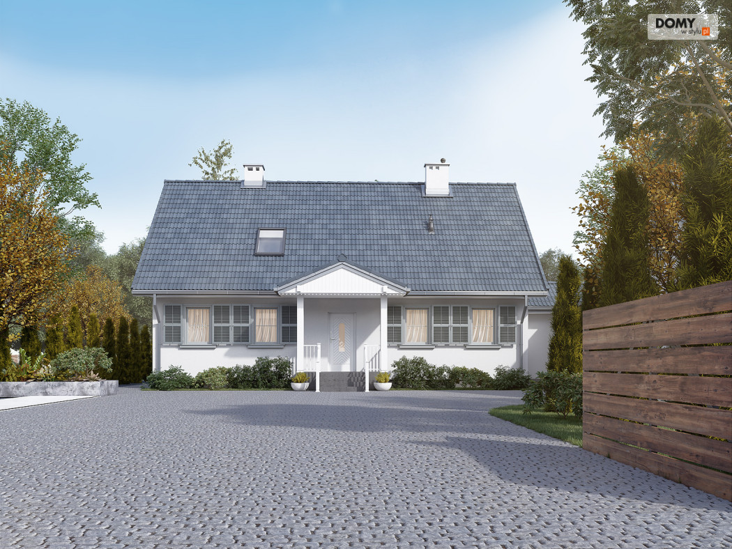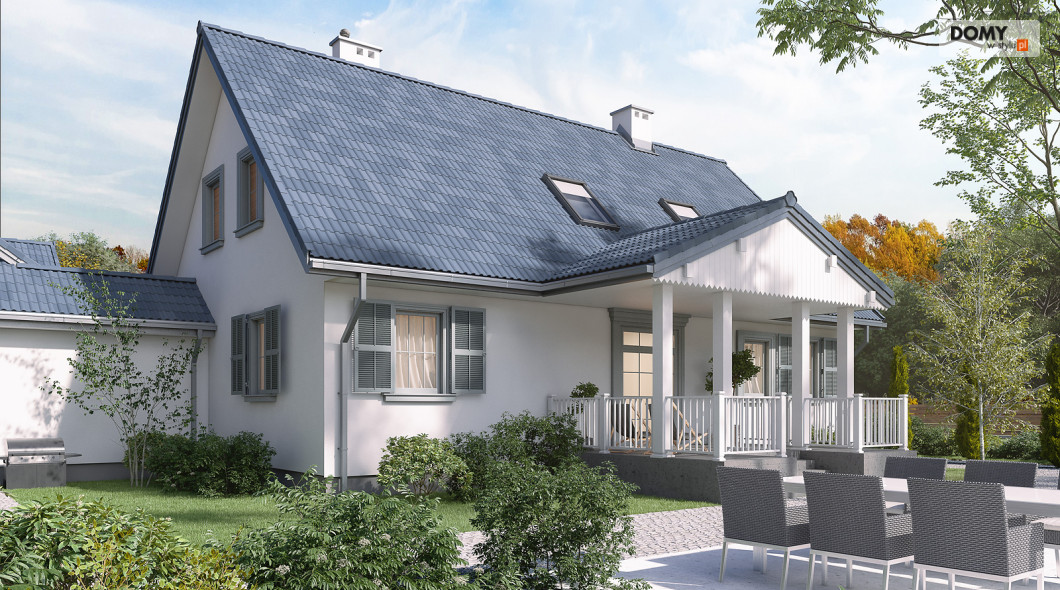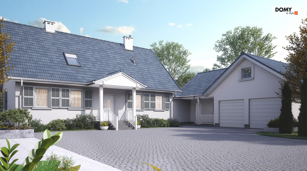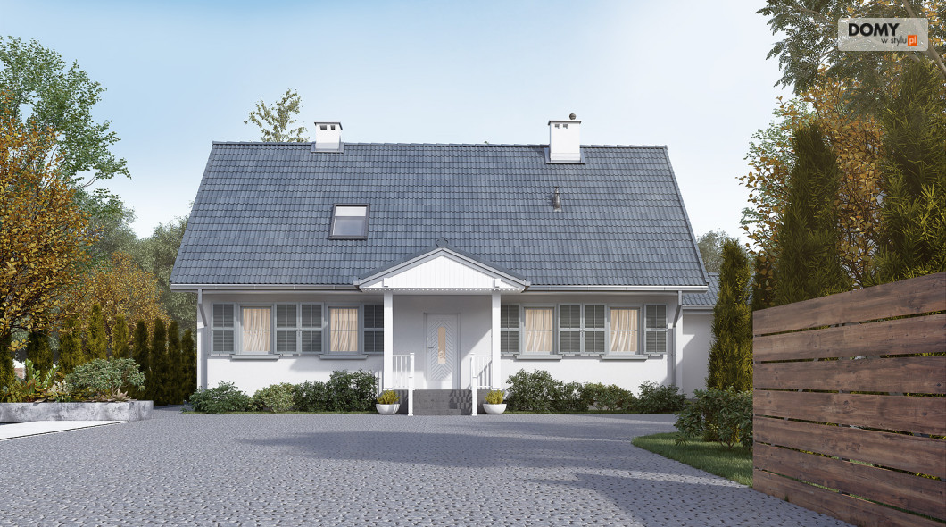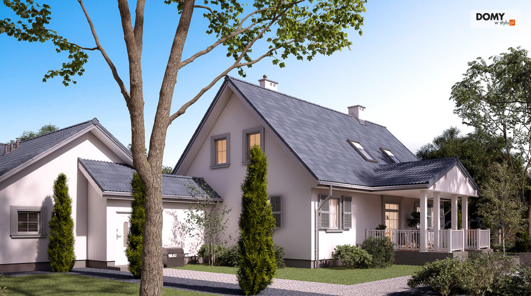 Szpak 2 to projekt domu z użytkowym poddaszem, którego część mieszkalna oraz gospodarcza zostały zaprojektowane w dwóch budynkach, połączonych ze sobą za pomocą łącznika. W części mieszkalnej na parterze znajduje się salon z wyjściem na zadaszony taras oraz kuchnia połączona z jadalnią. Dodatkowo na parterze znajduje się pokój mogący pełnić funkcję gabinetu lub sypialni gościnnej. Program funkcjonalny uzupełnia łazienka oraz kotłownia z wejściem do łącznika, który łączy część mieszkalną z gospodarczą. Na poddaszu zaprojektowano część nocną z trzema sypialniami, łazienką oraz garderobą. W części gospodarczej znajduje się dwustanowiskowy garaż z kanałem samochodowym. Z garażu przechodzimy do dużego pomieszczenia gospodarczego z dodatkowym wejściem od frontu budynku. W tej części znajduje się nieużytkowe poddasze, które może służyć jako strych.