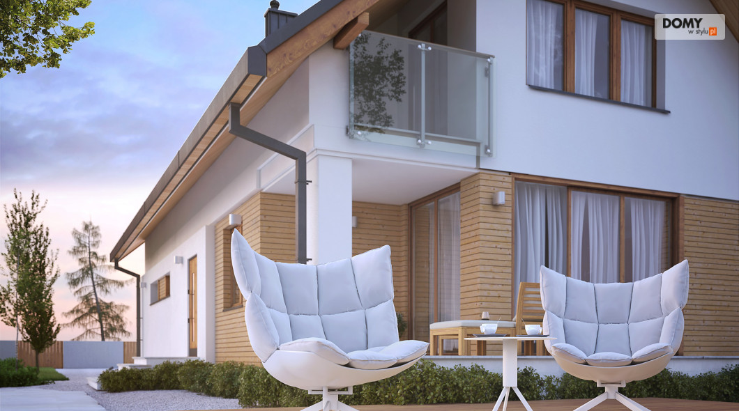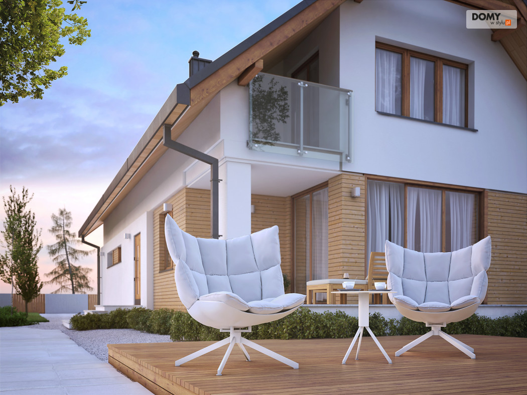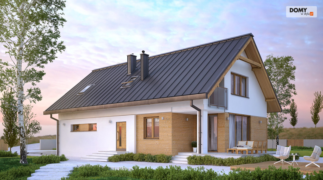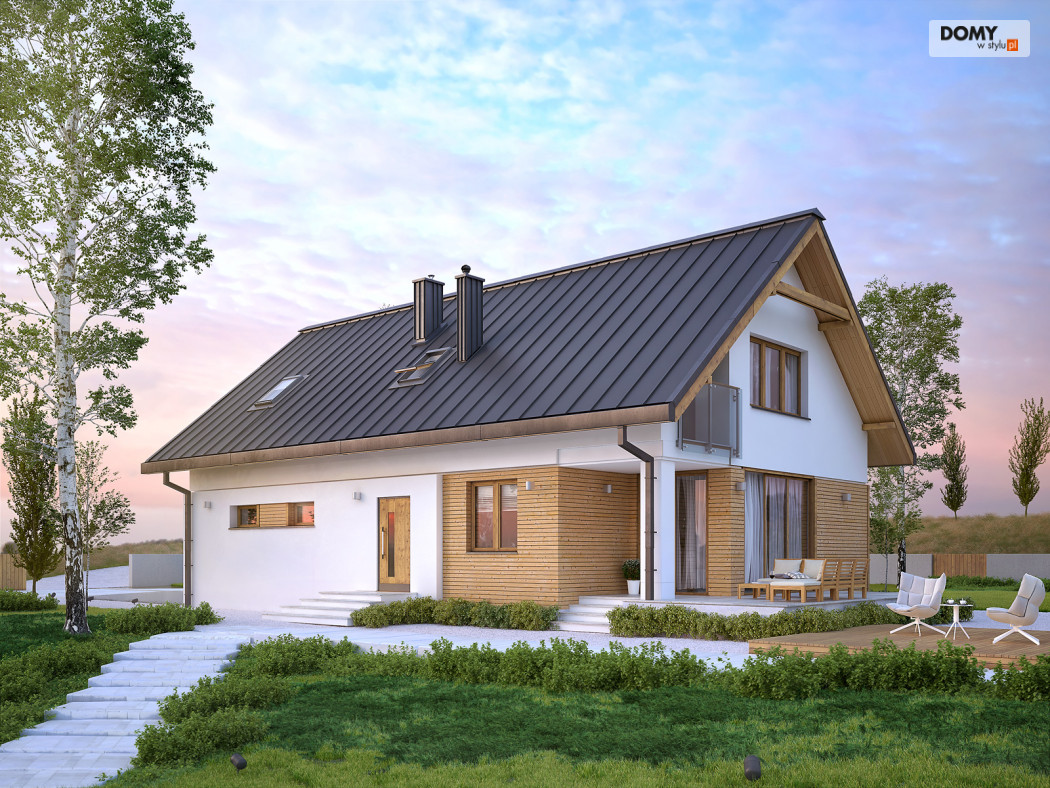 Parterowy dom z użytkowym poddaszem przeznaczony dla 4-osobowej rodziny. Prosta, klasyczna bryła w połączeniu z nowoczesnymi elewacjami tworzy przyjemny klimat budynku. Dwustanowiskowy garaż.