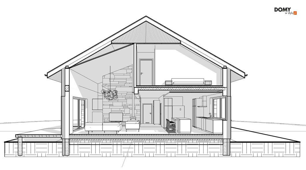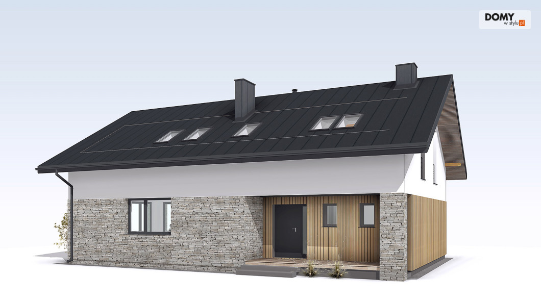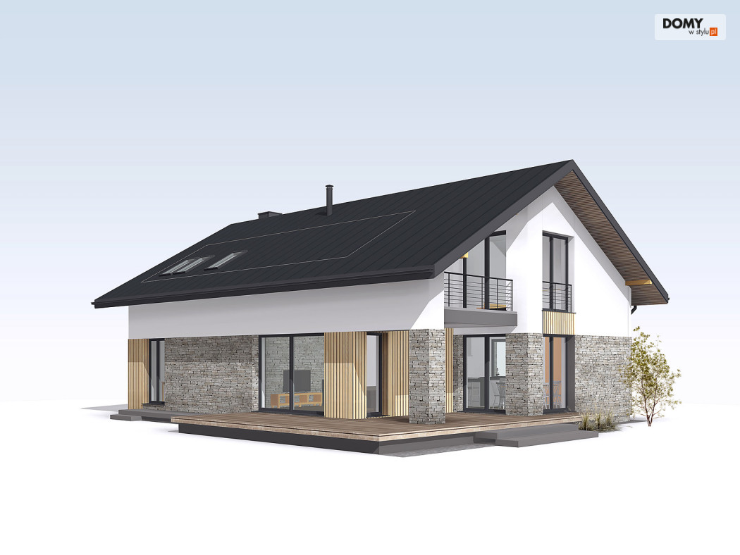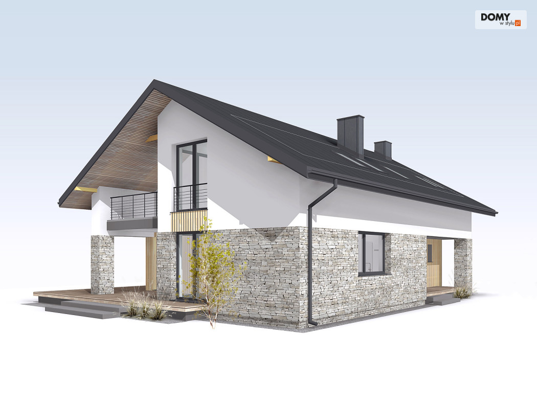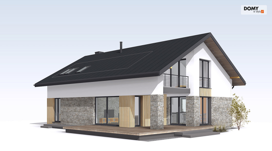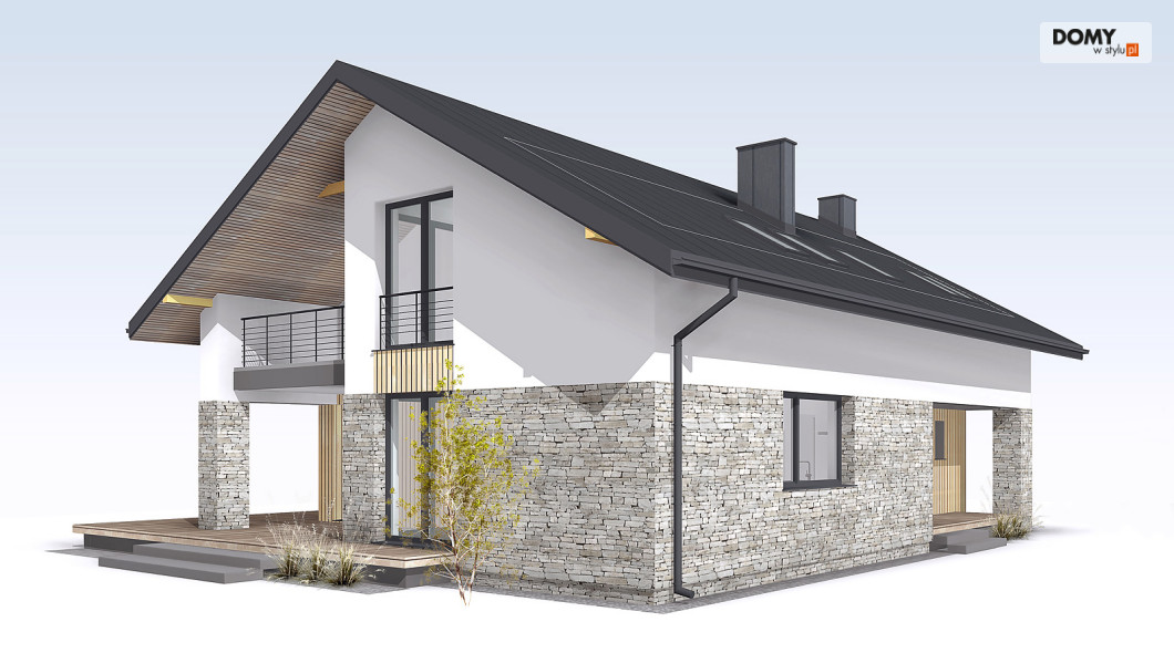 Słoneczny 2 to projekt domu z użytkowym poddaszem bez garażu.  Układ funkcjonalny domu podzielono pomiędzy dwie kondygnacje.  Na parterze znalazła się część dzienna.  Tworzą ją przestronny salon, jadalnia z wyjściem na taras oraz kuchnia, w której wygospodarowano miejsce na wyspę.  Przy kuchni pojawiła się praktyczna spiżarnia.   Układ funkcjonalny parteru dopełnia dodatkowy pokój, łazienka oraz duża kotłownia.  Na poddaszu zaproponowano trzy wygodne sypialnie oraz rodzinną łazienkę.  Jedna z sypialni zaprojektowana została jako apartament gospodarzy z prywatną łazienką i garderobą. Niewątpliwym atutem projektu jest zadaszony taras, dostępny zarówno z salonu, jak i jadalni oraz otwarta część dzienna z licznymi przeszkleniami i antresolą.