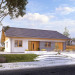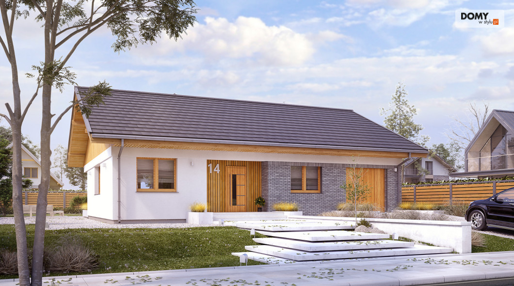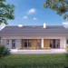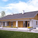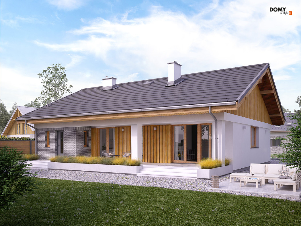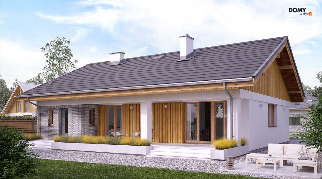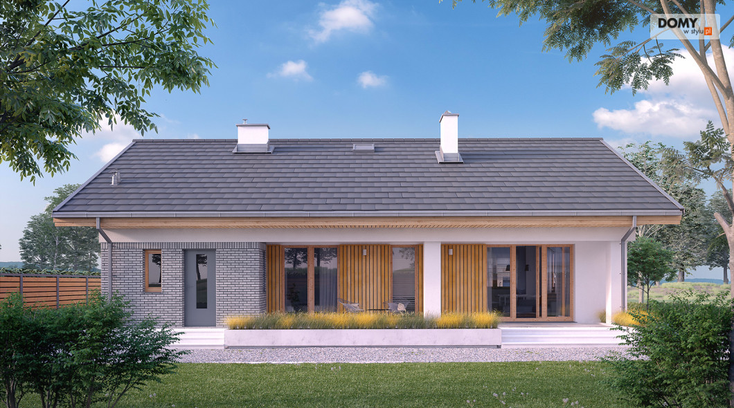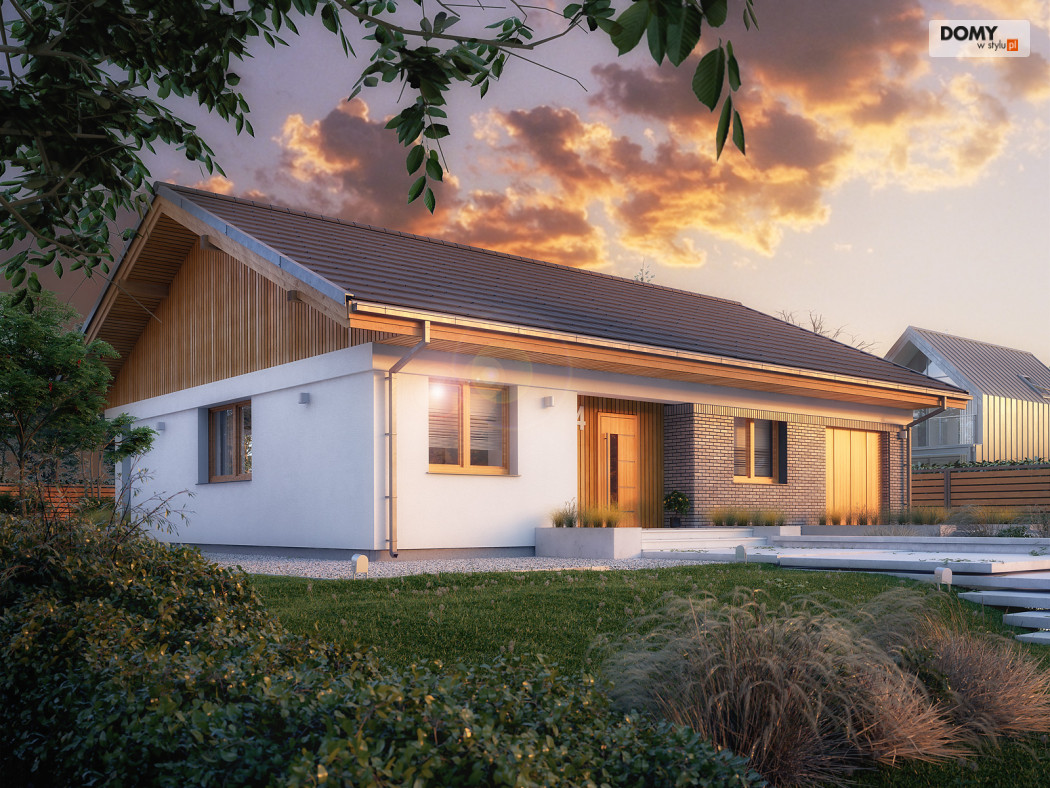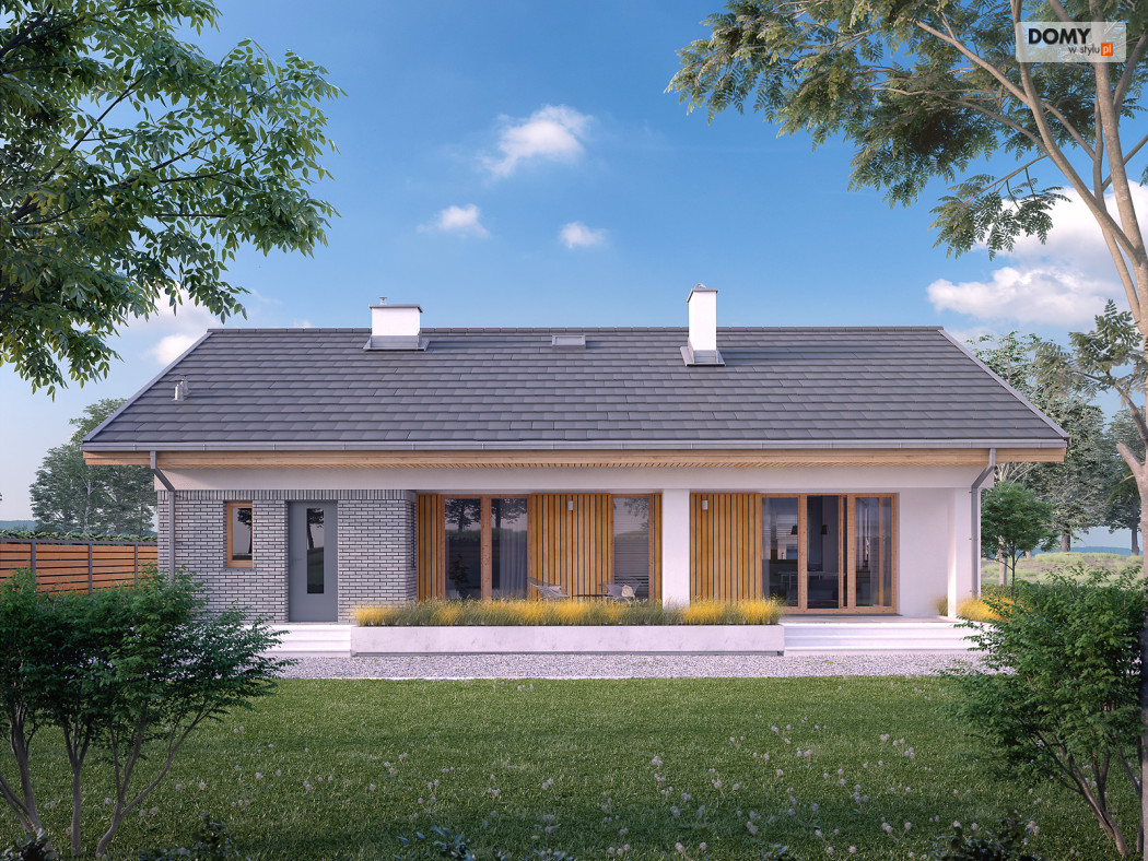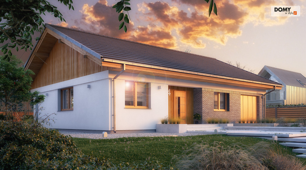 Fistaszek 4 to projekt domu parterowego zaprojektowany z myślą o 3-osobowej rodzinie. Budynek charakteryzuje się prostą bryłą przykrytą dwuspadowym dachem i niewielką powierzchnią użytkową. Gwarantuje to nie tylko niskie koszty budowy, ale również niewielkie koszty późniejszej eksploatacji. Elewacja budynku została wzbogacona drewnianą szalówką, dzięki czemu budynek prezentuje się elegancko i nowocześnie. Na niedużej powierzchni użytkowej, autor zaprojektował funkcjonalne wnętrze, które pozwala na łatwą aranżację pomieszczeń. Układ funkcjonalny został podzielony na trzy strefy: dzienną, nocną i gospodarczą. Strefa dzienna składa się z przestronnego salonu z kominkiem, który płynnie łączy się z jadalnią oraz kuchnią. Część nocna to dwie wygodne sypialnie oraz rodzinna łazienka z wydzielonym miejscem na pralnię. W bryle budynku zaprojektowano również jednostanowiskowy garaż z przejściem do kotłowni dostosowanej pod dwa rodzaje ogrzewania: gazowe oraz na paliwo stałe. Atutem projektu jest zadaszony taras od strony ogrodu z bezpośrednim wyjściem z salonu, łazienki i sypialni.