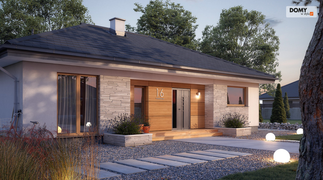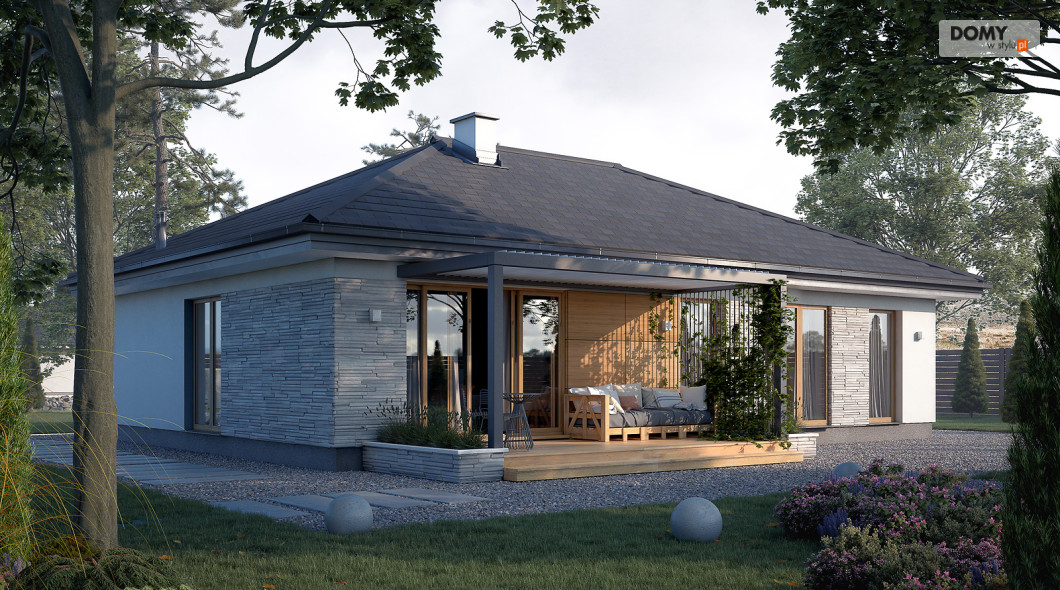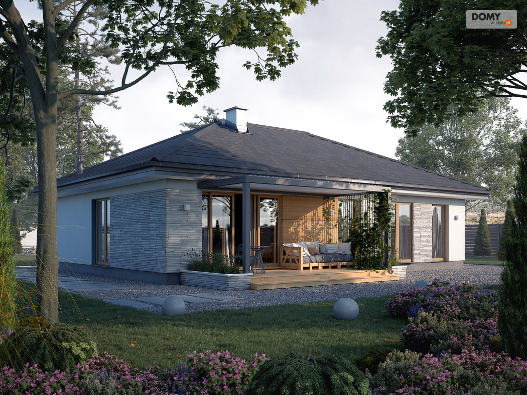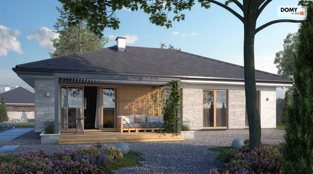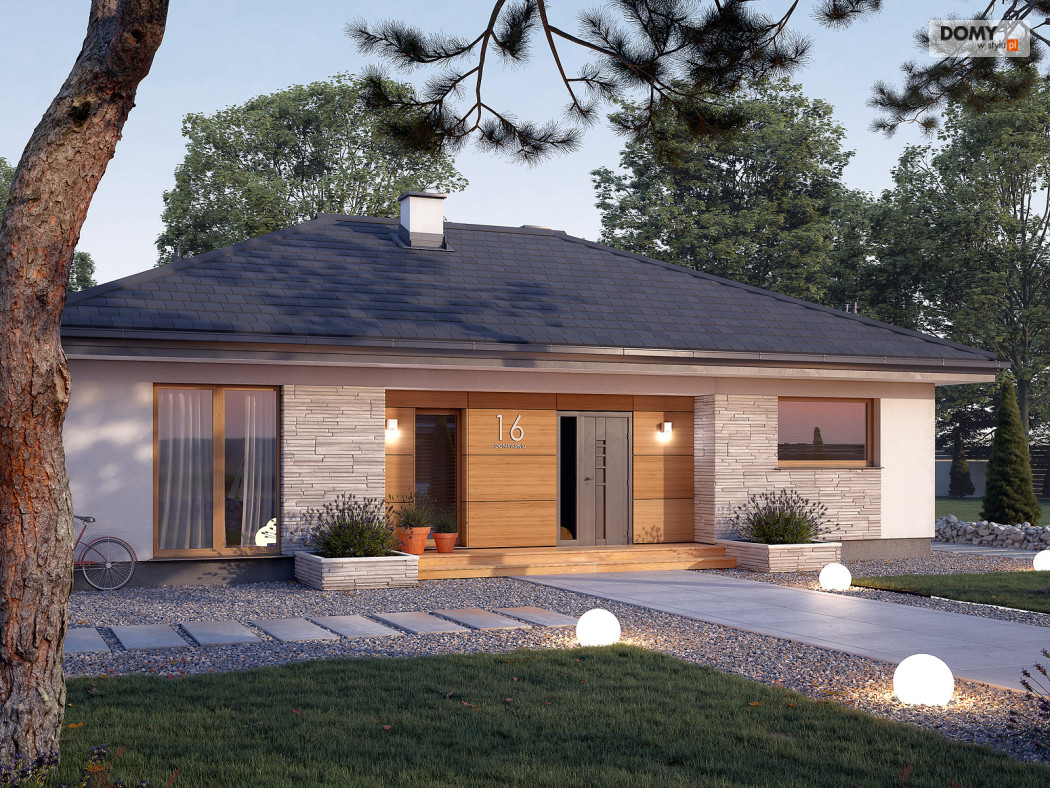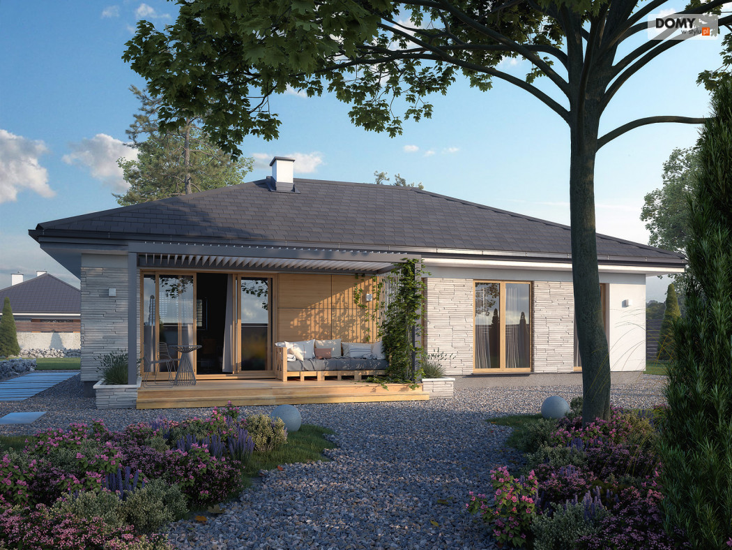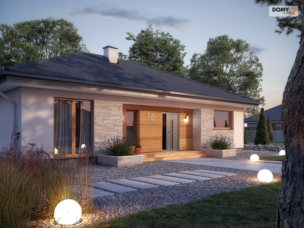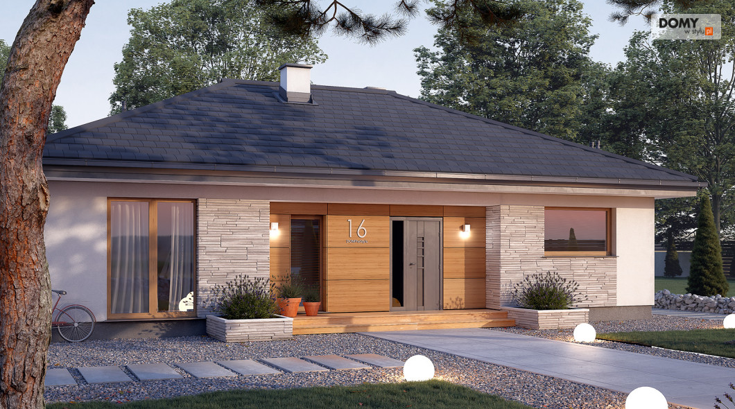 Awokado to projekt domu parterowego, spełniającego potrzeby 3-4 osobowej rodziny. Program użytkowy podzielono na 2 strefy. Część dzienną tworzą przestronny duży salon z jadalnią oraz otwarta kuchnia ze spiżarnią. W części nocnej zaprojektowano trzy sypialnie. Jedna z nich to sypialnia gospodarzy. Posiada ona prywatną łazienkę i garderobę, co jest dużą zaletą projektu. Dwie pozostałe sypialnie są przeznaczone dla dzieci lub gości. W części wspólnej znajdują się łazienka z przewidzianym miejscem na kocioł gazowy oraz pomieszczenie gospodarcze. Elewacyjne rozwiązania materiałowe nadają bryle domu spójny i nowoczesny charakter. Awokado jest projektem energooszczędnym, który idealnie wpisuje się na działki z wjazdem od północy.