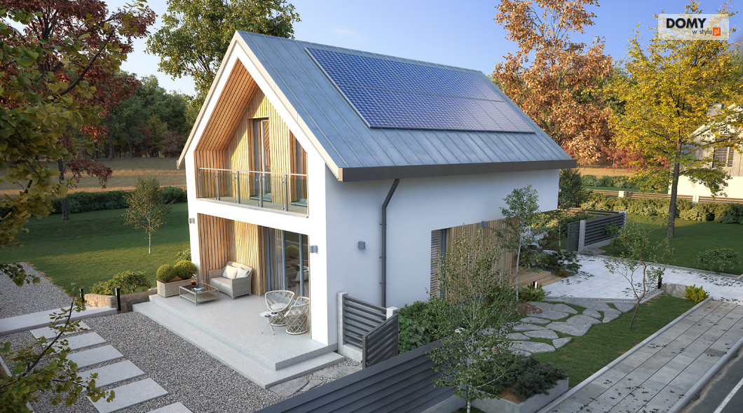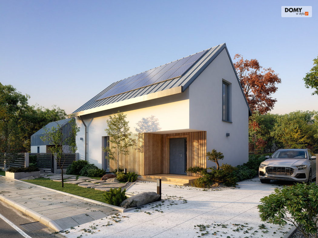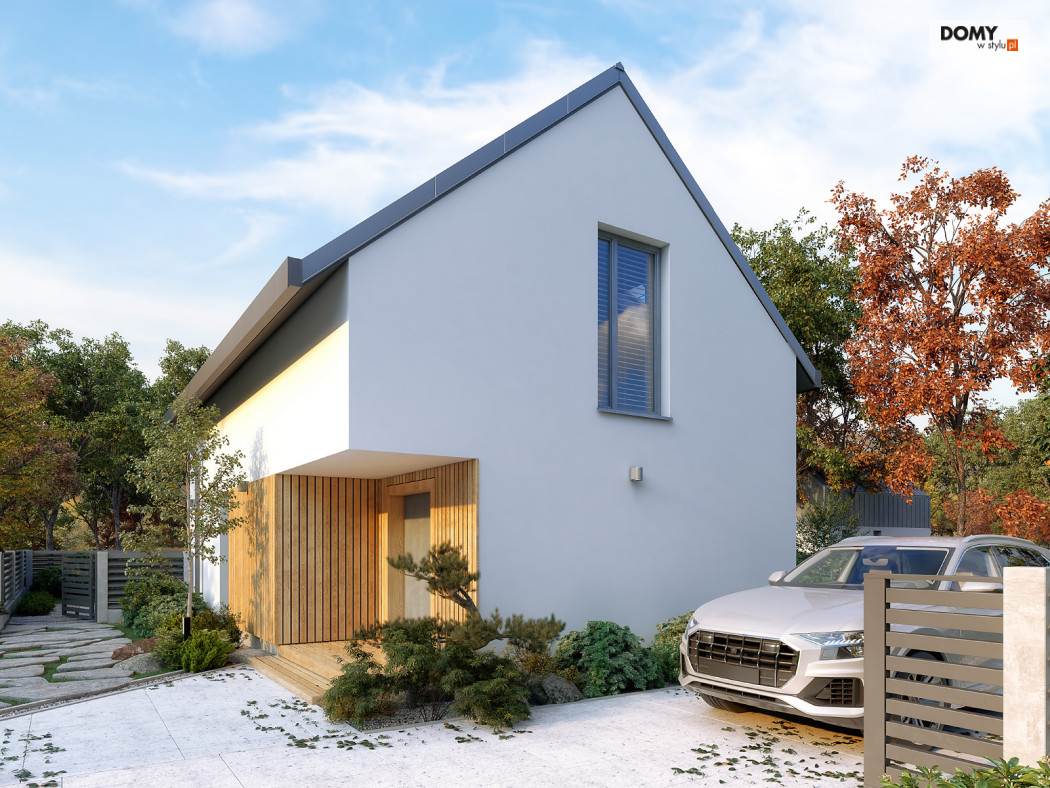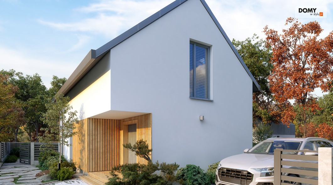 Porfir 2 to projekt domu z użytkowym poddaszem o powierzchni użytkowej 85 m2.  Projekt posiada prostą bryłę przykrytą dwuspadowym dachem.  Biała elewacja wzbogacona została drewnianą szalówką,  Na dachu pojawiła się blacha na rąbek stojący w szarym kolorze.  Projekt posiada otwartą część dzienną, którą tworzy: salon, jadalnia oraz kuchnia.  Program parteru uzupełnia łazienka, kotłownia oraz wiatrołap z pojemną szafą.  Na poddaszu zaprojektowano trzy sypialnie.  Największa sypialnia posiada własną garderobę, która podnosi komfort jej użytkowania.  Projekt posiada powierzchnię zabudowy mniejszą niż 70 m2, dlatego można go zrealizować na zgłoszenie zgodnie z programem Nowy Polski Ład.