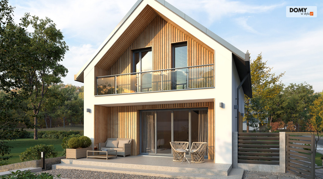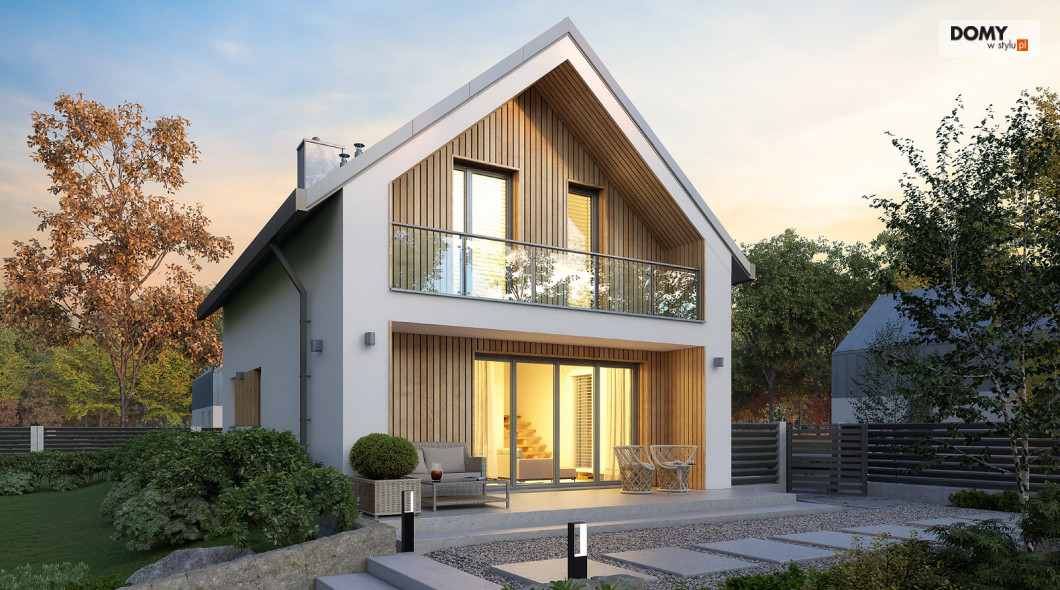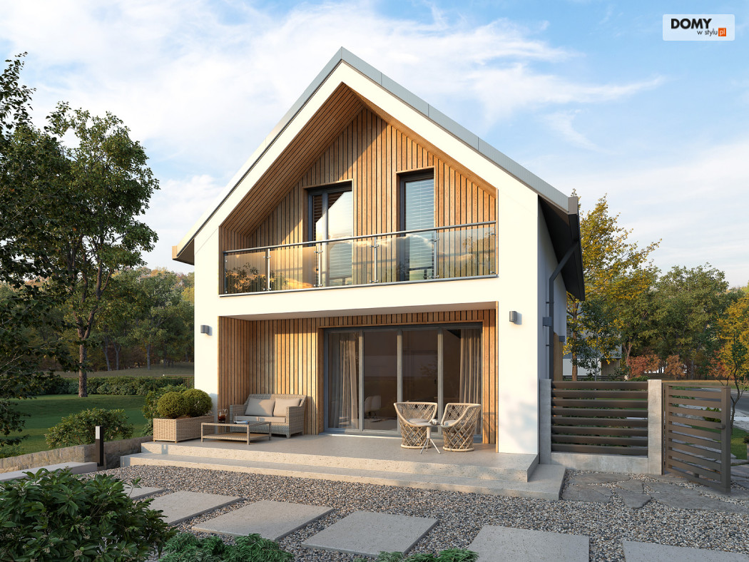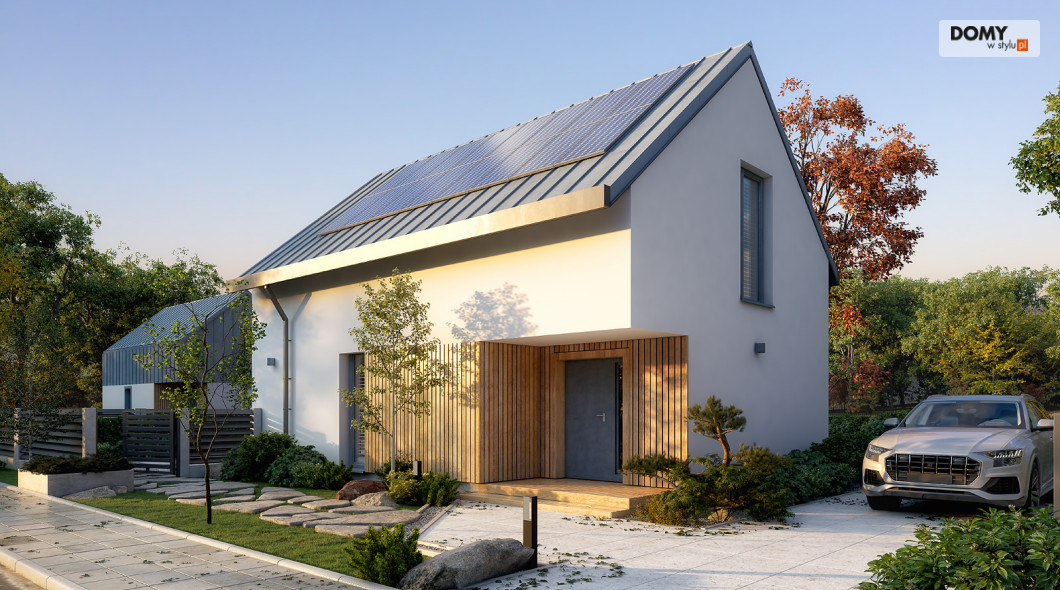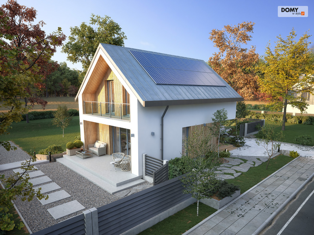 Porfir 2 to projekt domu z użytkowym poddaszem o powierzchni użytkowej 85 m2.  Projekt posiada prostą bryłę przykrytą dwuspadowym dachem.  Biała elewacja wzbogacona została drewnianą szalówką,  Na dachu pojawiła się blacha na rąbek stojący w szarym kolorze.  Projekt posiada otwartą część dzienną, którą tworzy: salon, jadalnia oraz kuchnia.  Program parteru uzupełnia łazienka, kotłownia oraz wiatrołap z pojemną szafą.  Na poddaszu zaprojektowano trzy sypialnie.  Największa sypialnia posiada własną garderobę, która podnosi komfort jej użytkowania.  Projekt posiada powierzchnię zabudowy mniejszą niż 70 m2, dlatego można go zrealizować na zgłoszenie zgodnie z programem Nowy Polski Ład.