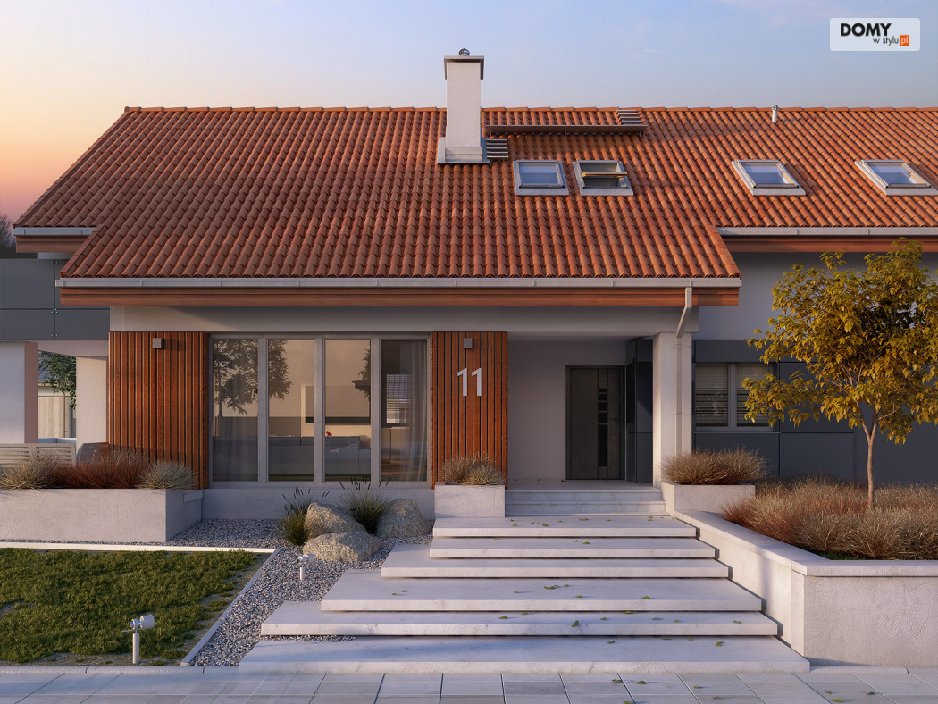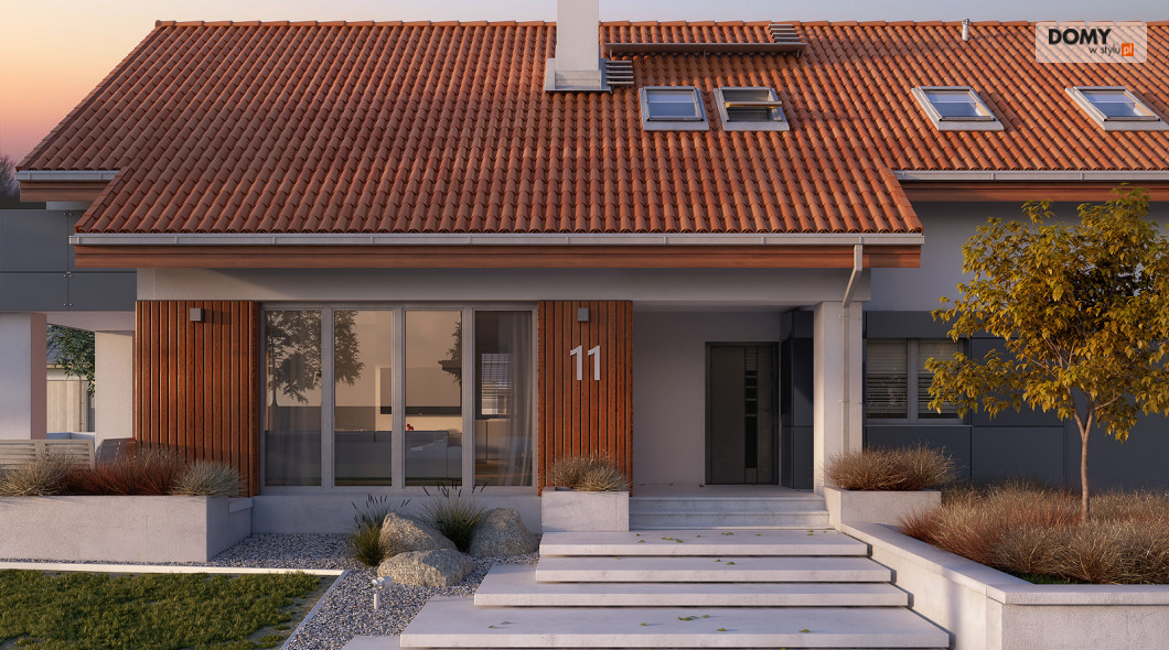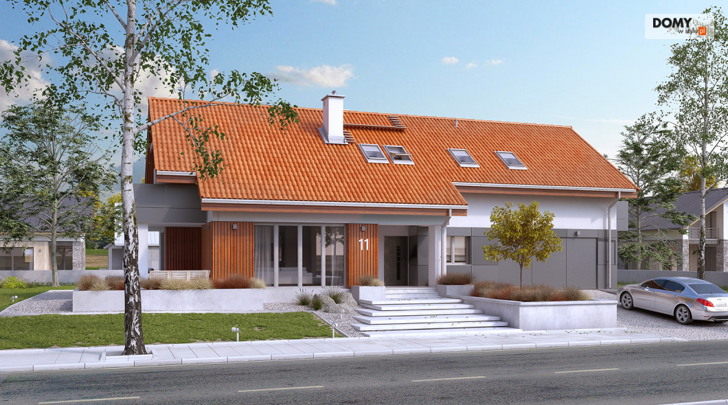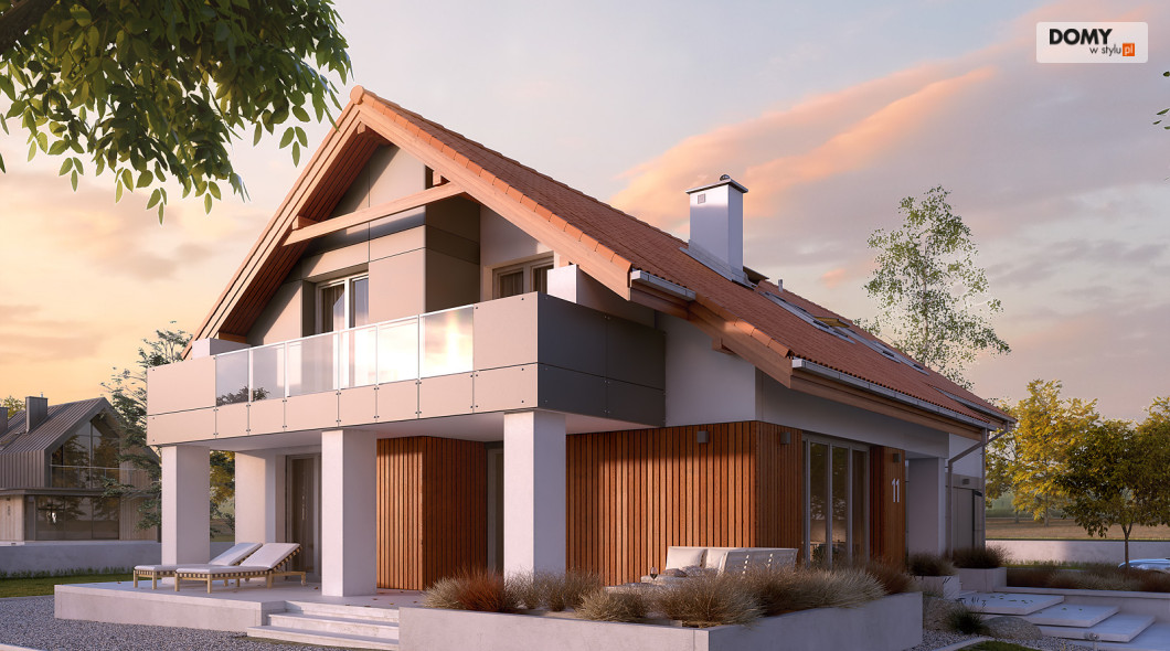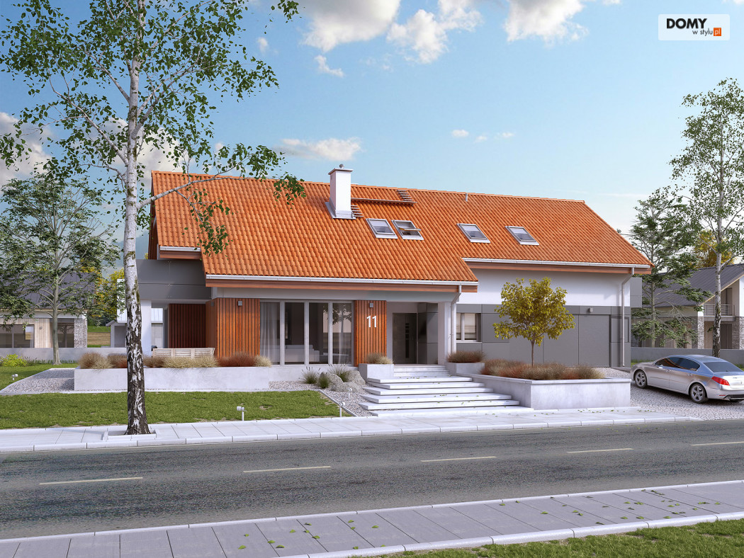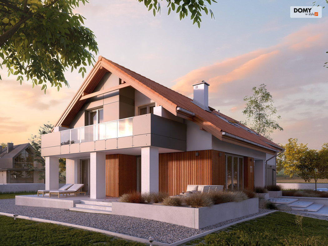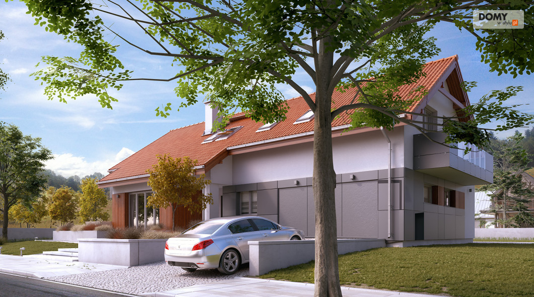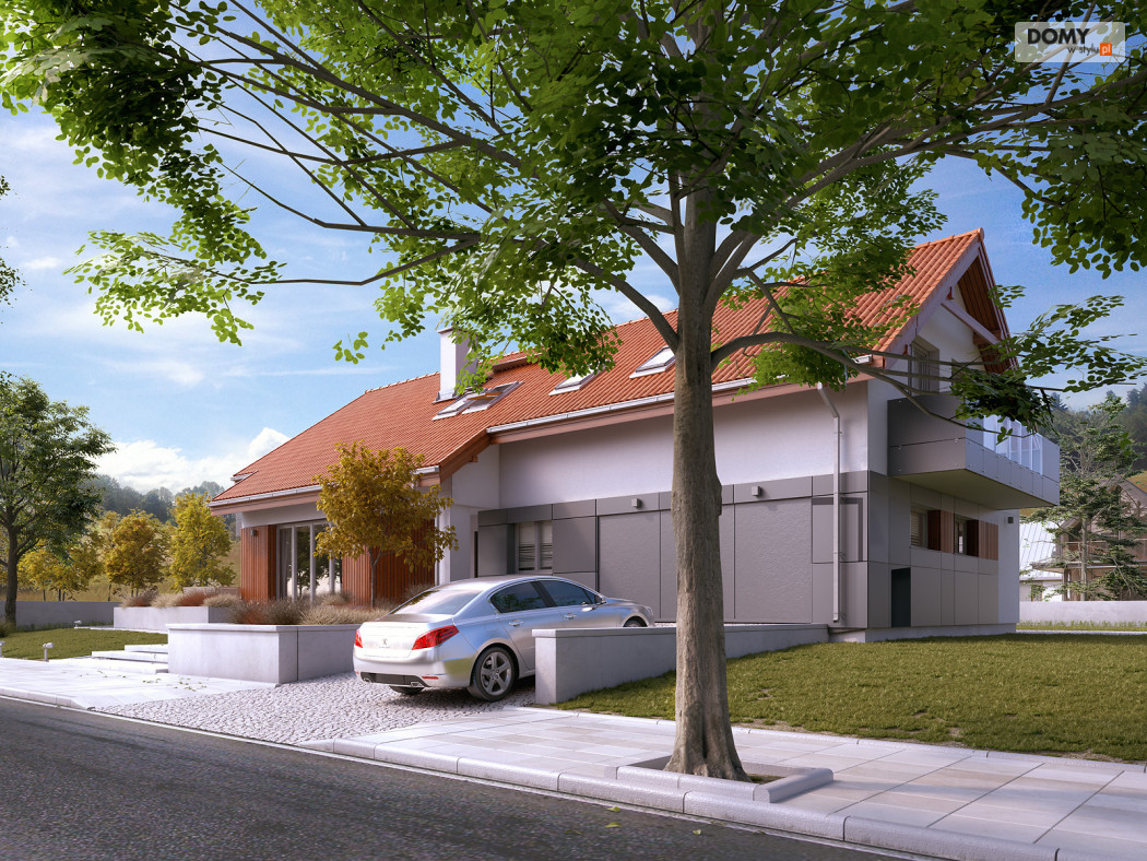 Projekt domu Karmin jest propozycją nowoczesnego, przestronnego domu z użytkowym poddaszem, przeznaczonego do lokalizacji na działce z wjazdem od południa. Rozbudowany program funkcjonalny domu został podzielony na trzy strefy użytkowe. Na parterze znajduje się strefa dzienna, na którą składa się kuchnia ze spiżarnią, salon, jadalnia, garderoba, łazienka oraz dodatkowy pokój z przeznaczeniem na gabinet lub pracownię. Strefa nocna została zlokalizowana na poddaszu i składa się z czterech sypialni, garderoby oraz rodzinnej łazienki. Dwie mniejsze sypialnie posiadają wyjście na wspólny balkon, zaś z głównej sypialni znajduje się dostęp do rozległego tarasu, który stanowi jednocześnie zadaszenie tarasu na parterze. Główna sypialnia gospodarzy posiada dodatkowo wydzieloną garderobę oraz łazienkę. Dla lepszego doświetlenia przestrzeni poddasza w projekcie przewidziano antresolę nad salonem. W bryle budynku zaprojektowano także wydzieloną strefę gospodarczą składającą się z dwustanowiskowego garażu oraz kotłowni z towarzyszącym jej pomieszczeniem przeznaczonym na skład opału lub warsztat. Zastosowanie płyt włókno-cementowych, szalówki, oraz białego tynku nadaje bryle domu współczesnego charakteru.