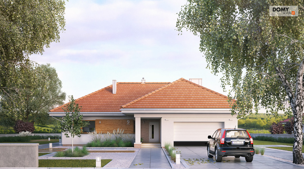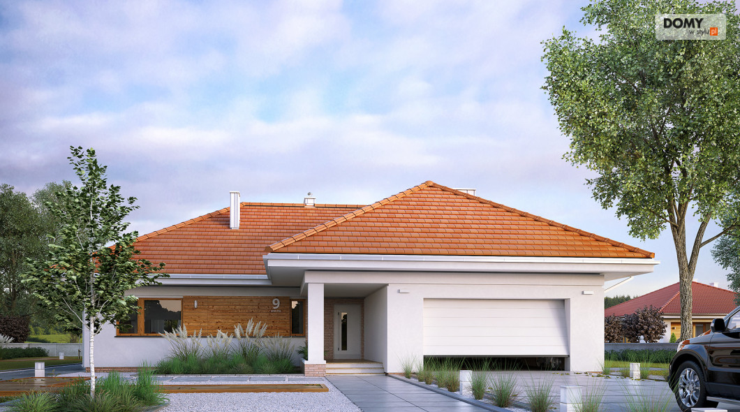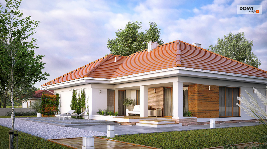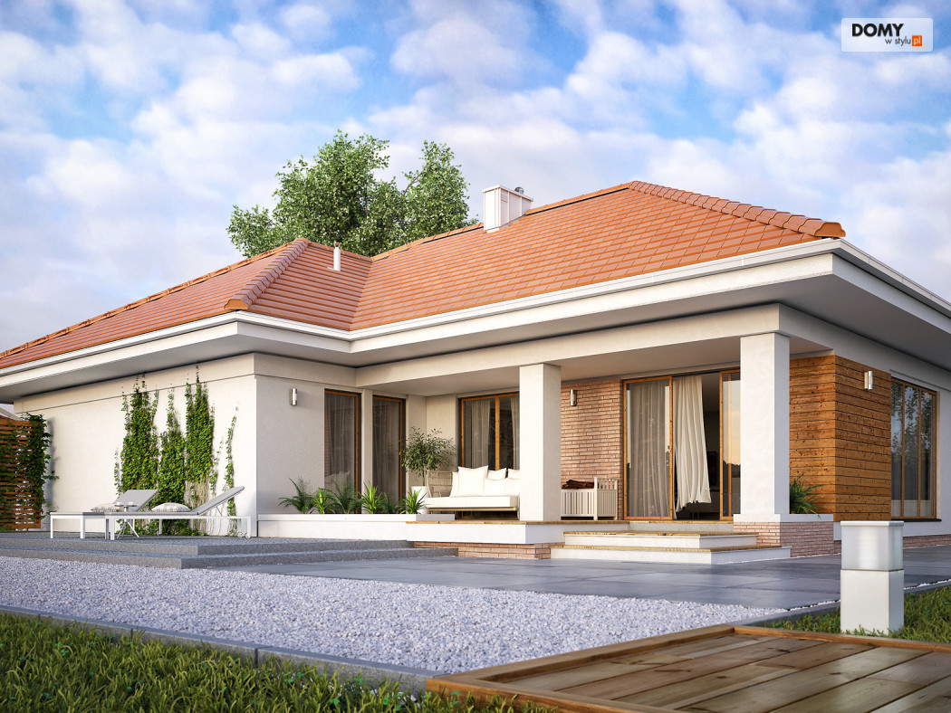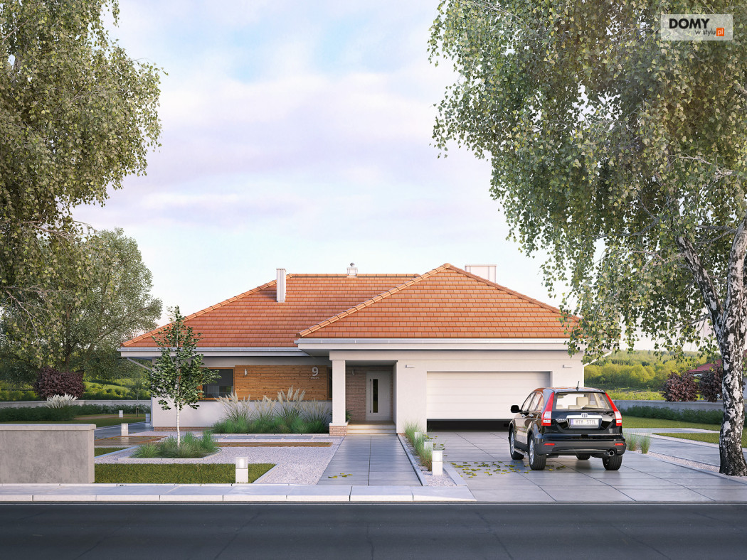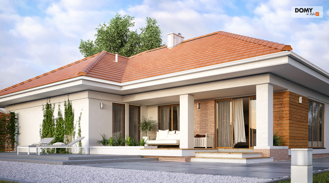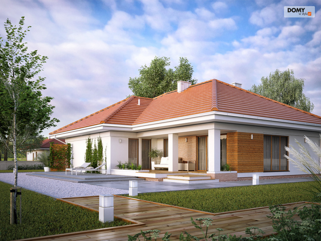 Parterowy budynek dla 4-osobowej rodziny. Przejrzysty układ funkcjonalny z podziałem na przestronną część dzienną z otwartą kuchnią i przytulną strefę prywatną. Garderoba, spiżarnia i pomieszczenie gospodarcze zapewniają zawsze mile widzianą, dodatkową przestrzeń magazynową. Komfort użytkowania podnosi dodatkowa łazienka i garderoba dostępne z sypialni. Zadaszony taras pozwala na przebywanie na świeżym powietrzu niezależnie od warunków atmosferycznych.