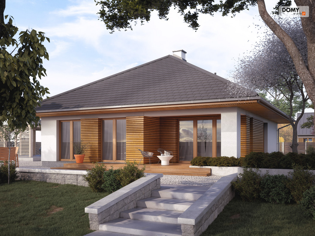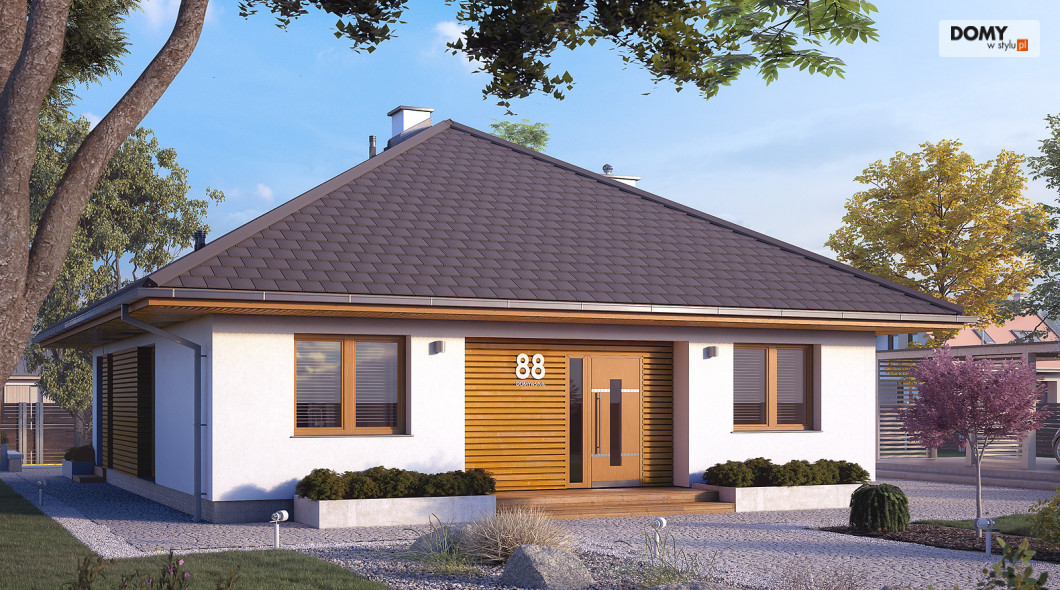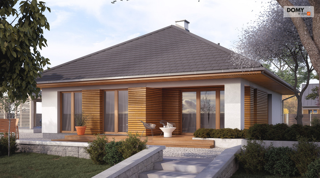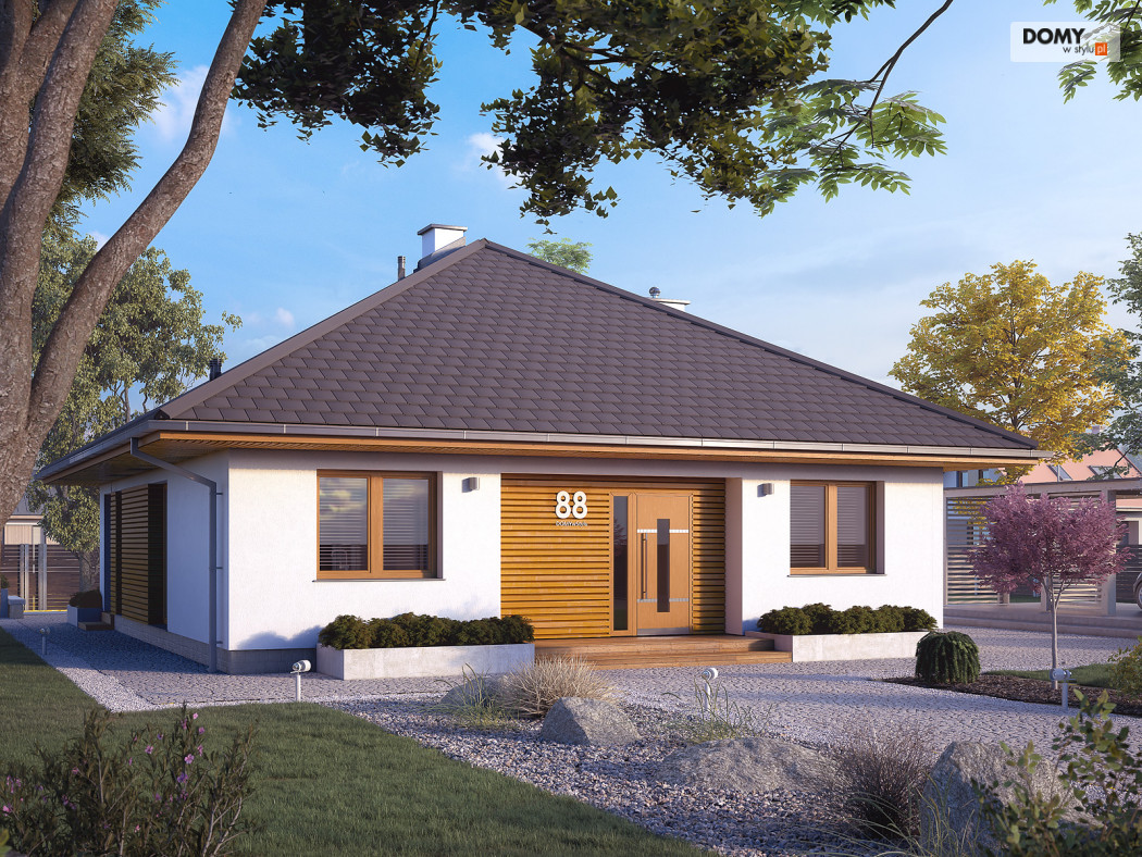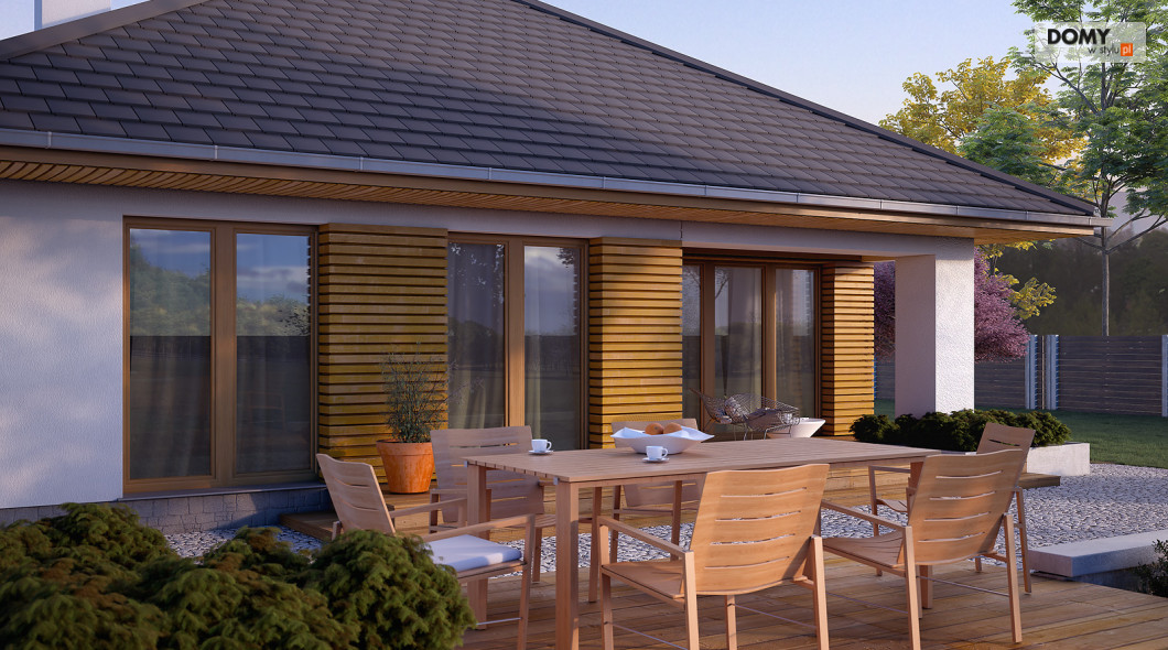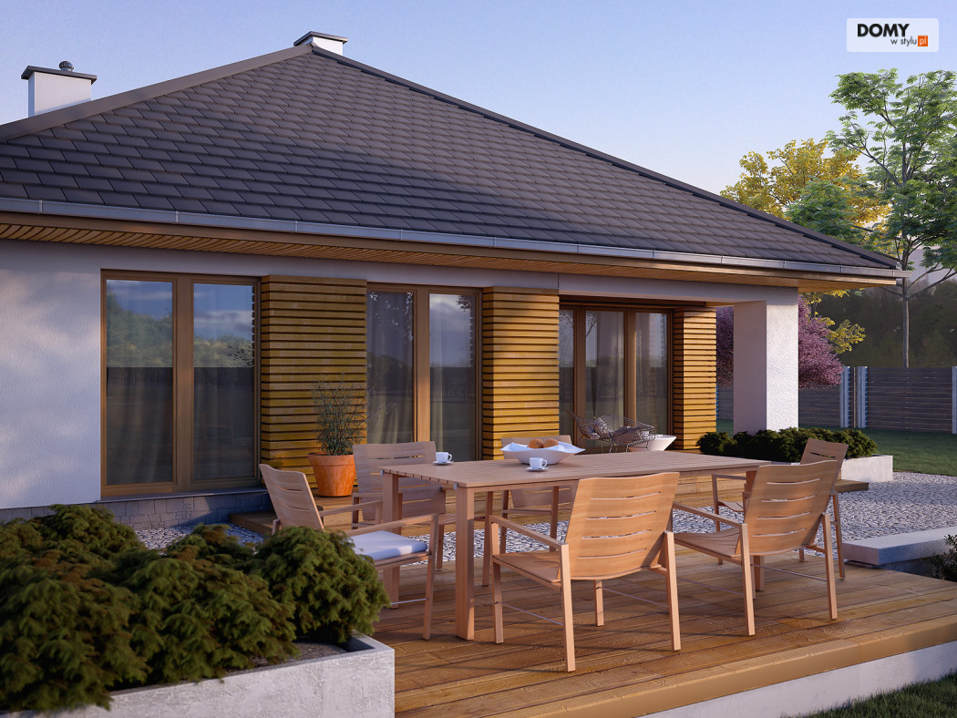 Elka 5 to projekt domu parterowego przeznaczony dla 3-4 osobowej rodziny. W części dziennej znajduje się kuchnia ze spiżarnią oraz przestronny salon z miejscem na jadalnię. W części nocnej znajdują się trzy sypialnie, w tym jedna wydzielona z myślą o sypialni rodziców. Pozostałe pomieszczenia wspólne to wc, łazienka, pralnia i kotłownia. Zaletą projektu Elka 5 jest zadaszony taras z miejscem na odpoczynek i relaks. Praktycznym rozwiązaniem jest także usytuowanie dużej szafy w wiatrołapie.