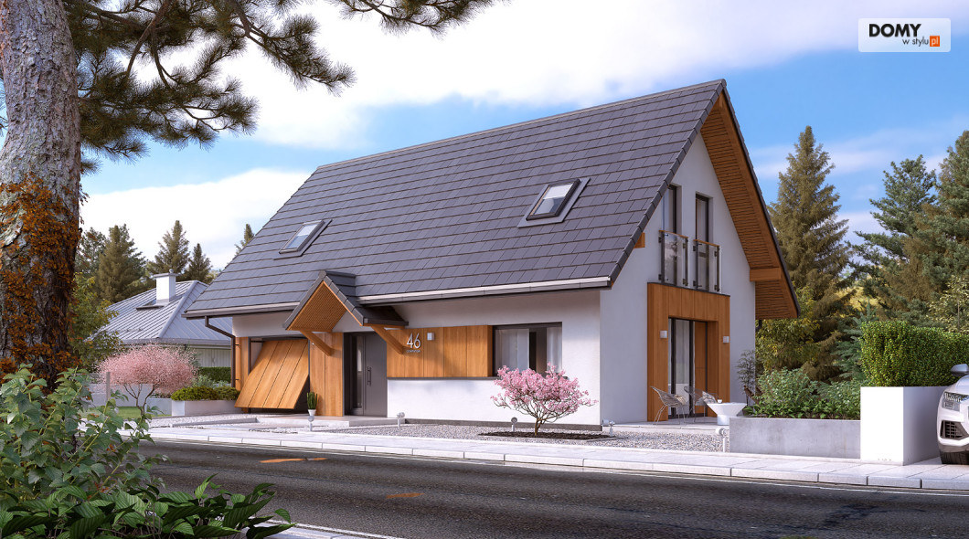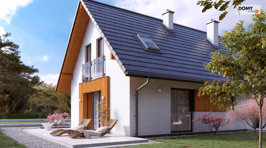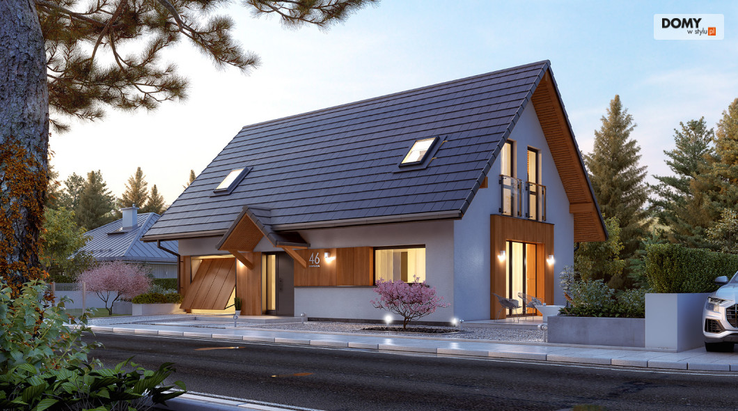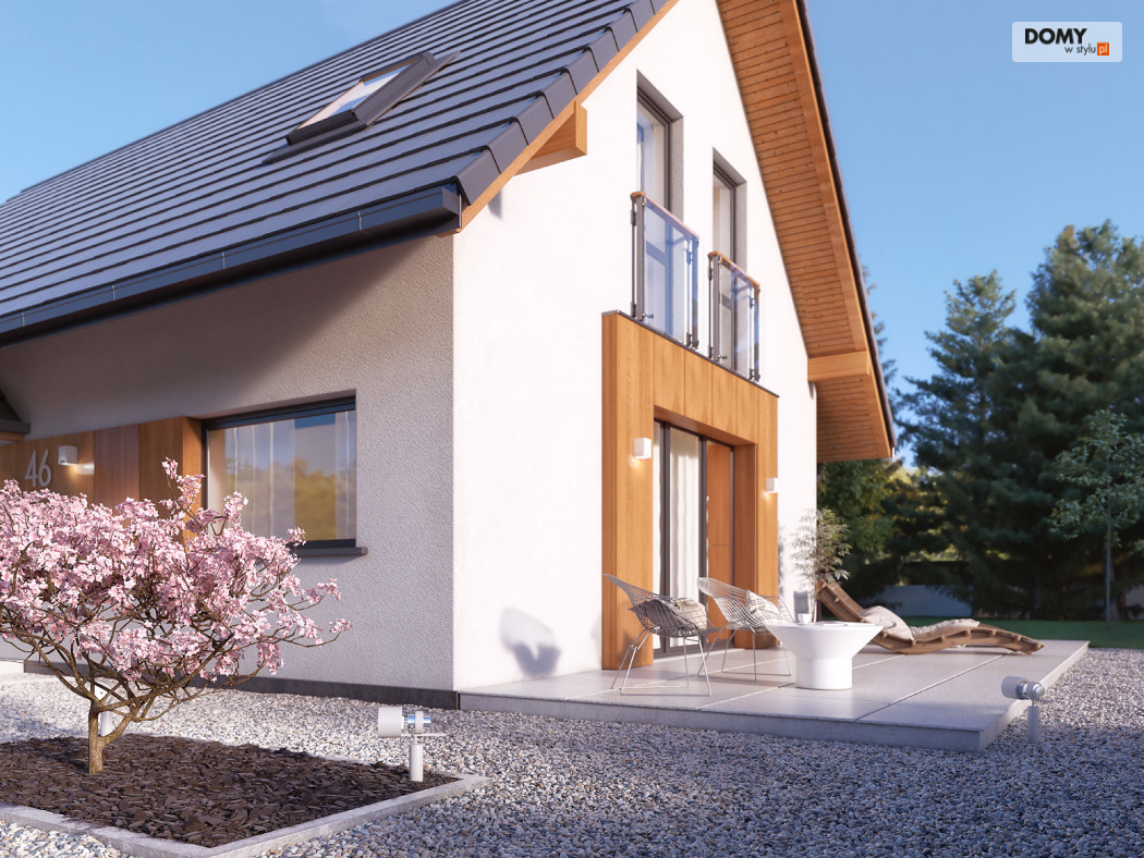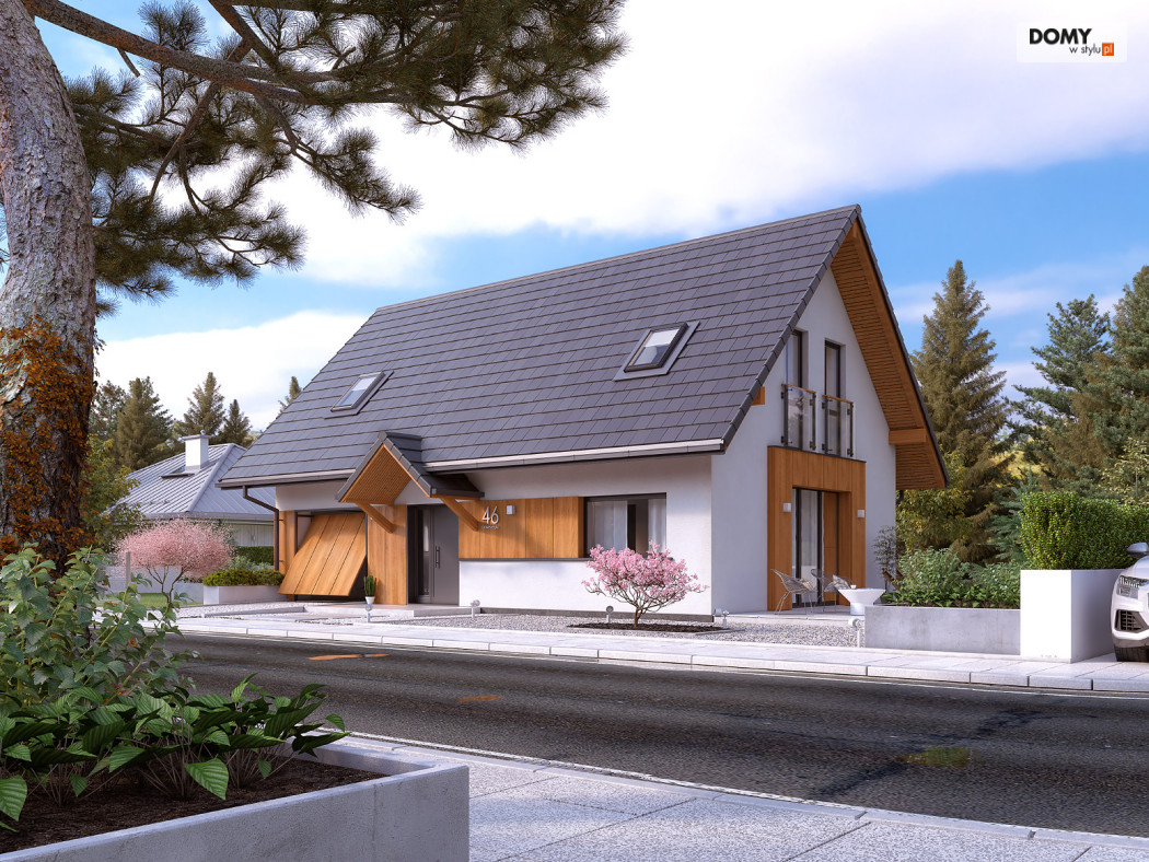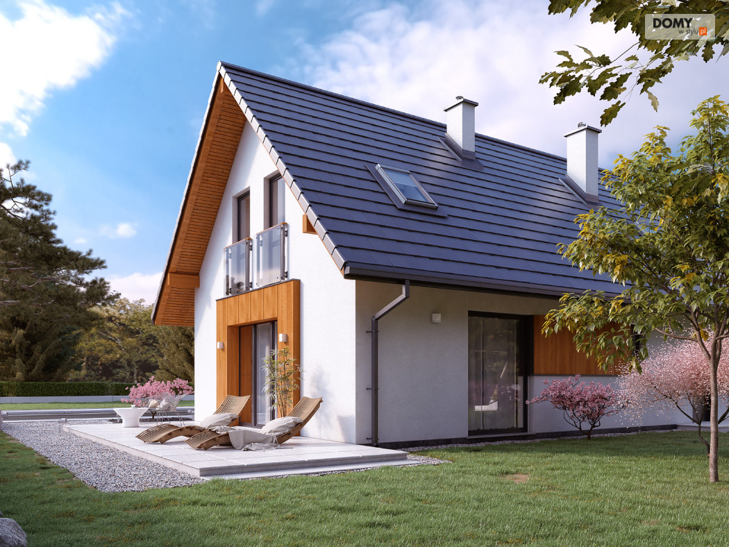 Zwarty energooszczędny dom o prostej bryle. Na poddaszu zaprojektowano przestronne trzy sypialnie z dużą łazienką i pomieszczeniem gospodarczym. Na parterze funkcjonalnie rozplanowano pomieszczenia dzienne i pomieszczenia pomocnicze. Dobrym rozwiązaniem jest połączenie domu z garażem poprzez śluzę, jaką jest wiatrołap. W kuchni znajduje się spiżarnia.