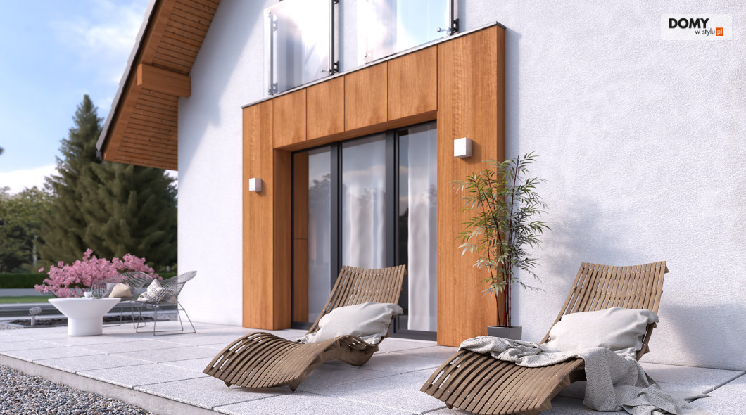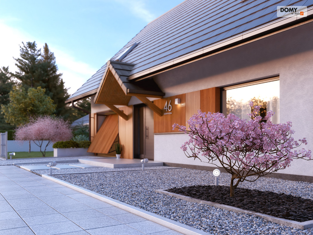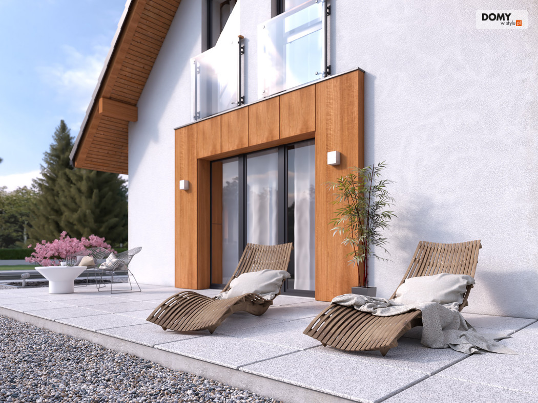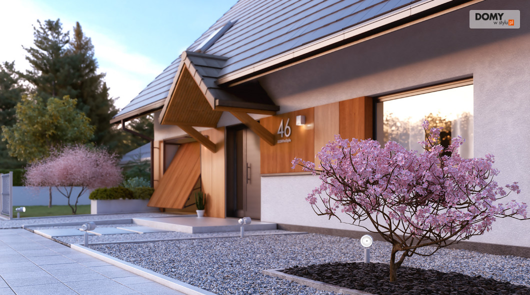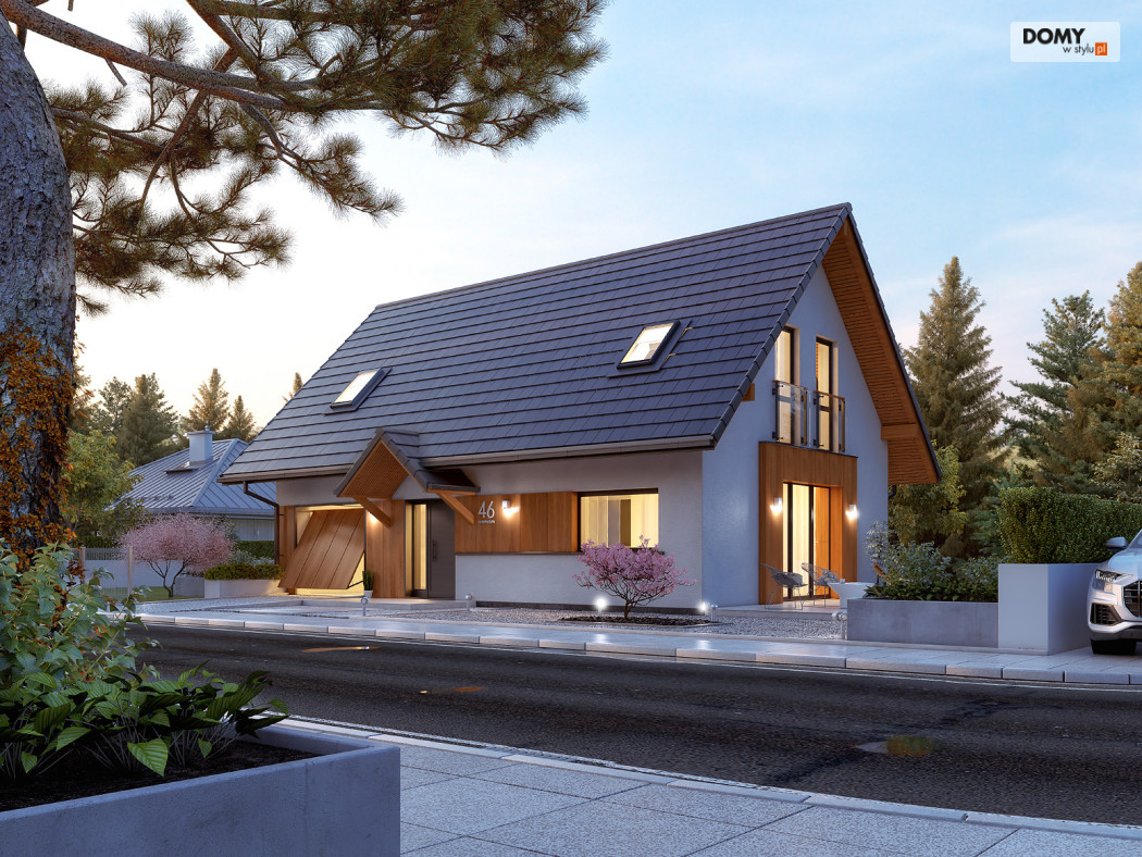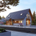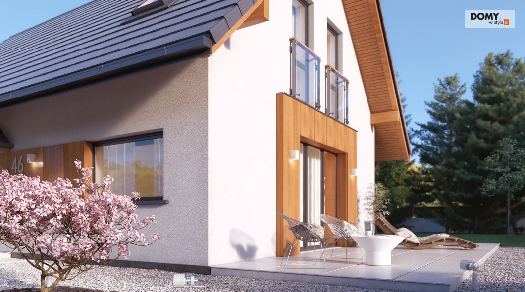 Zwarty energooszczędny dom o prostej bryle. Na poddaszu zaprojektowano przestronne trzy sypialnie z dużą łazienką i pomieszczeniem gospodarczym. Na parterze funkcjonalnie rozplanowano pomieszczenia dzienne i pomieszczenia pomocnicze. Dobrym rozwiązaniem jest połączenie domu z garażem poprzez śluzę, jaką jest wiatrołap. W kuchni znajduje się spiżarnia.