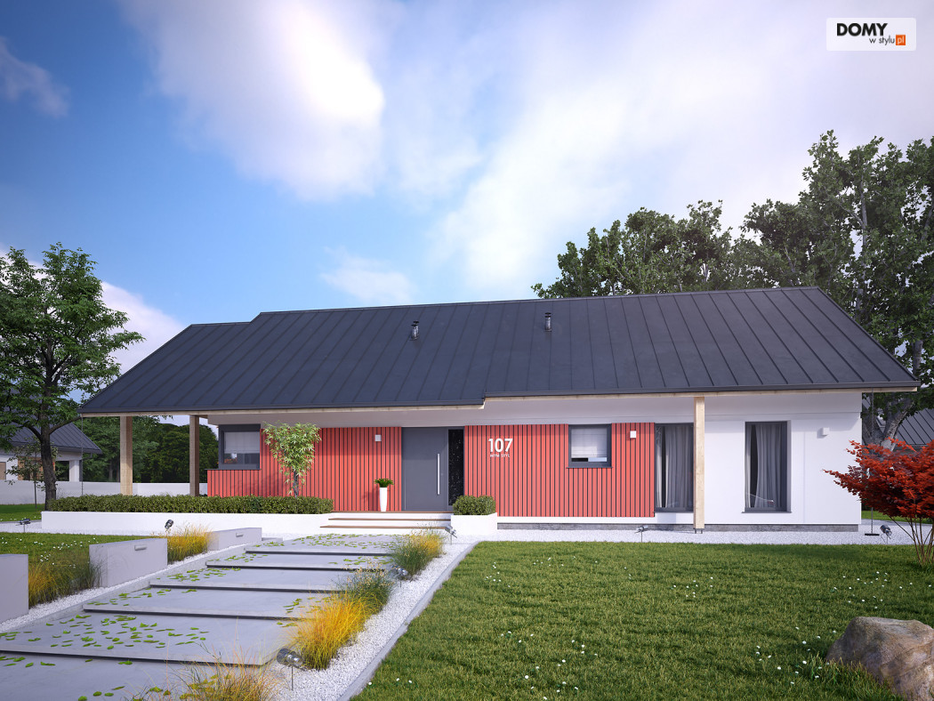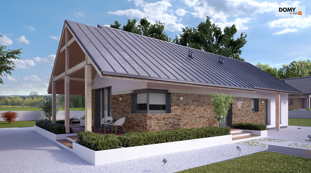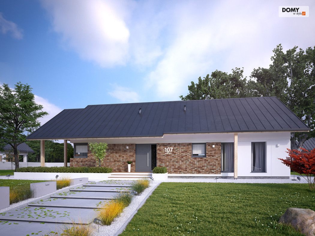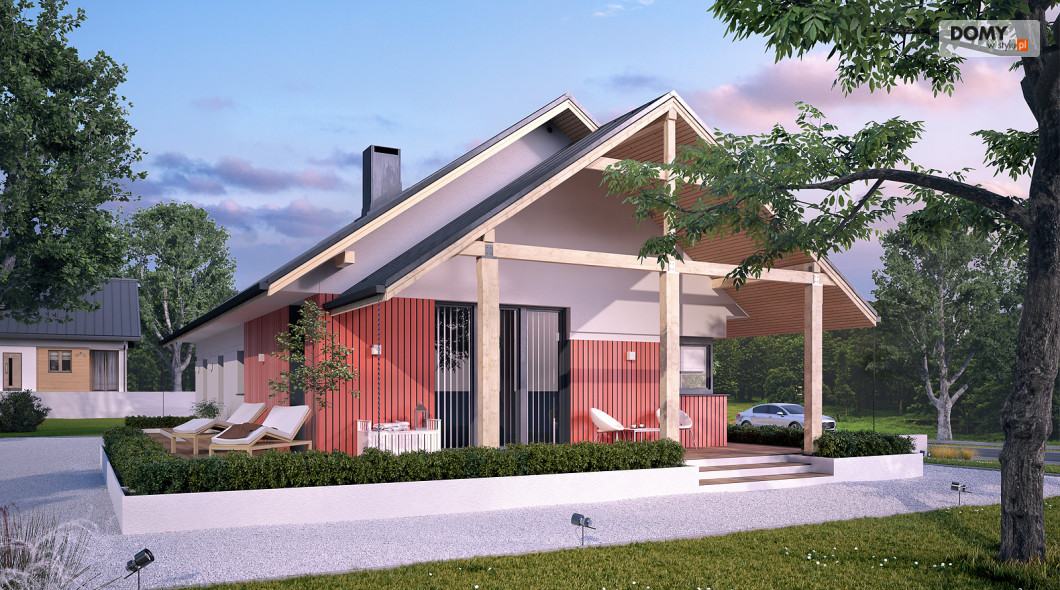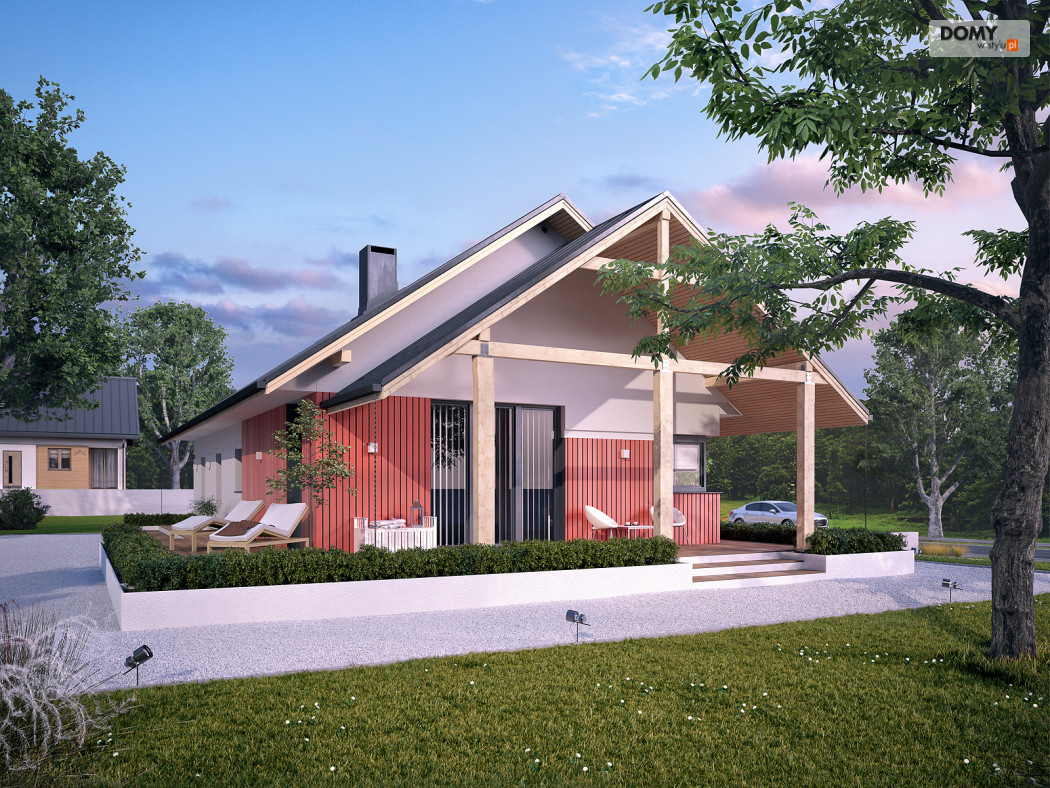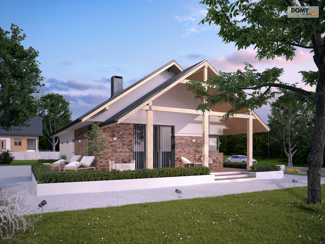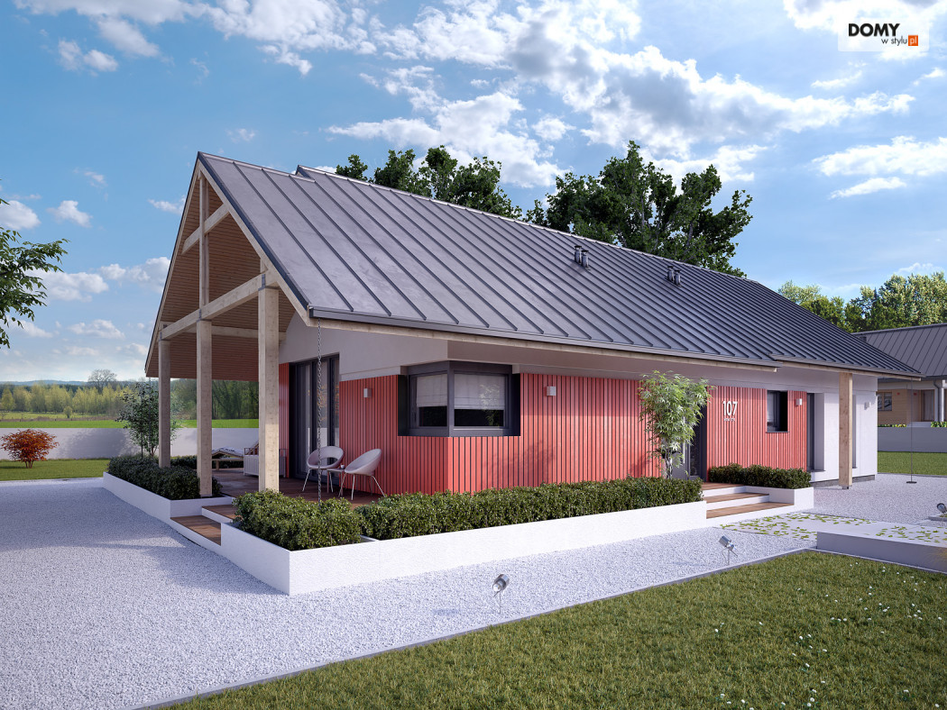 Parterowy budynek mieszkalny jednorodzinny o zwartej bryle, przykryty dachem dwuspadowym. Układ funkcjonalny z wyraźnym podziałem na część dzienną i nocną. Salon posiada wysoki sufit i duże przeszklenie stanowiące wyjście na zadaszony taras. W domu znajduje się kuchnia z jadalną połączona z salonem, sypialnia, dwa pokoje, dwie łazienki, garderoba oraz kotłownia na ogrzewanie gazowe z możliwością adaptacji na paliwo stałe. Dom został zaprojektowany w nowoczesnym stylu. Prezentowany projekt po zbliźniaczeniu będzie się idealnie nadawał do zabudowy szeregowej.