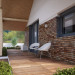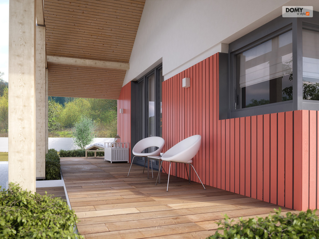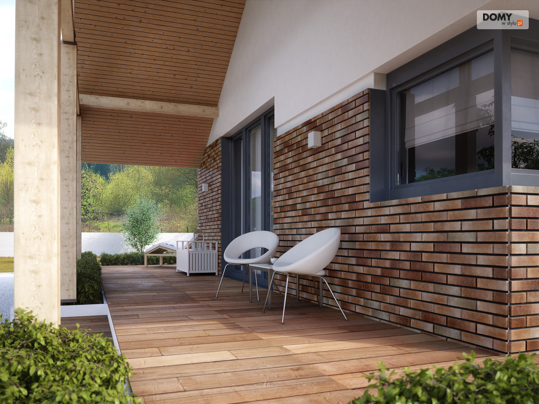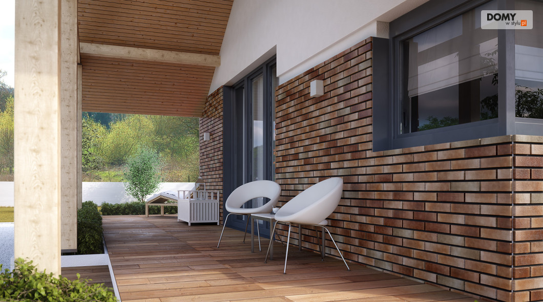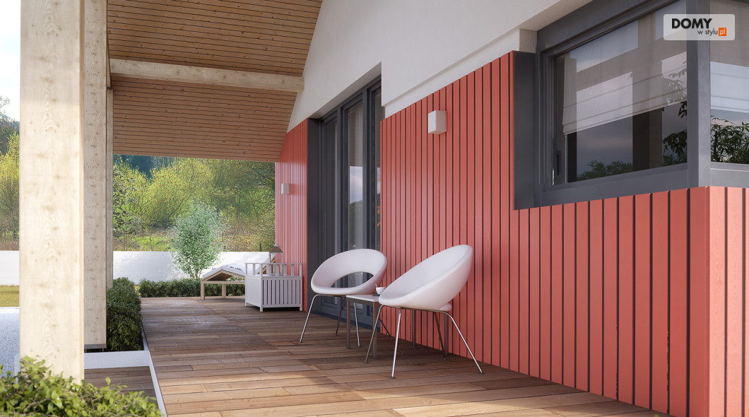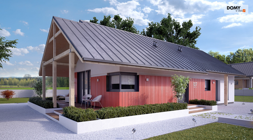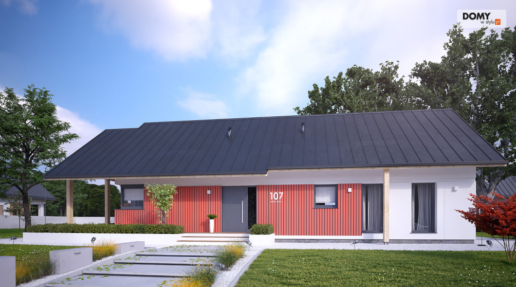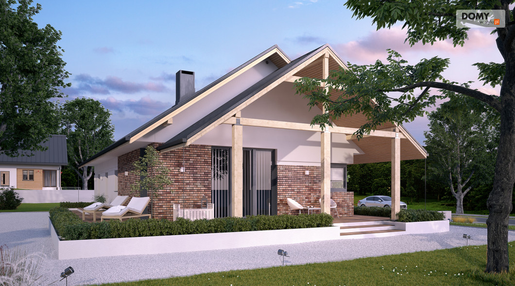 Parterowy budynek mieszkalny jednorodzinny o zwartej bryle, przykryty dachem dwuspadowym. Układ funkcjonalny z wyraźnym podziałem na część dzienną i nocną. Salon posiada wysoki sufit i duże przeszklenie stanowiące wyjście na zadaszony taras. W domu znajduje się kuchnia z jadalną połączona z salonem, sypialnia, dwa pokoje, dwie łazienki, garderoba oraz kotłownia na ogrzewanie gazowe z możliwością adaptacji na paliwo stałe. Dom został zaprojektowany w nowoczesnym stylu. Prezentowany projekt po zbliźniaczeniu będzie się idealnie nadawał do zabudowy szeregowej.