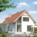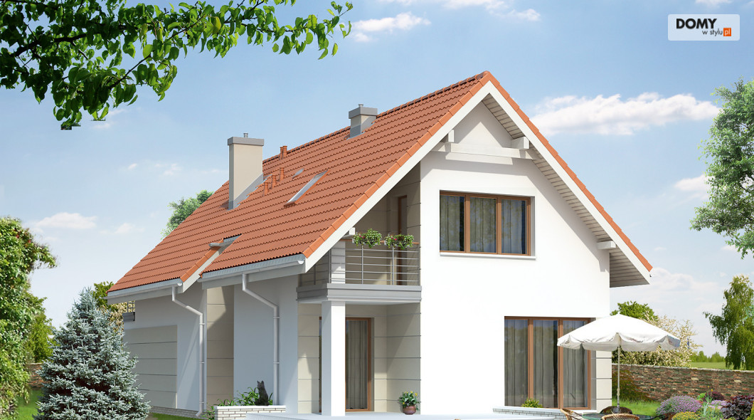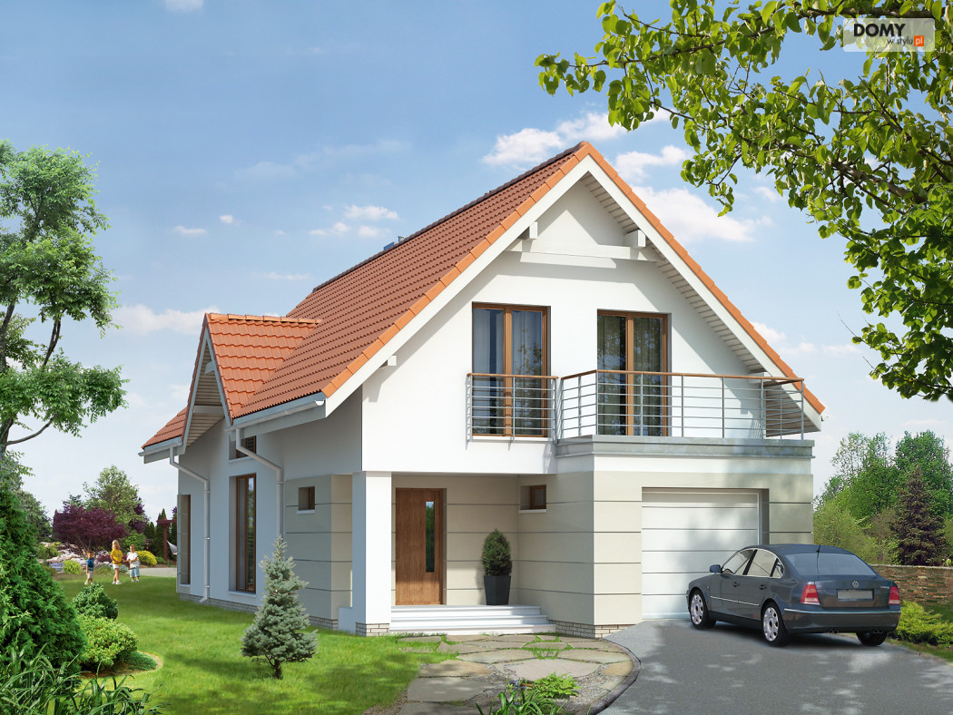Dom na wąską działkę, z garażem od frontu. Na parterze zaprojektowano część dzienną z salonem, kuchnią i jadalnią. Na poddaszu znajdują się trzy sypialnie, garderoba i łazienka z pralnią.