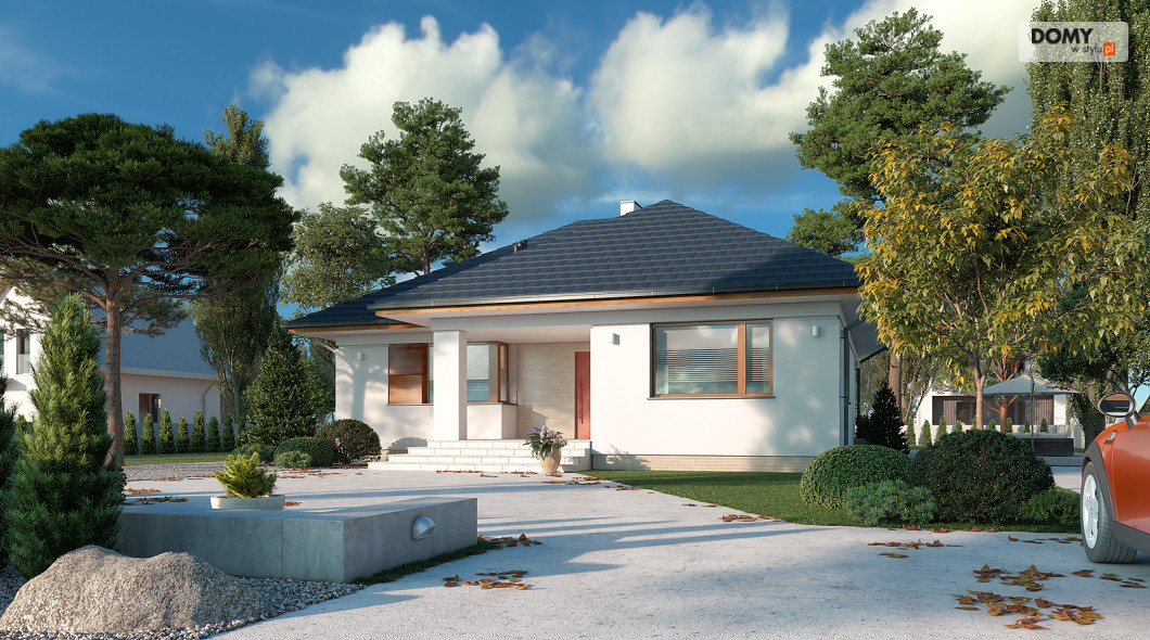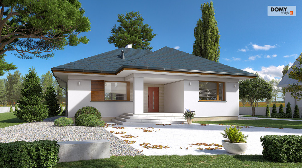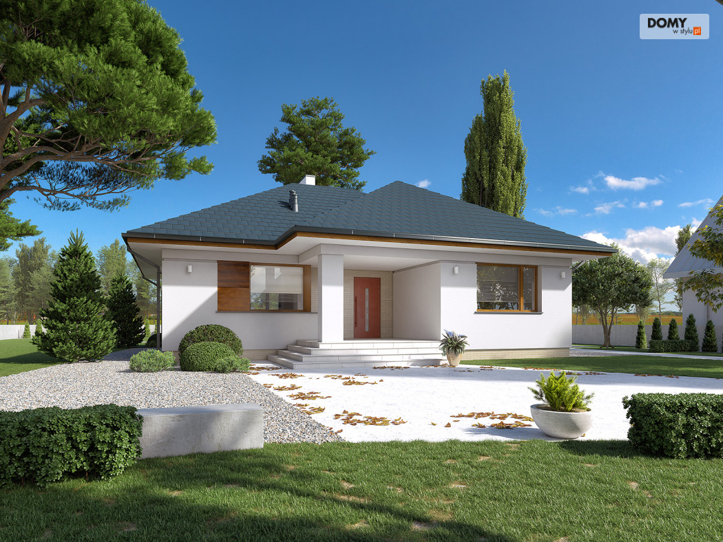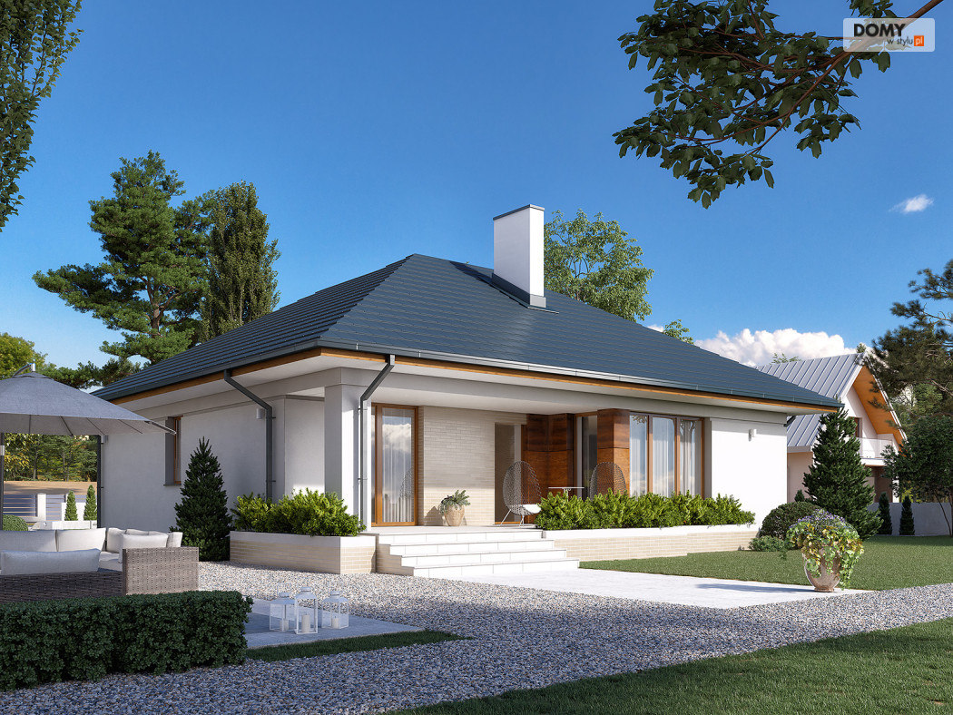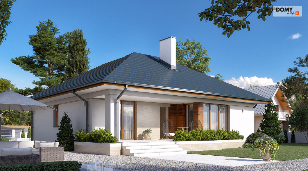 Jednorodzinny budynek mieszkalny, parterowy, niepodpiwniczony, przeznaczony dla 3 – 4-osobowej rodziny. Atutem projektu jest duży zadaszony taras oraz kotłownia na każdy rodzaj paliwa. W części dziennej zaprojektowano salon z jadalnią oraz kuchnię ze spiżarnią. W części nocnej umieszczono dwie sypialnie oraz łazienkę.