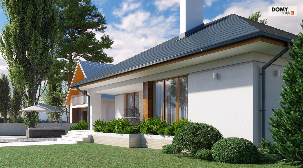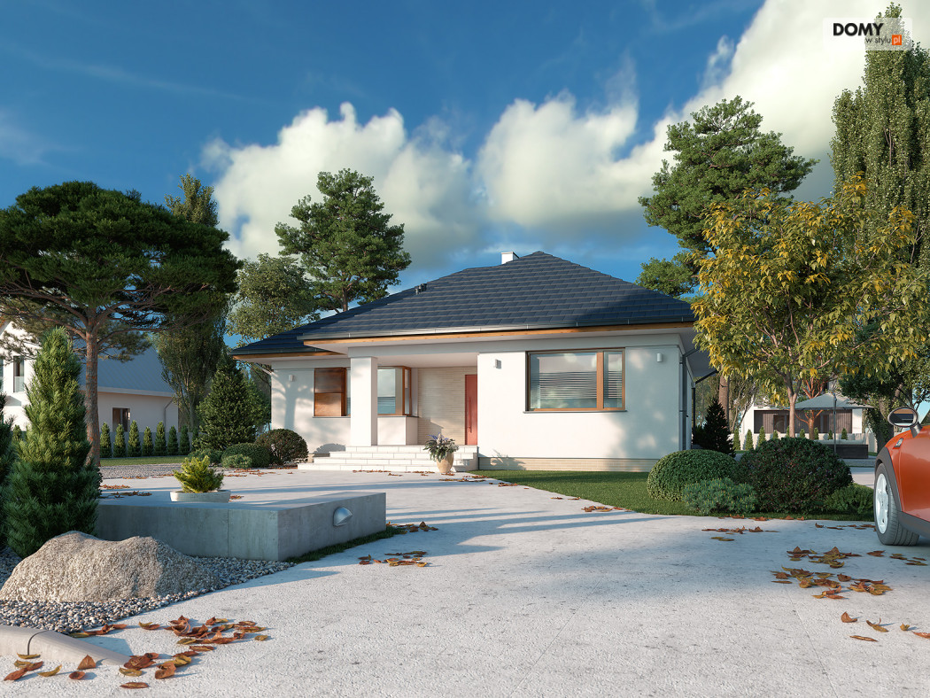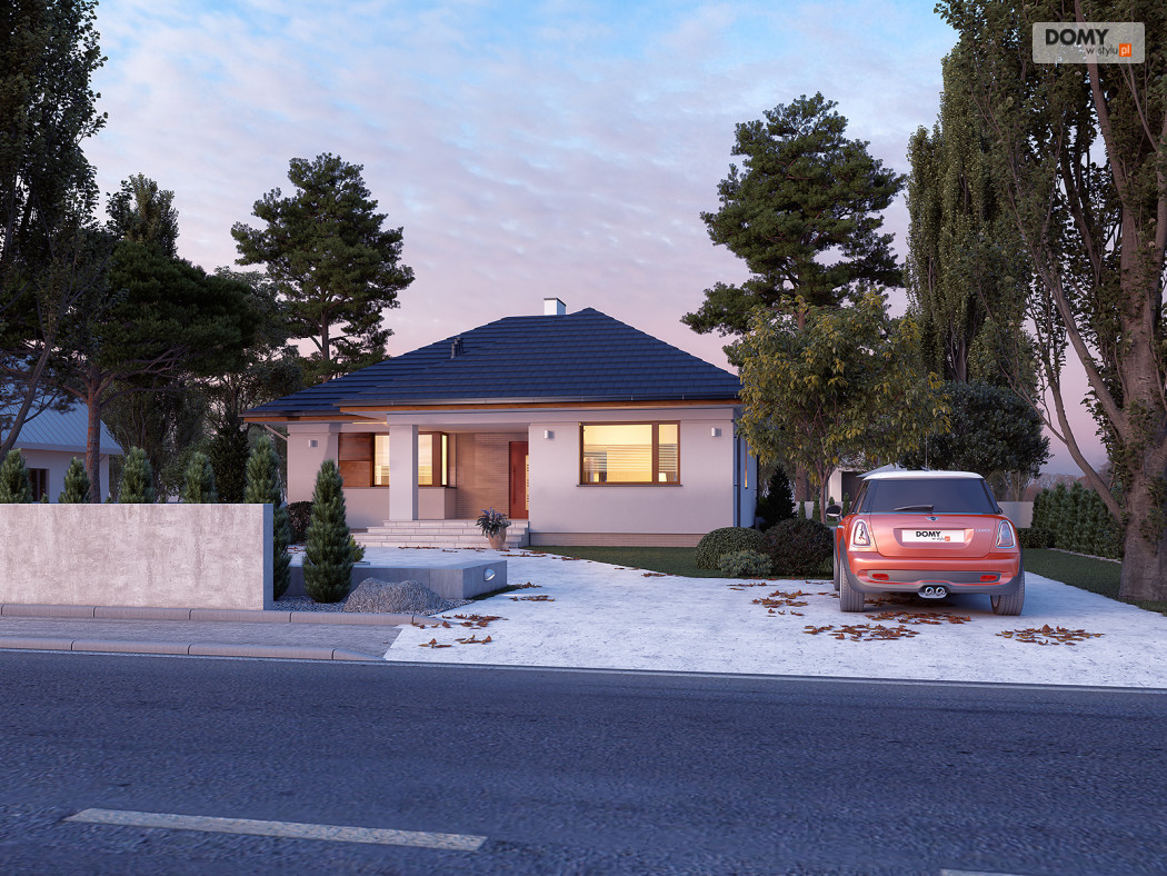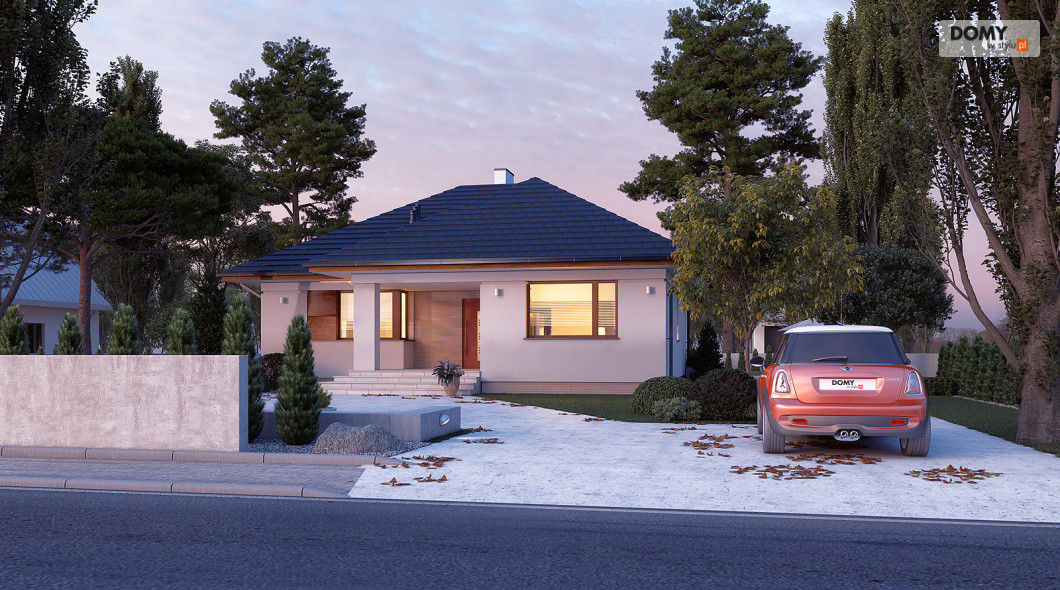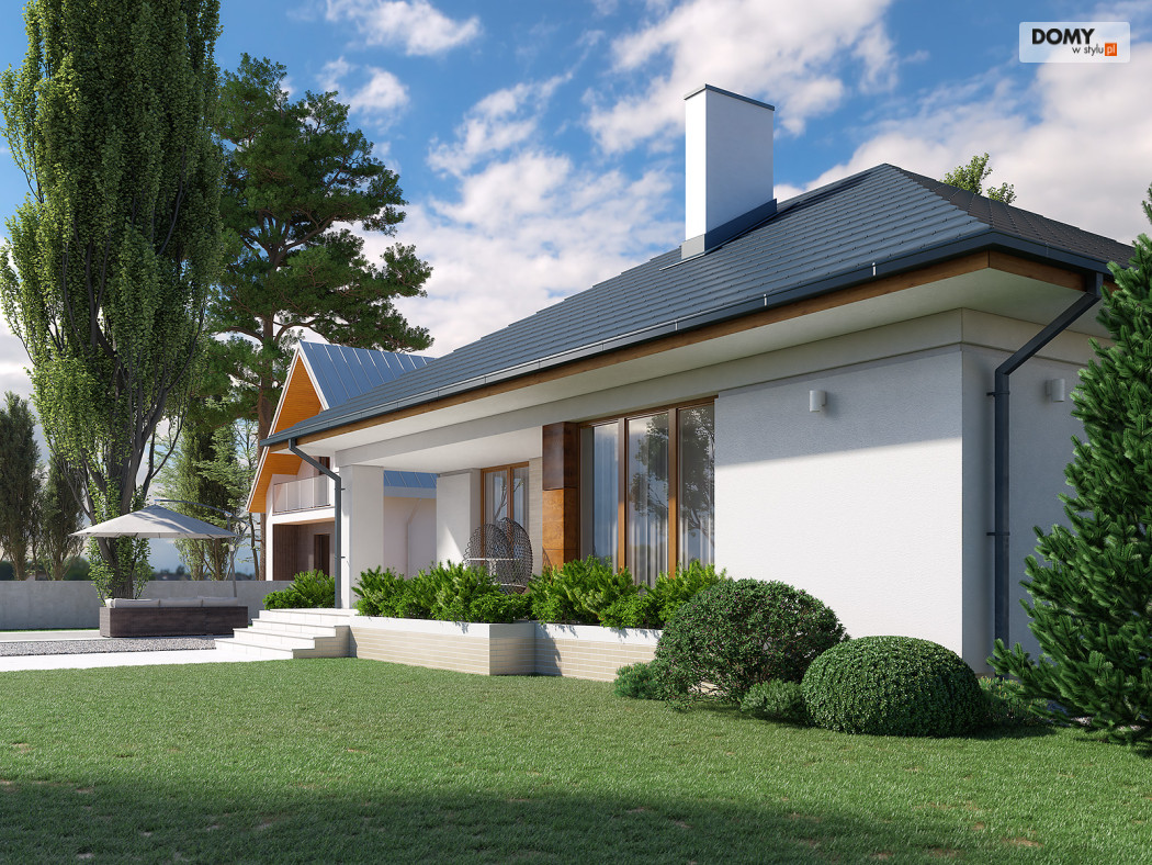Jednorodzinny budynek mieszkalny, parterowy, niepodpiwniczony, przeznaczony dla 3 – 4-osobowej rodziny. Atutem projektu jest duży zadaszony taras oraz kotłownia na każdy rodzaj paliwa. W części dziennej zaprojektowano salon z jadalnią oraz kuchnię ze spiżarnią. W części nocnej umieszczono dwie sypialnie oraz łazienkę.