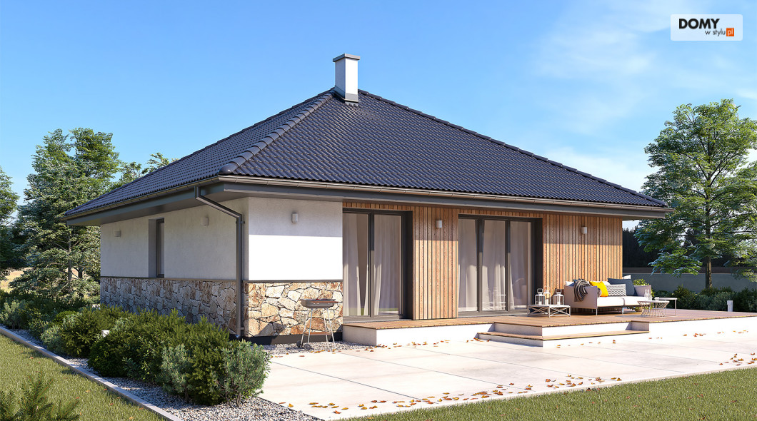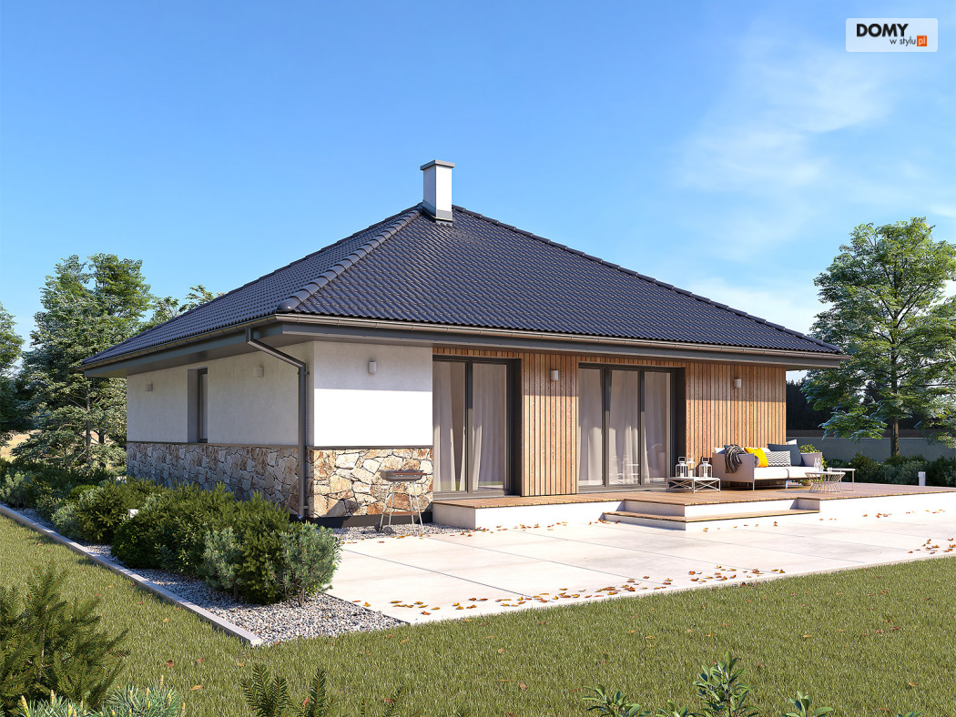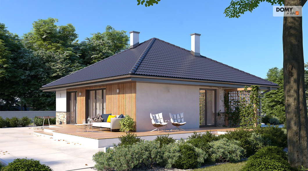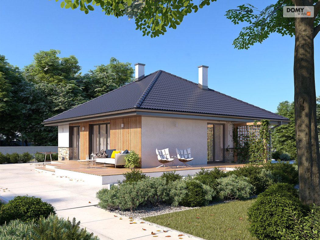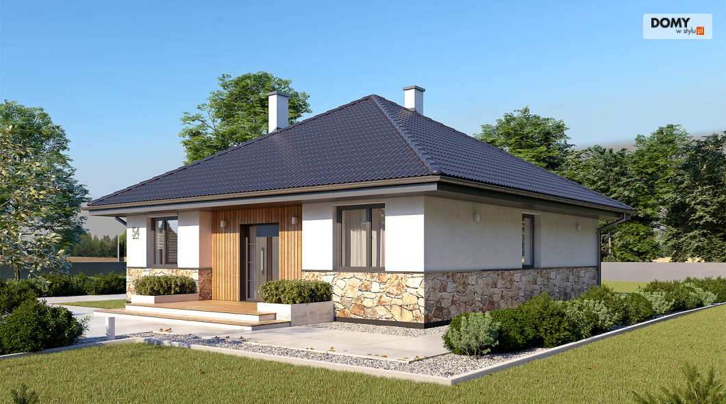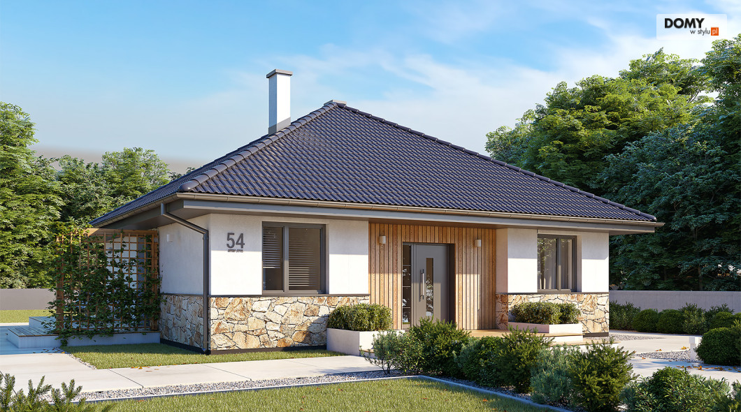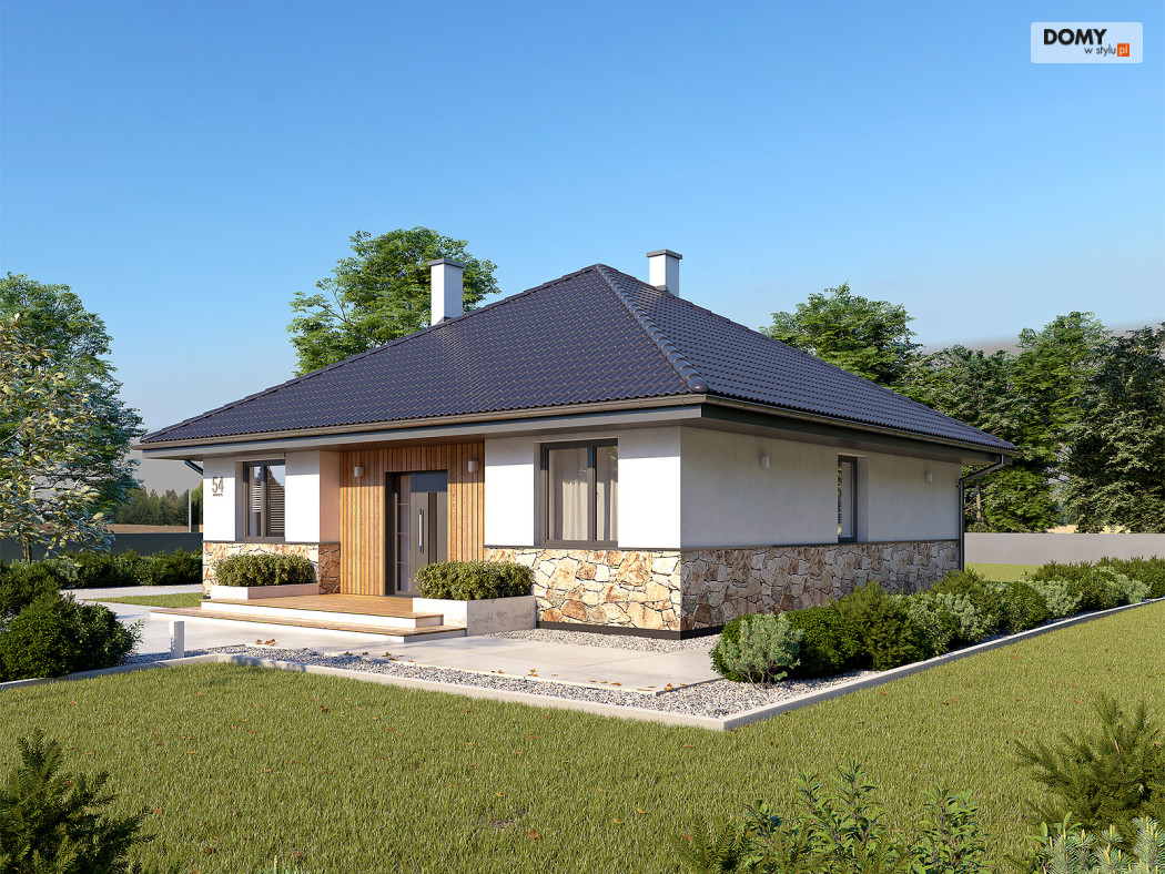 Elka 2 dr-st to niewielki dom parterowy odpowiadający potrzebom 3-4 osobowej rodziny. Projekt charakteryzuje się zwartą bryłą przykrytą dachem kopertowym. Atutem projektu jest przestrzenna część dzienna, którą tworzą salon połączony z jadalnią oraz otwarta kuchnia. Strefa nocna to dwie sypialnie oraz rodzinna łazienka. W projekcie przewidziano kotłownię, którą można wykorzystać na ogrzewanie gazowe jak i paliwo stałe.