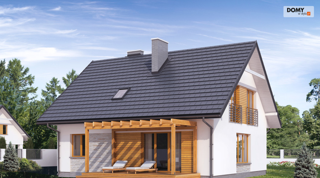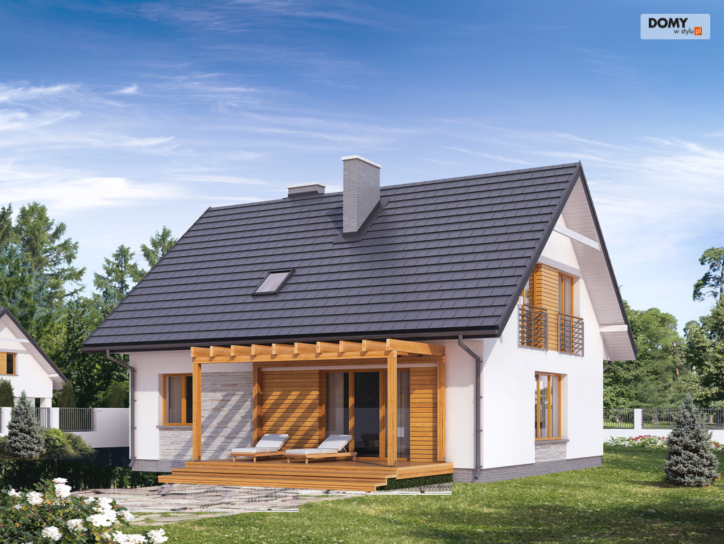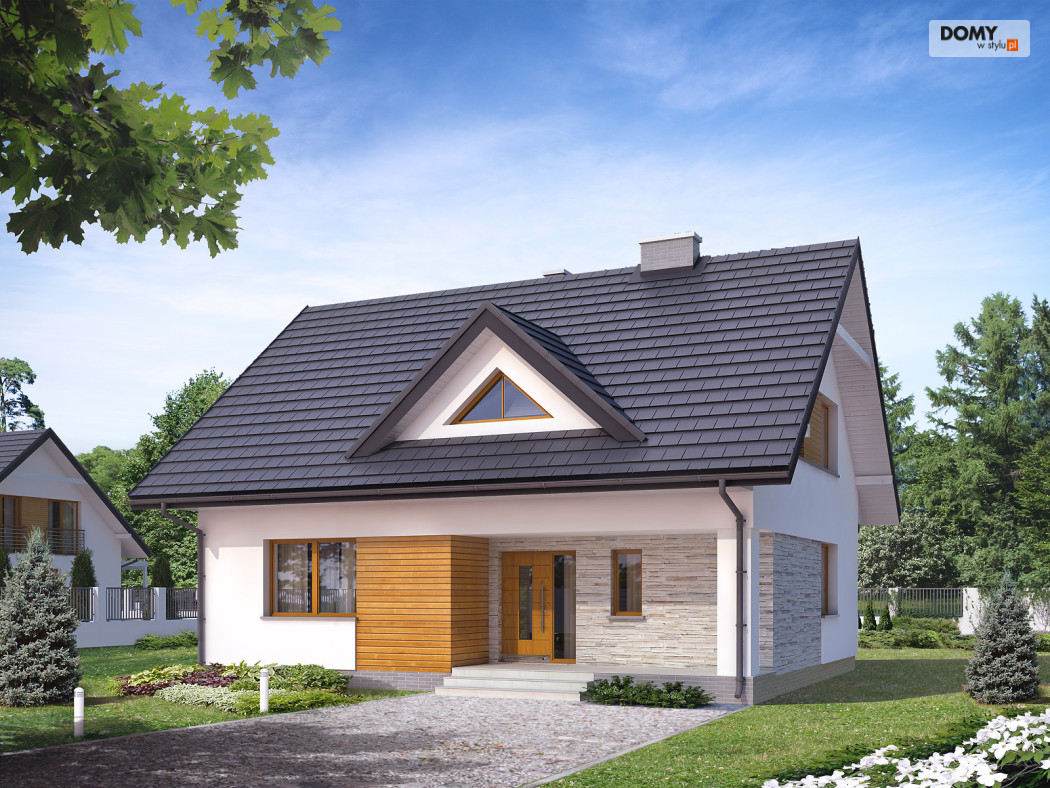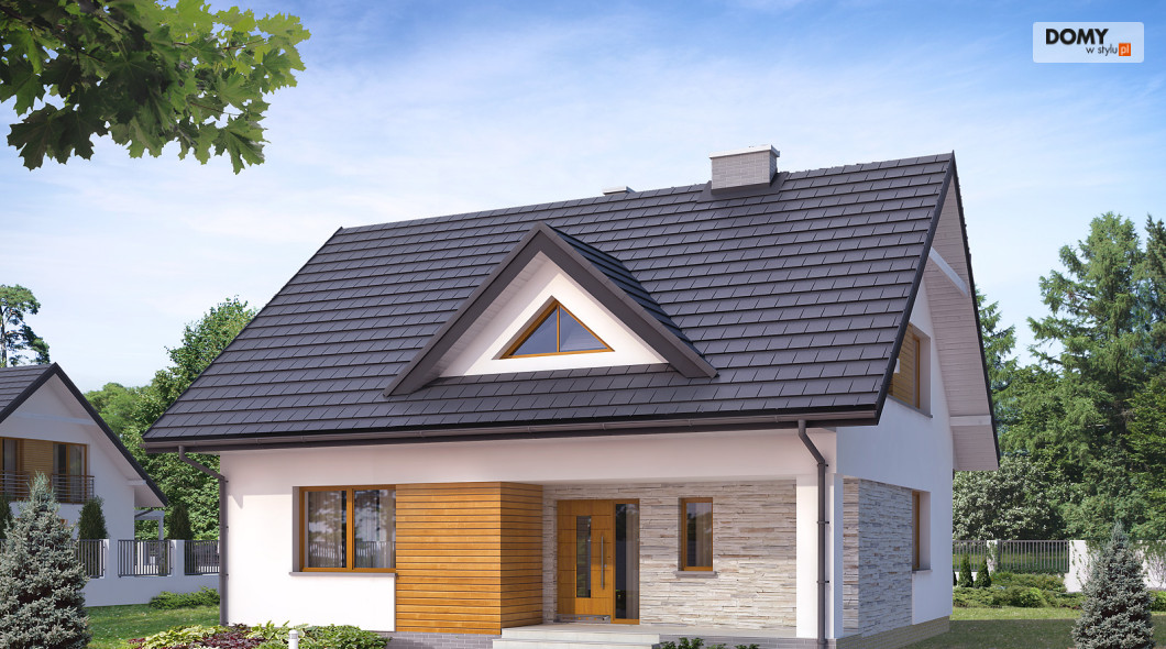 Wygodny dom dla 4 - 5-osobowej rodziny. Zlokalizowana na parterze część dzienna mieści przestronny pokój dzienny z jadalnią, kuchnię, spiżarnię, gabinet, wc. Na poddaszu znajdują się trzy sypialnie, łazienka i garderoba. Dom posiada piwnicę, w której mieści się kotłownia oraz pomieszczenia gospodarcze. Prosta bryła z dwuspadowym dachem czyni dom łatwym w realizacji i tanim w użytkowaniu.