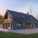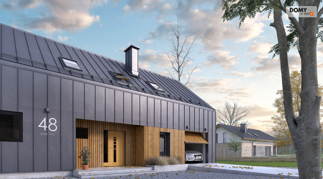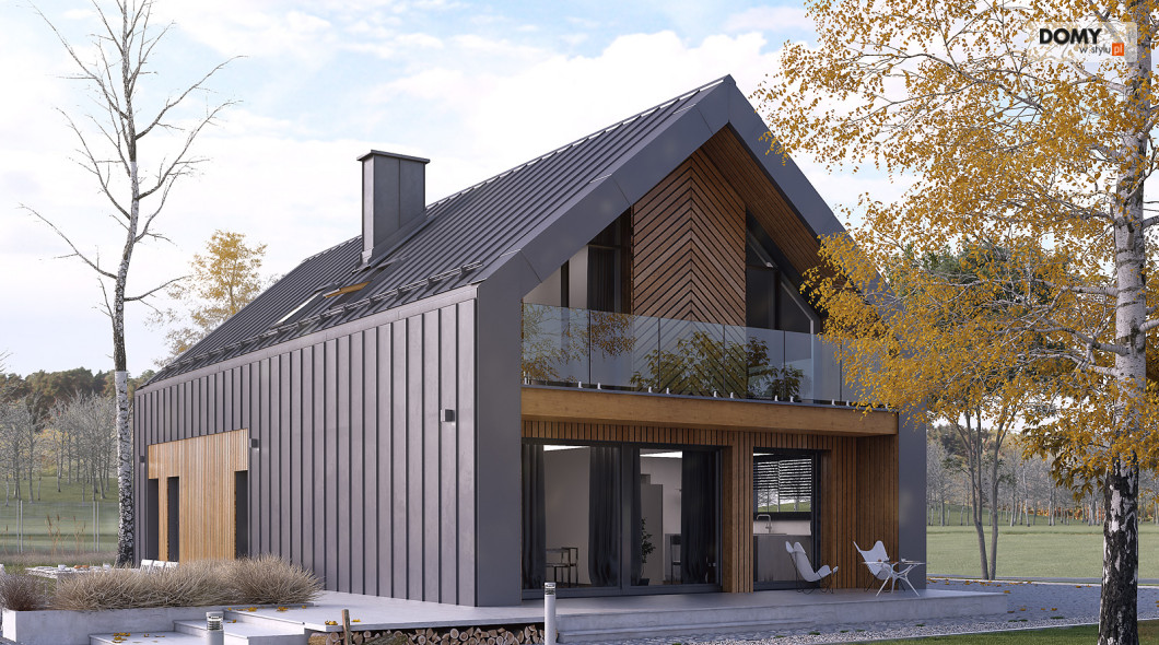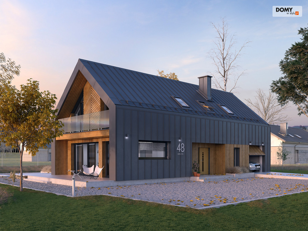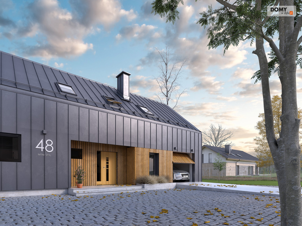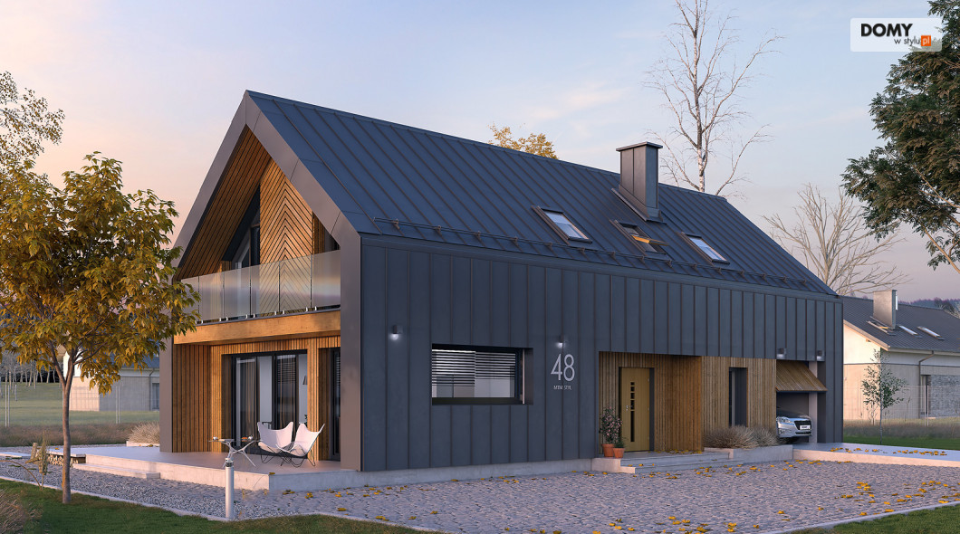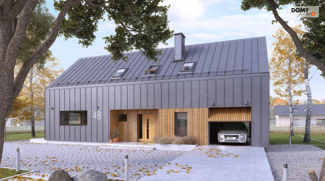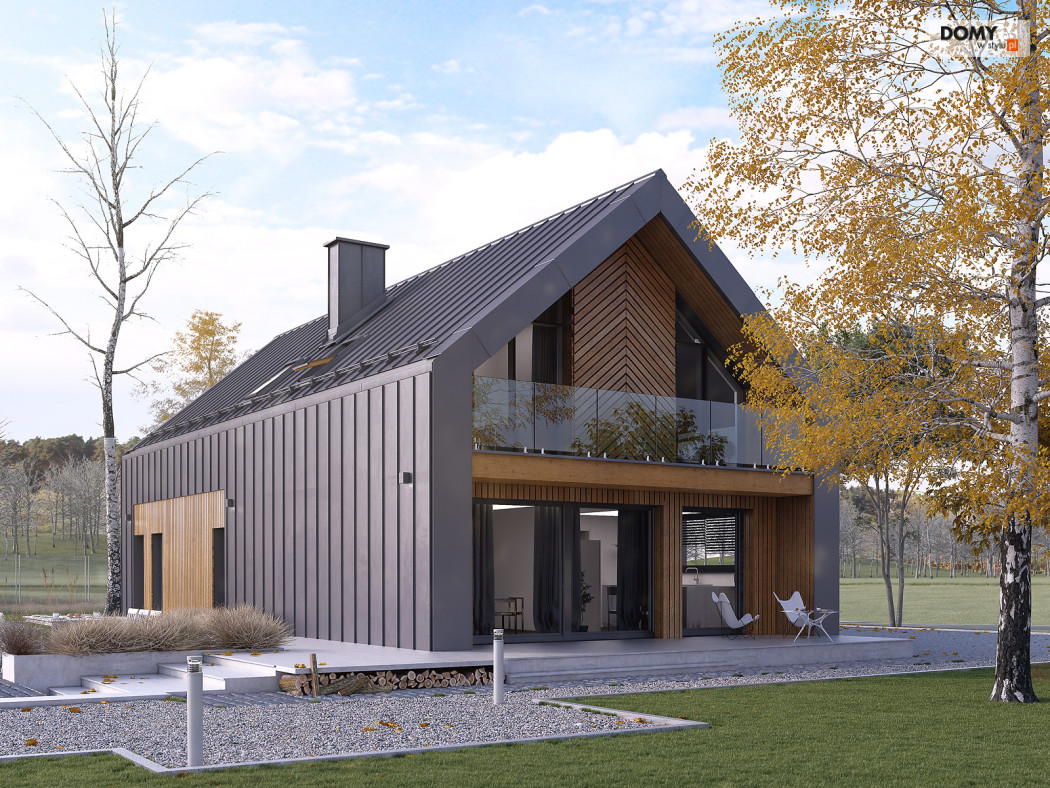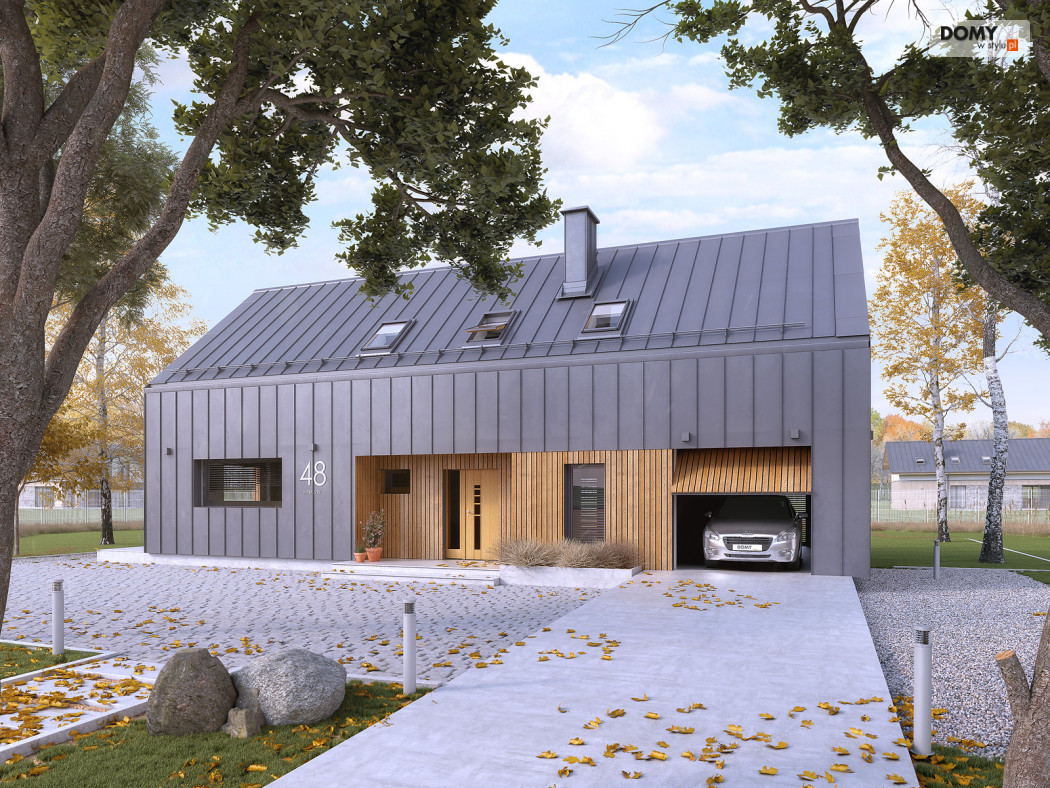 Pogodny to projekt domu oparty na prostym rzucie nawiązujący bryłą do nowoczesnej stodoły. Duże przeszklenia i wykończenie elewacji nadają bryle oryginalnego wyglądu. W projekcie istnieje wyraźny podział na część dzienną i nocną. Na parterze znajduje się kuchnia z jadalnią i salonem. Dodatkowo zaprojektowano łazienkę, garaż i kotłownię. Na poddaszu znajdują się 3 sypialnie w tym dwie z garderobą oraz apartament gospodarzy z własną łazienką i garderobą. Dodatkowo do dyspozycji mieszkańców zaprojektowano ogólnodostępną łazienkę i oddzielne pomieszczenie na pralnię. Układ funkcjonalny uzupełnia jednostanowiskowy garaż z wyjściem zewnętrznym od strony ogrodu.