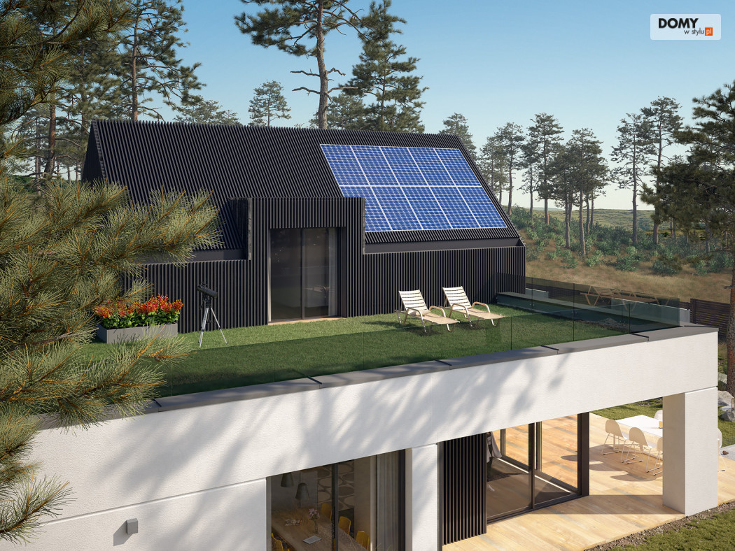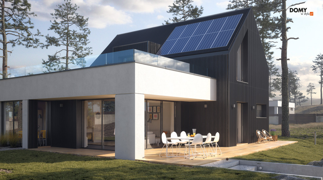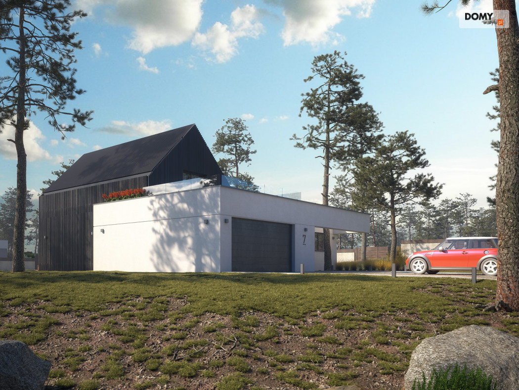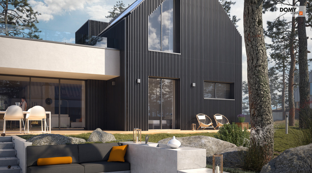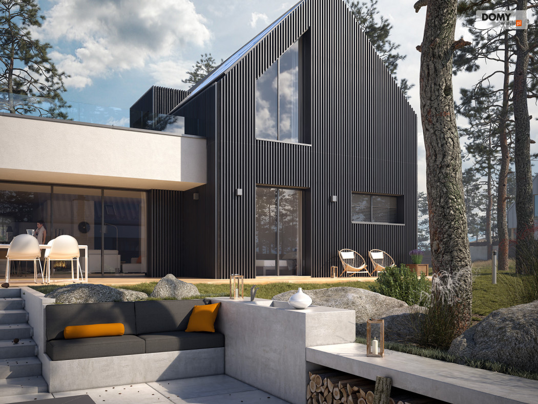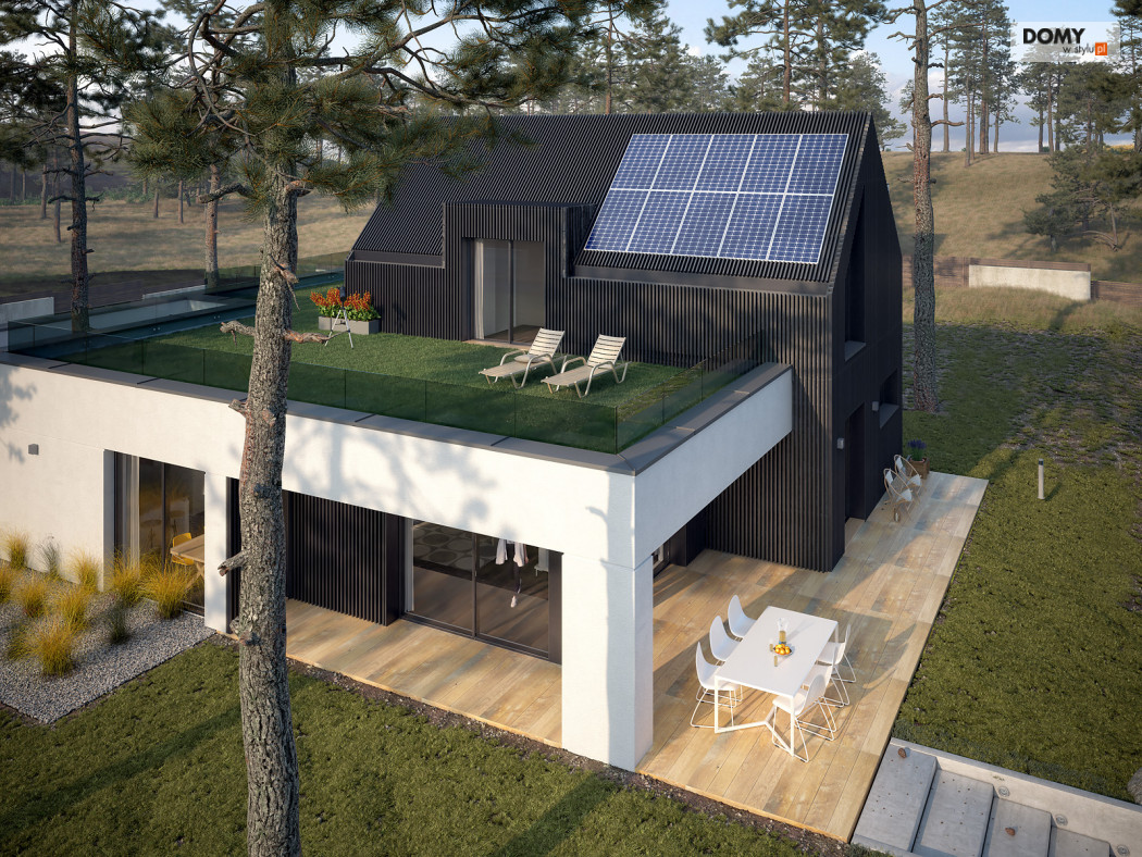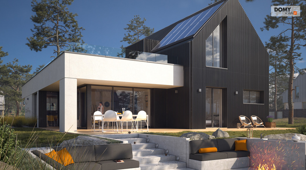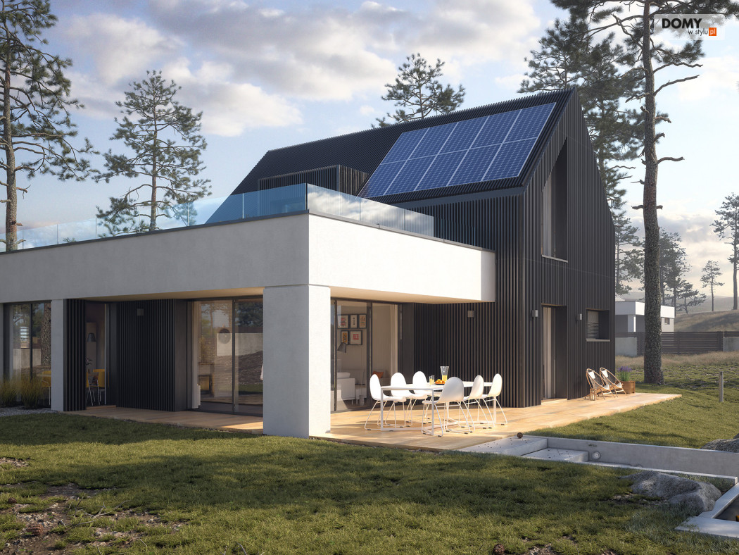Justa 2 to projekt domu o nowoczesnej formie i funkcjonalnych, przestronnych wnętrzach. Pasjonatom gotowania na pewno spodoba się duża wygodna kuchnia, która dodatkowo posiada spiżarnię. Prawie 30 metrowy salon z dużymi przeszkleniami jest ogromnym atutem tego projektu. Główna sypialnia gospodarzy znajduje się na parterze i ma dostęp do osobistej łazienki oraz garderoby. Dwie pozostałe sypialnie znajdują się na poddaszu, skąd również znajduje się wyjście na pokaźnych rozmiarów taras, który jest idealnym miejscem do wypoczynku i relaksu. Nowoczesny wygląd budynku podkreślają zaprojektowane na elewacji ogrodowej przeszklenia, które wizualnie dodają lekkości i doskonale doświetlają wnętrze domu. Na uwagę zasługuje zielony taras nad kondygnacją parteru oraz dwuspadowa bryła poddasza wykończona drewnianą szalówką.
