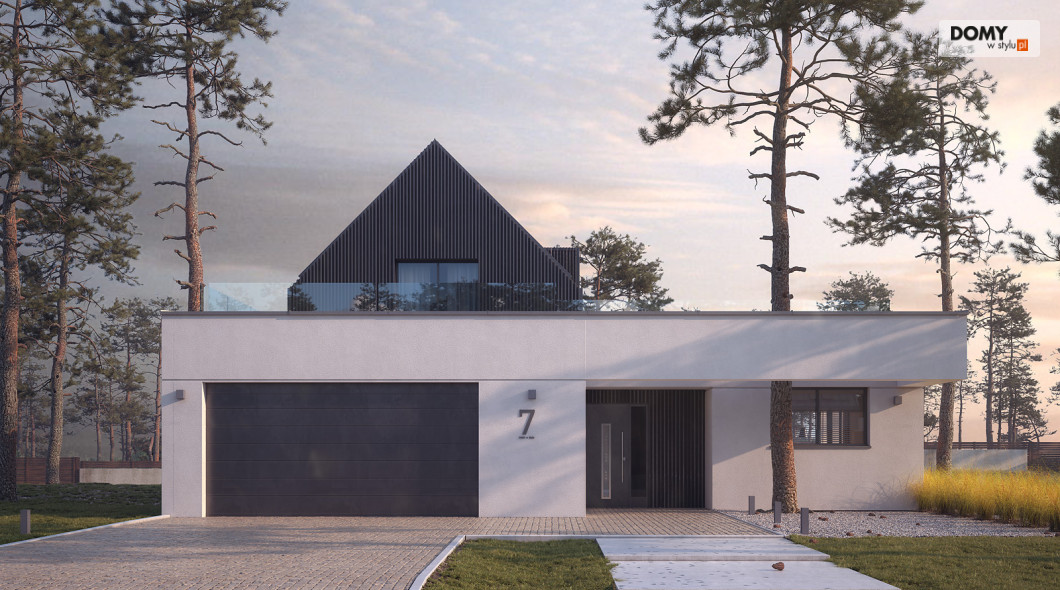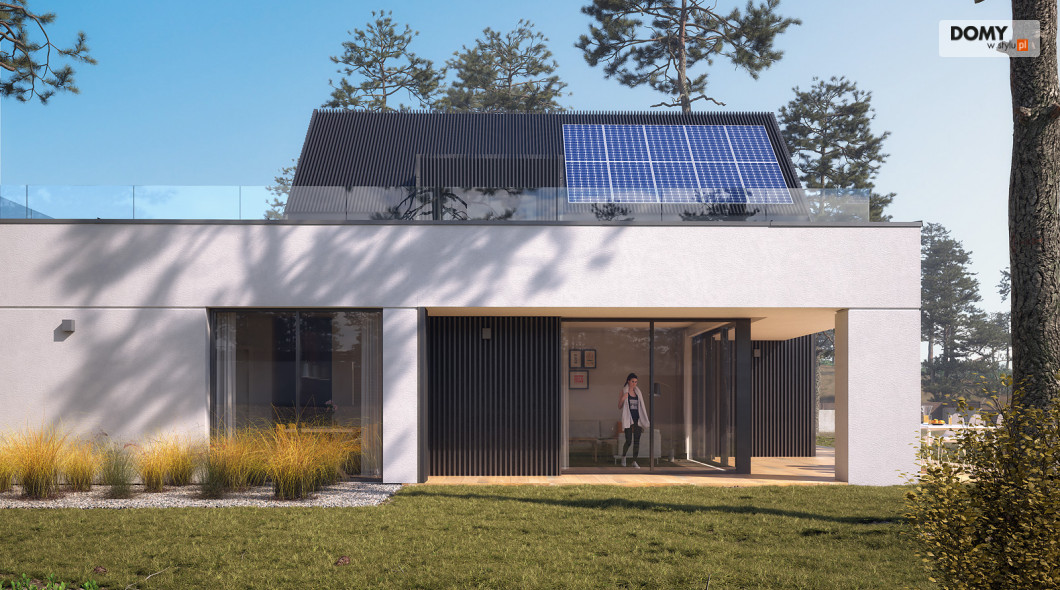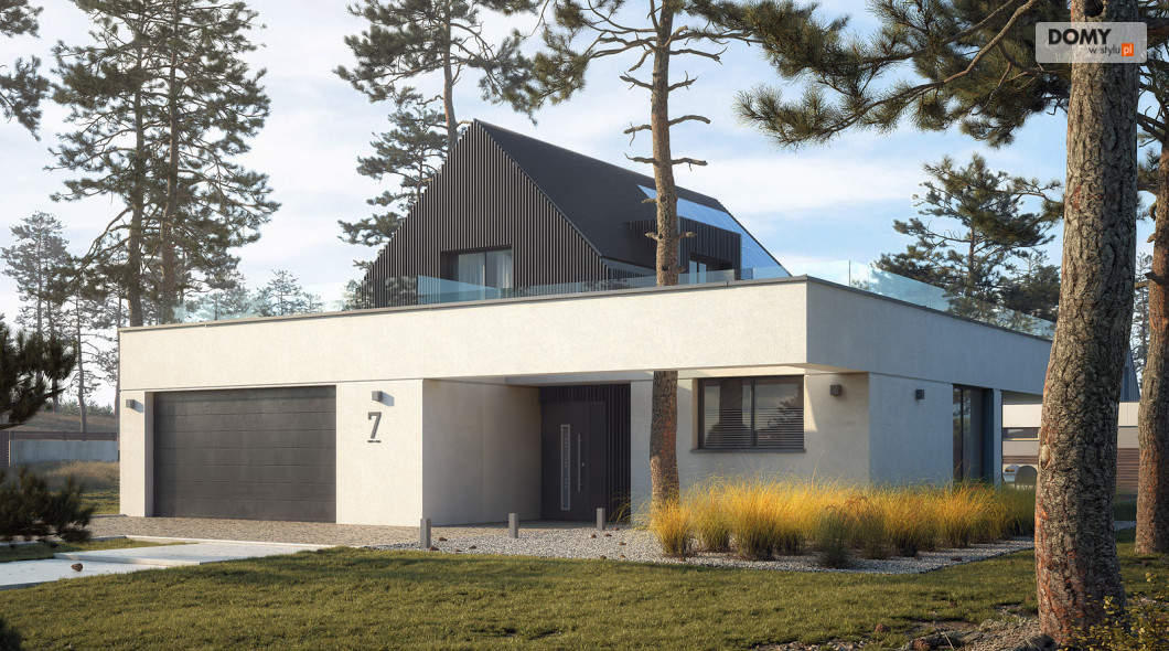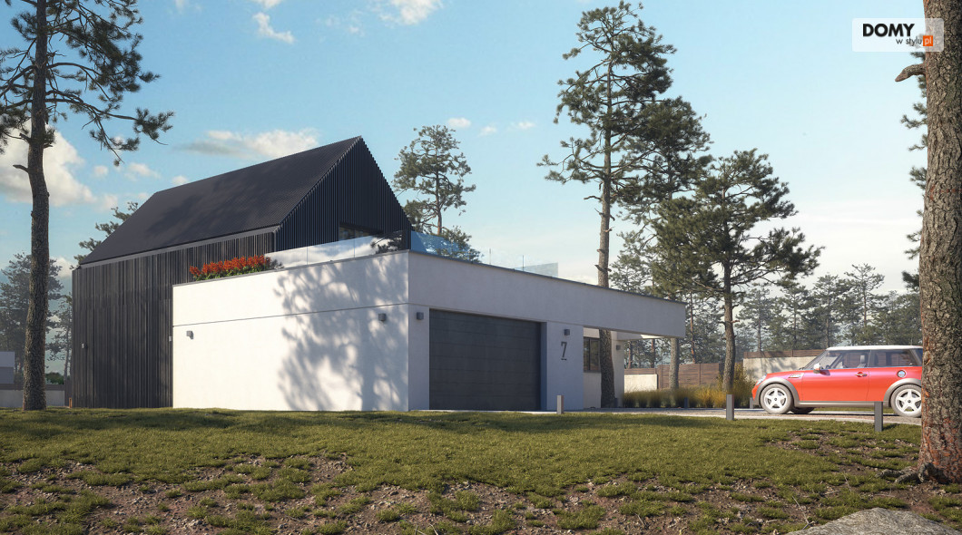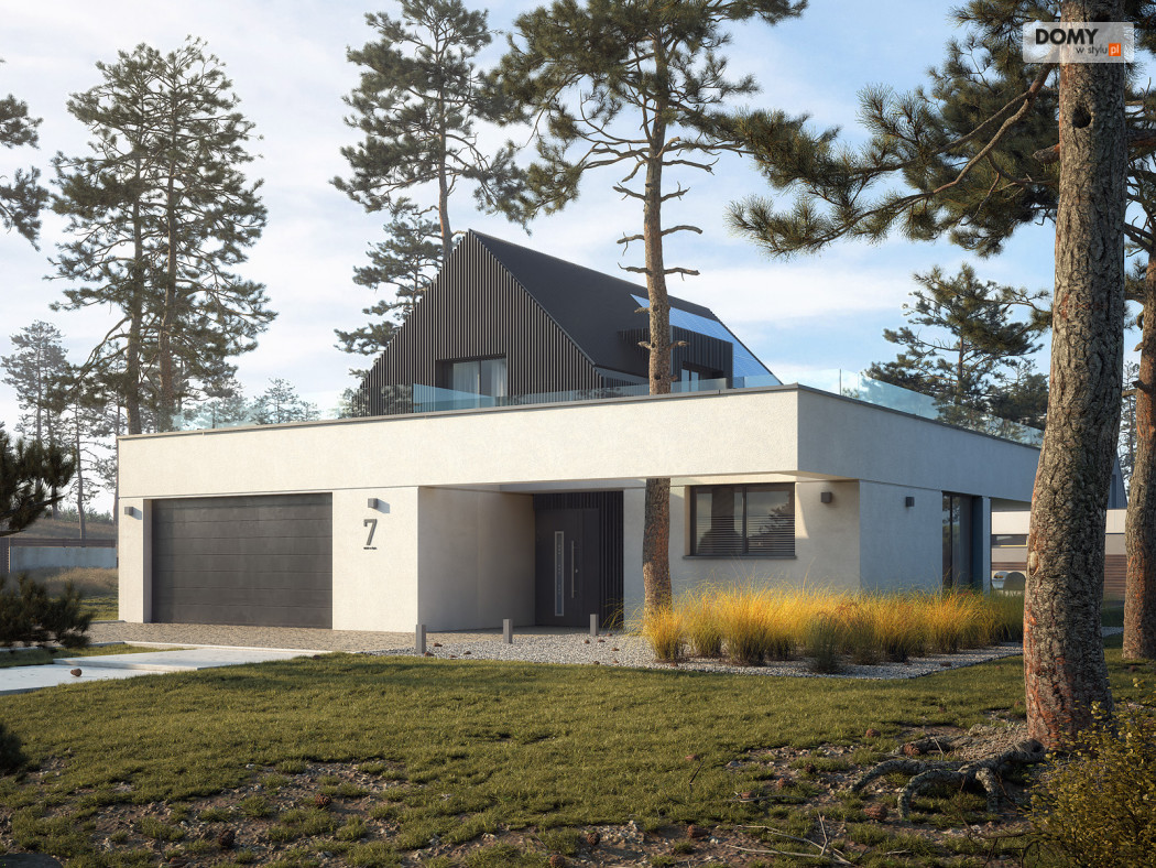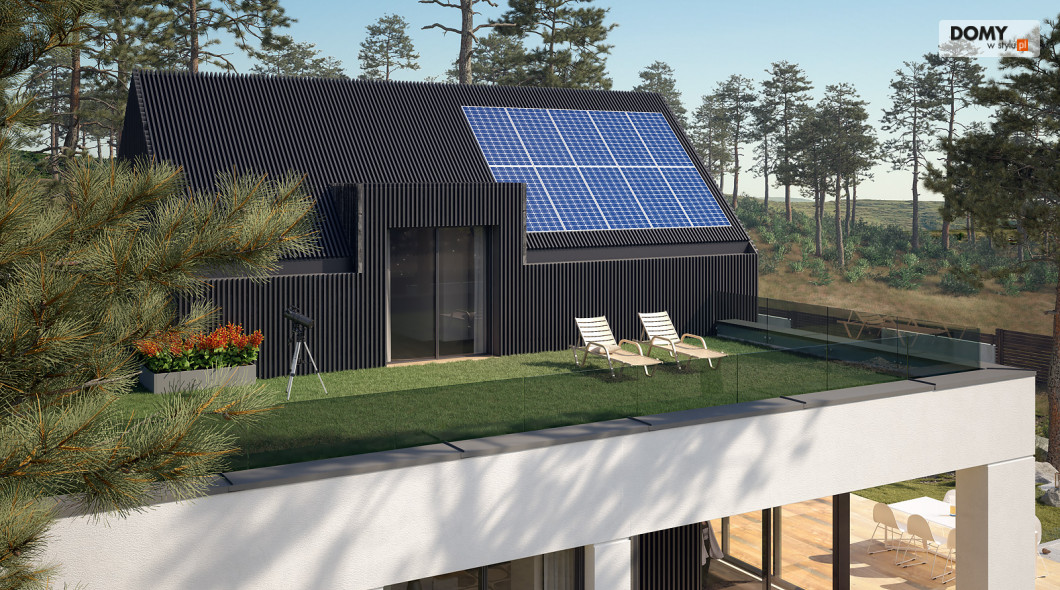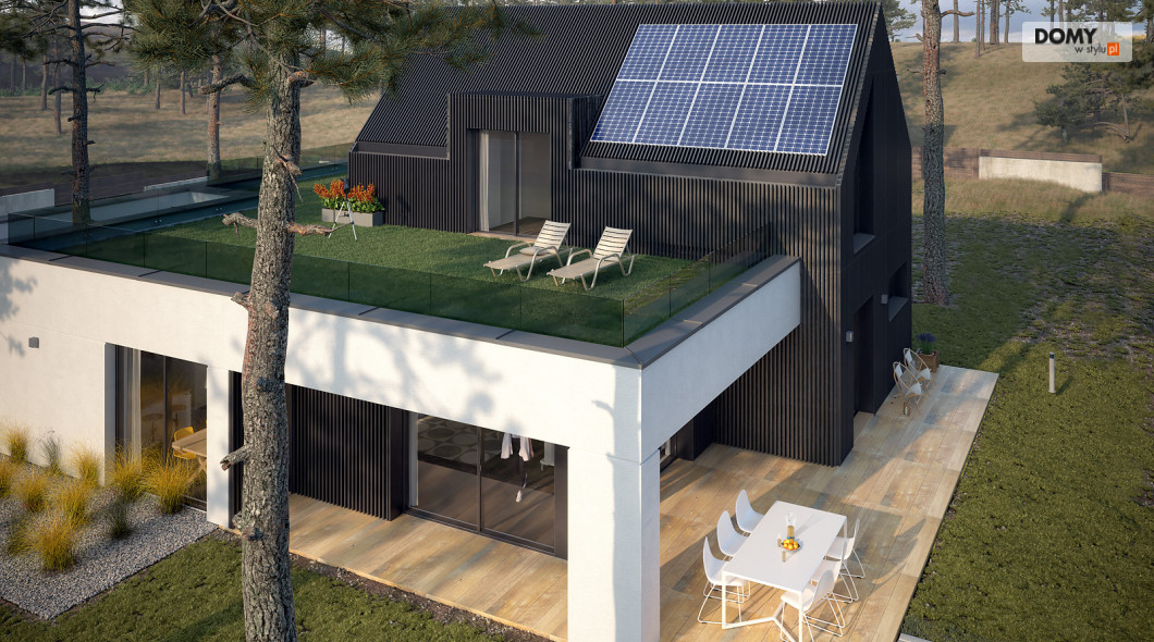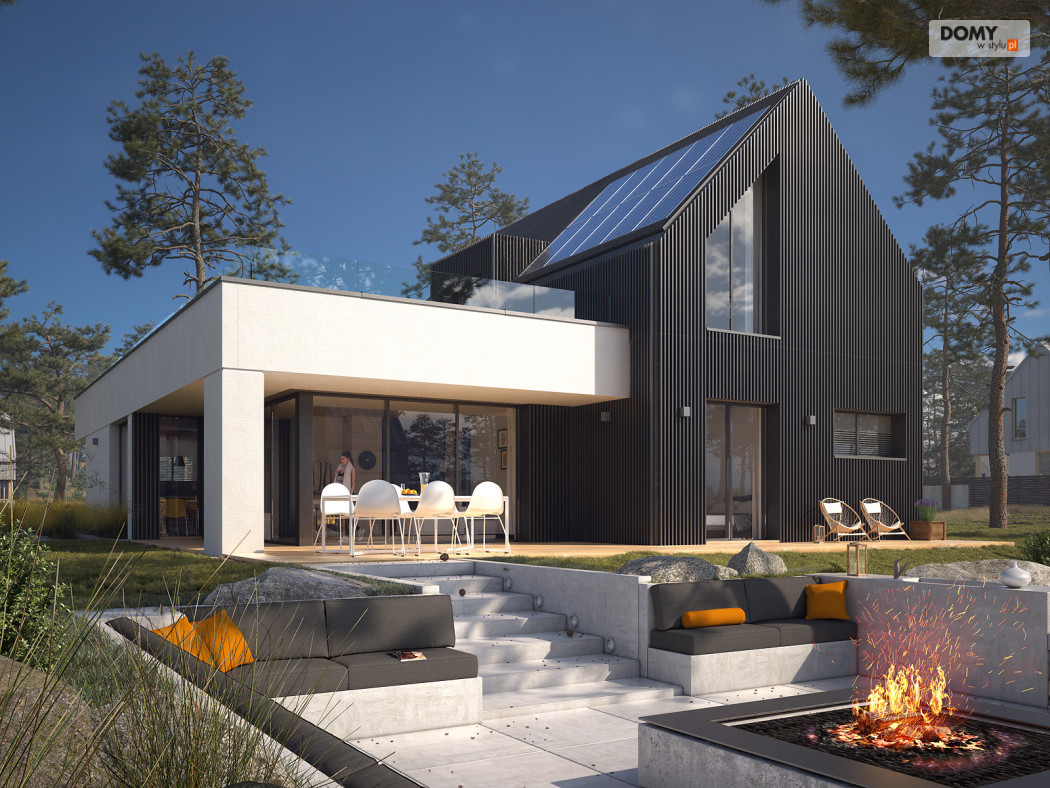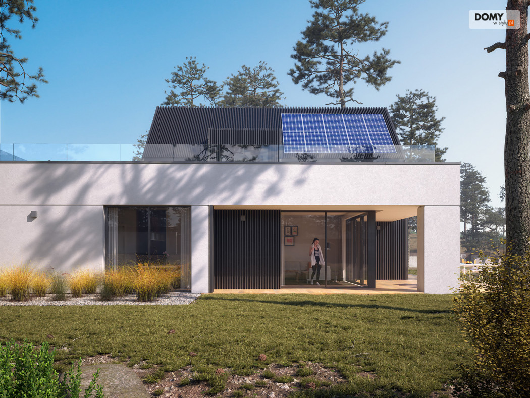 Justa 2 to projekt domu o nowoczesnej formie i funkcjonalnych, przestronnych wnętrzach. Pasjonatom gotowania na pewno spodoba się duża wygodna kuchnia, która dodatkowo posiada spiżarnię. Prawie 30 metrowy salon z dużymi przeszkleniami jest ogromnym atutem tego projektu. Główna sypialnia gospodarzy znajduje się na parterze i ma dostęp do osobistej łazienki oraz garderoby. Dwie pozostałe sypialnie znajdują się na poddaszu, skąd również znajduje się wyjście na pokaźnych rozmiarów taras, który jest idealnym miejscem do wypoczynku i relaksu. Nowoczesny wygląd budynku podkreślają zaprojektowane na elewacji ogrodowej przeszklenia, które wizualnie dodają lekkości i doskonale doświetlają wnętrze domu. Na uwagę zasługuje zielony taras nad kondygnacją parteru oraz dwuspadowa bryła poddasza wykończona drewnianą szalówką.