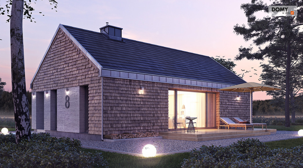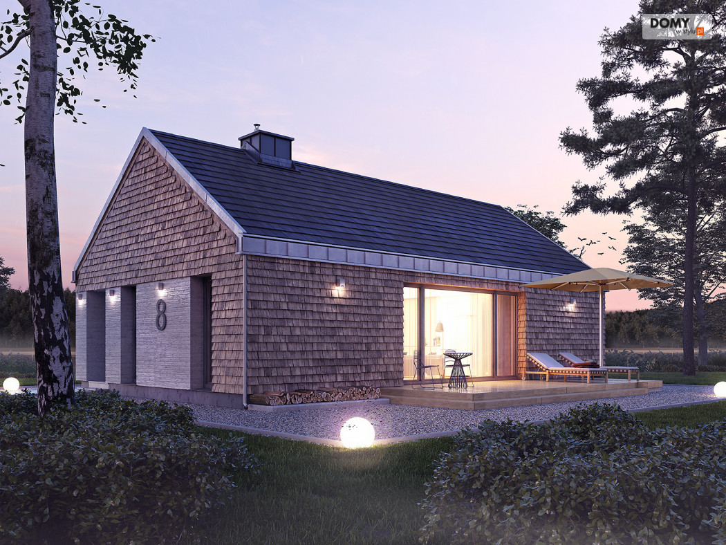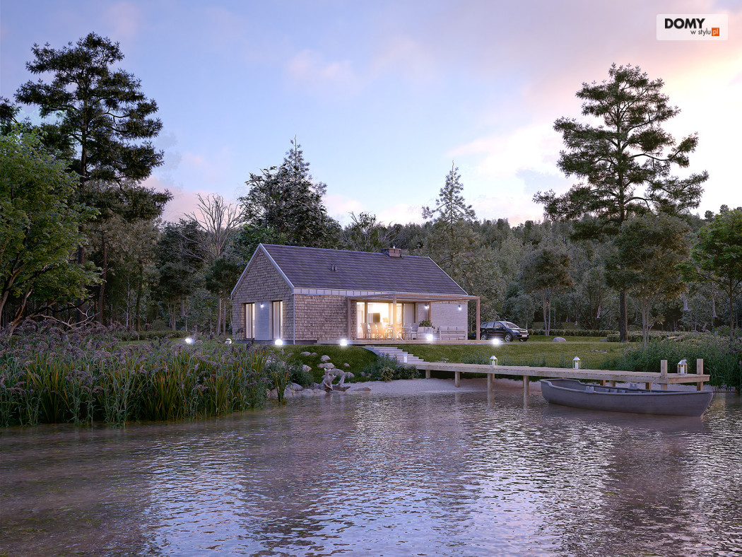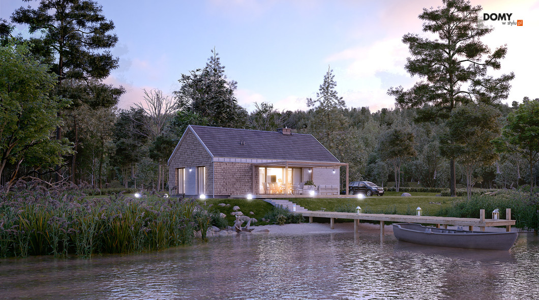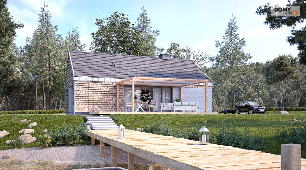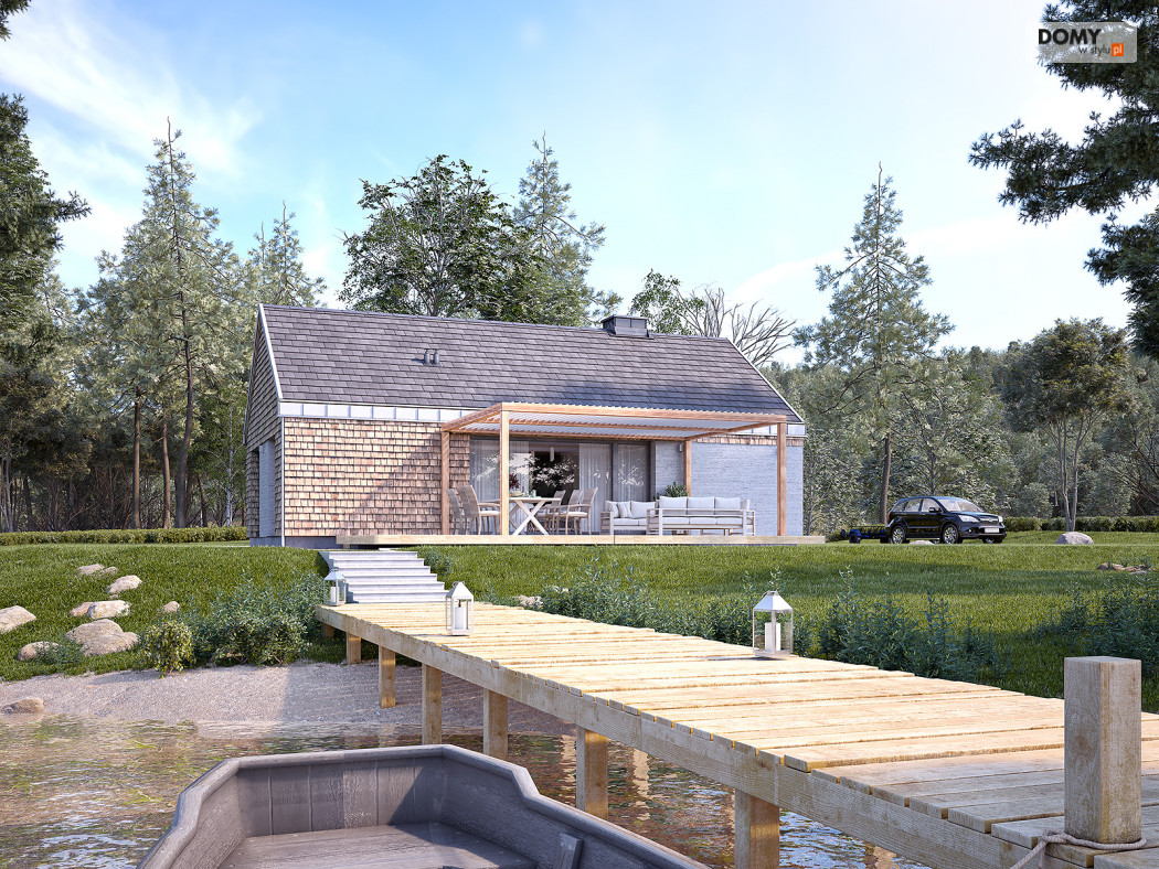 Projekt Wakacyjny to dom parterowy o charakterze wypoczynkowym. Zastosowanie dużych przeszkleń oraz naturalnych materiałów sprawiają, że dom będzie wpisywał się w otaczający krajobraz. W domu znajduje się otwarta kuchnia wraz z jadalnią i salonem. Zaprojektowano również niewielki wiatrołap oraz łazienkę z miejscem na piec gazowy. Dom może pełnić funkcję letniskową oraz całoroczną.