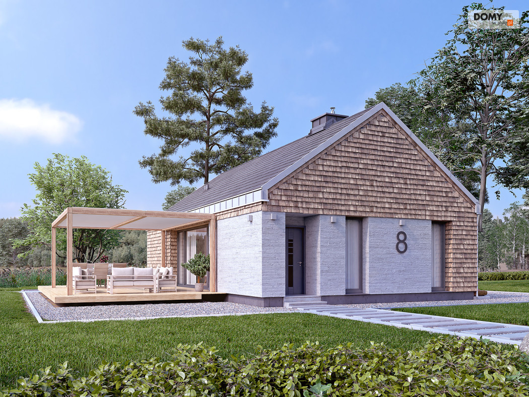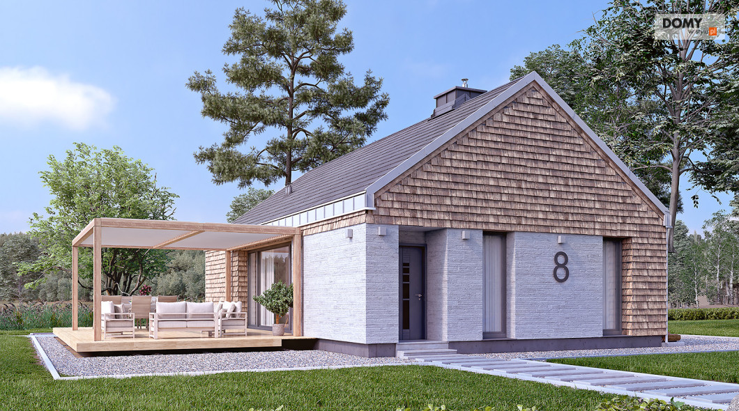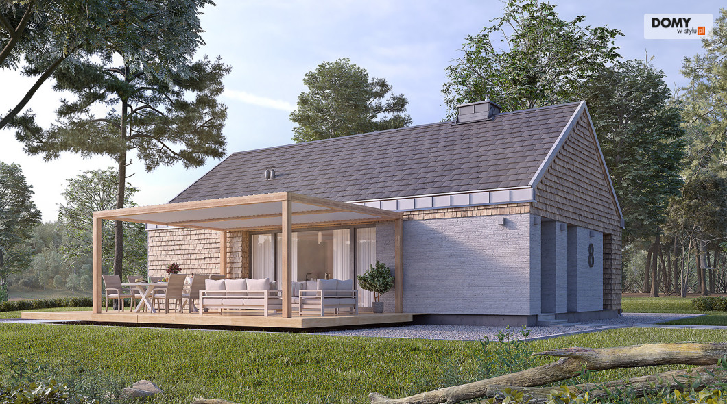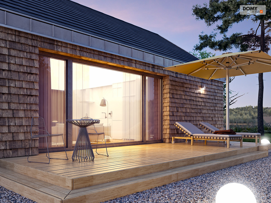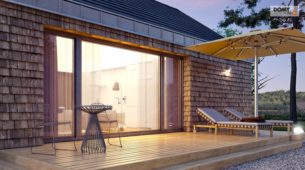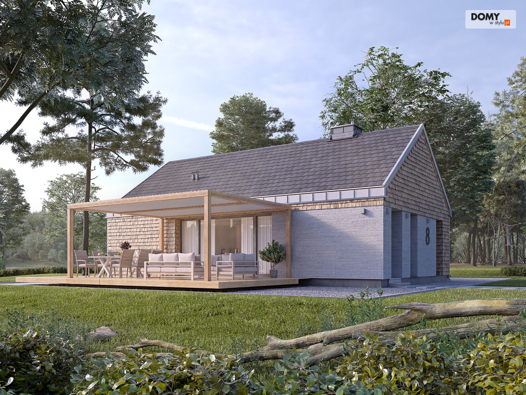 Projekt Wakacyjny to dom parterowy o charakterze wypoczynkowym. Zastosowanie dużych przeszkleń oraz naturalnych materiałów sprawiają, że dom będzie wpisywał się w otaczający krajobraz. W domu znajduje się otwarta kuchnia wraz z jadalnią i salonem. Zaprojektowano również niewielki wiatrołap oraz łazienkę z miejscem na piec gazowy. Dom może pełnić funkcję letniskową oraz całoroczną.