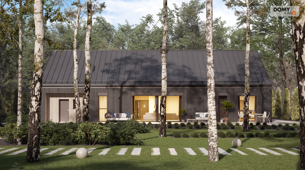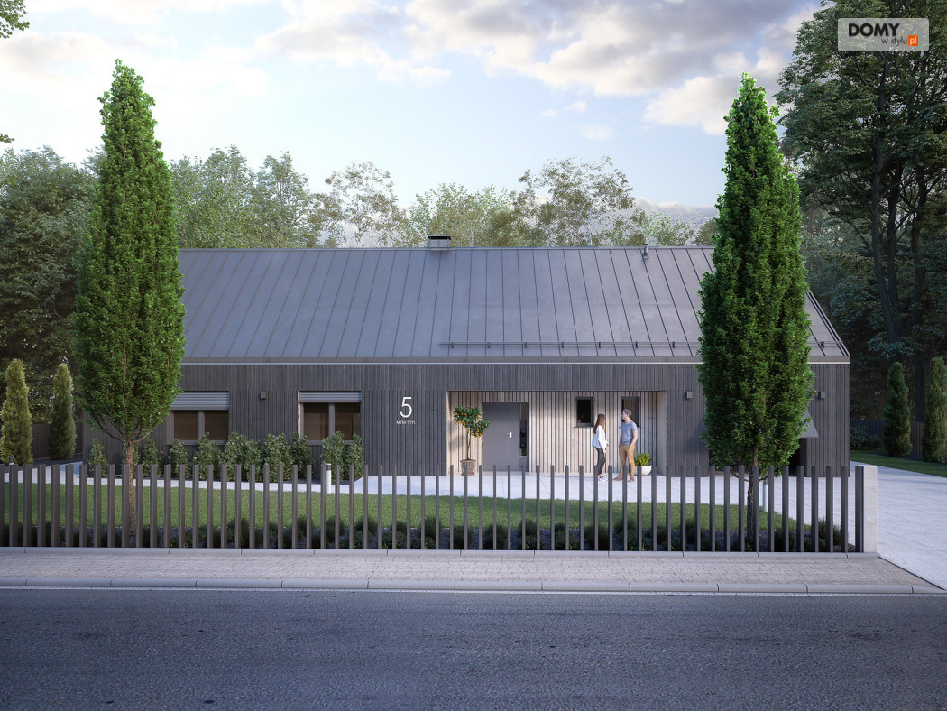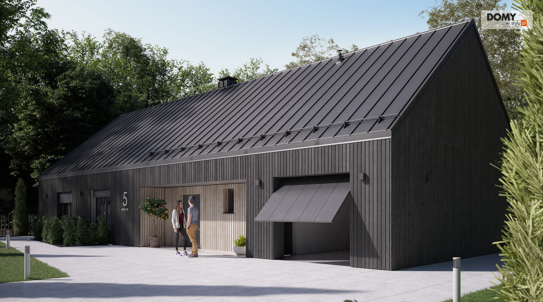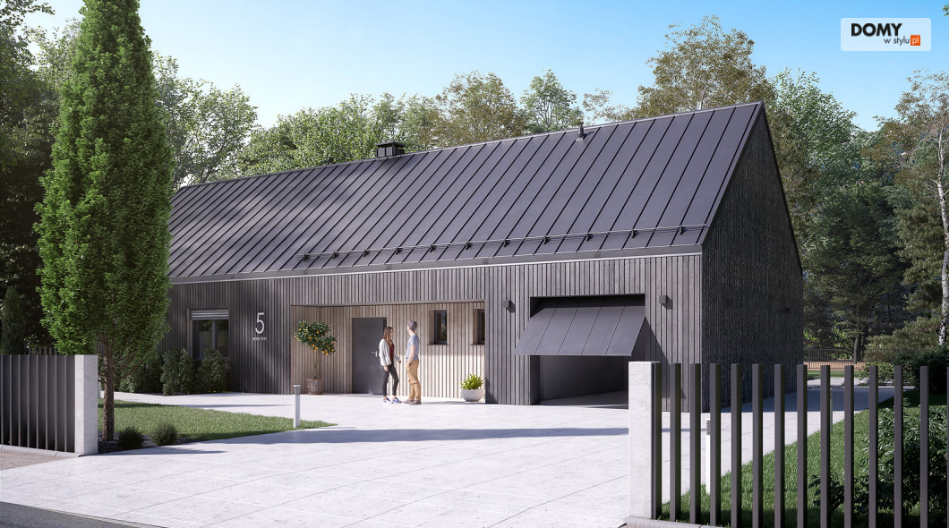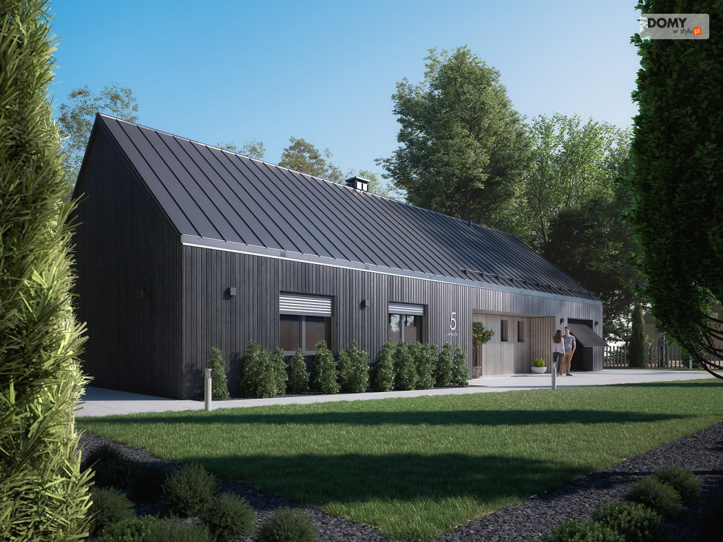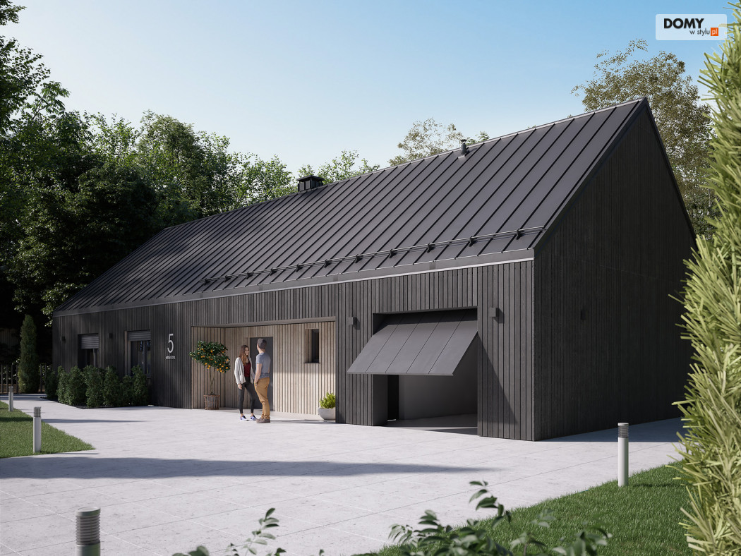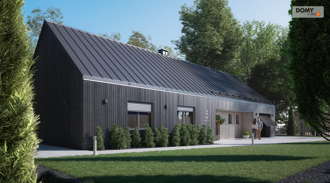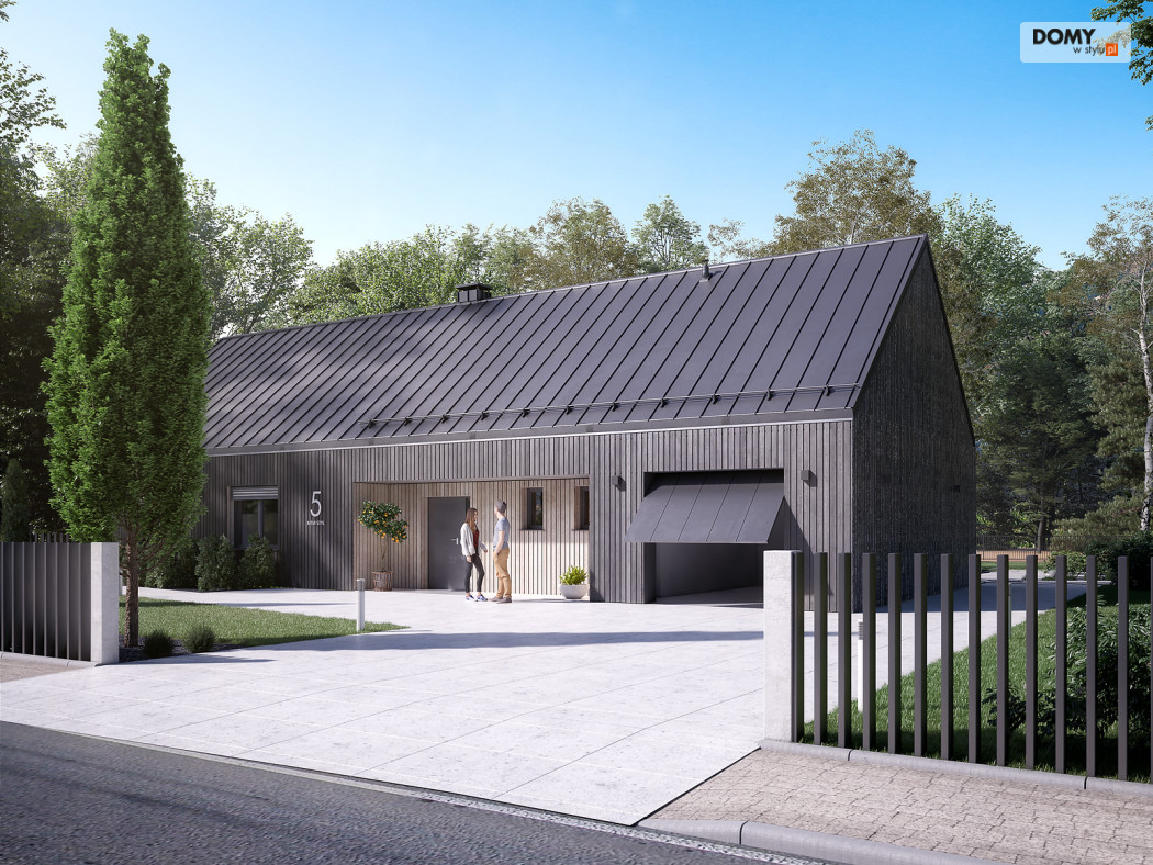 Jemioła 5 to nowoczesny projekt domu parterowego zaprojektowany w stylu nowoczesnej stodoły. Projekt wyróżnia się oryginalnym wyglądem elewacji oraz funkcjonalnym układem wnętrza. Prosta bryła budynku została przykryta dwuspadowym dachem pozbawionym okapów. Cała elewacja została wykończona czarnym drewnem opalanym ogniem, co pozwoliło uzyskać niezwykle niepowtarzalny efekt wizualny oraz trwały materiał wykończeniowy. Minimalistyczny wygląd budynku potęguje bezokapowy dach pokryty grafitową blachą na rąbek. Wnętrze zostało podzielona na strefę dzienną, nocną oraz gospodarczą. Strefę dzienną tworzy otwarta przestrzeń z salonem, jadalnią oraz kuchnię z przylegającą do niej spiżarnią. Obok kuchni znajduje się również dodatkowe pomieszczenie gospodarcze z przeznaczeniem na pralnię. W strefie nocnej zaprojektowano trzy sypianie, łazienkę oraz oddzielną toaletę. Główna sypialnia tworzy apartament gospodarzy z prywatną łazienką oraz garderobą. W strefie gospodarczej znajduje się jednostanowiskowy garaż oraz pomieszczenie gospodarcze z oddzielnym wejściem od strony ogrodu. Atutem projektu są liczne wysokie przeszklenia w części dziennej domu, które nie tylko stanowią źródło naturalnego światła, ale również łączą wnętrze domu z otaczającym go krajobrazem.