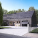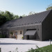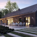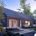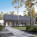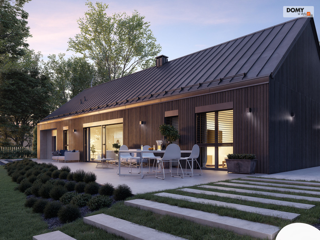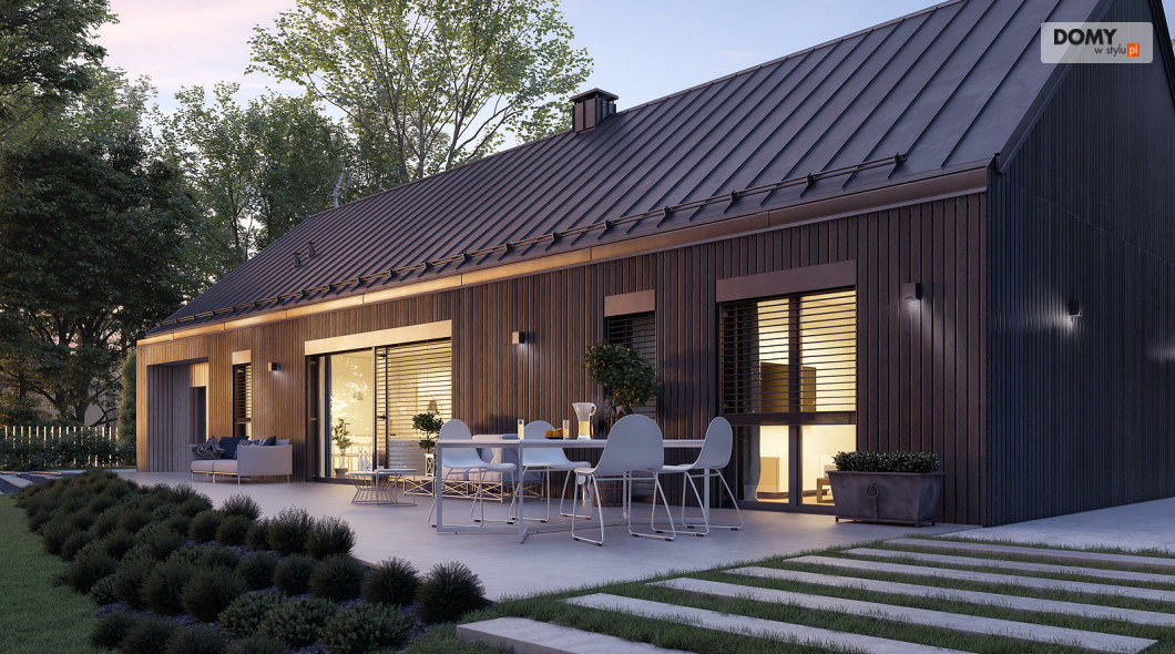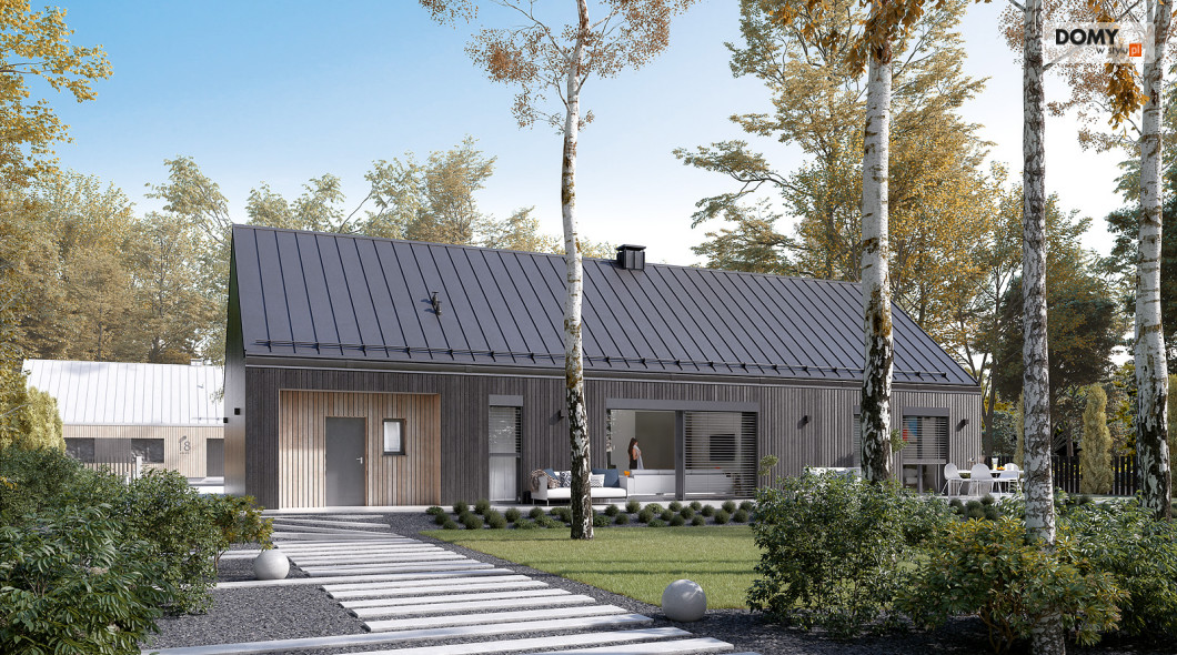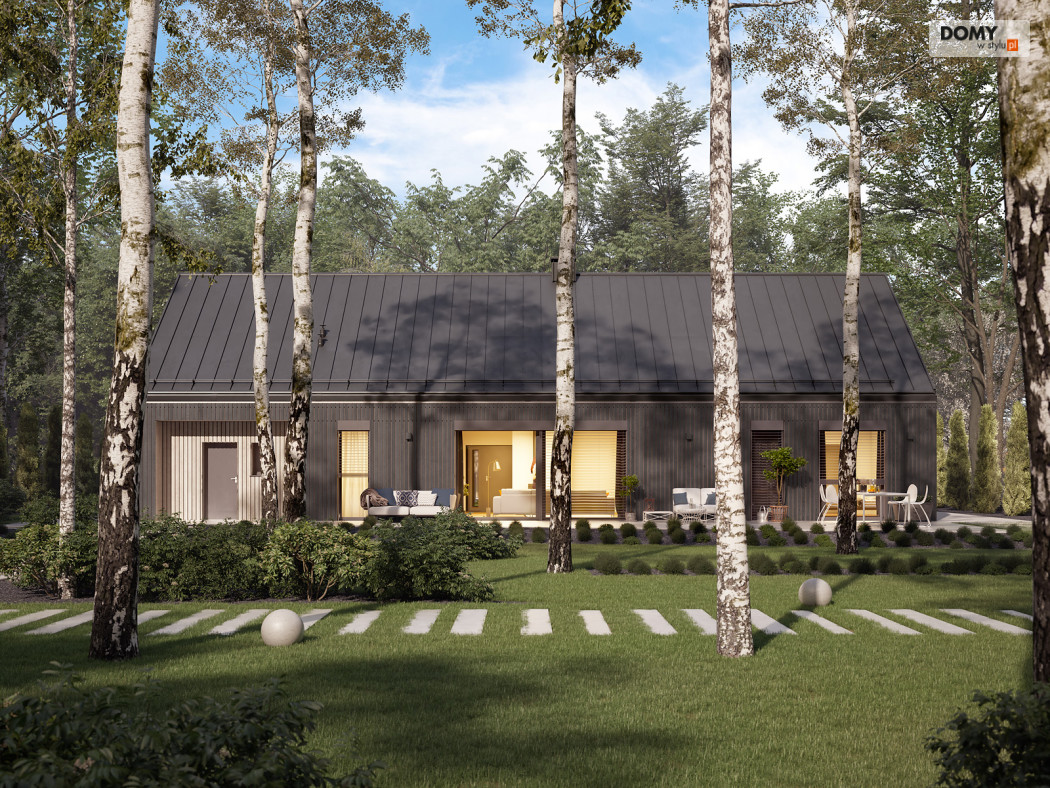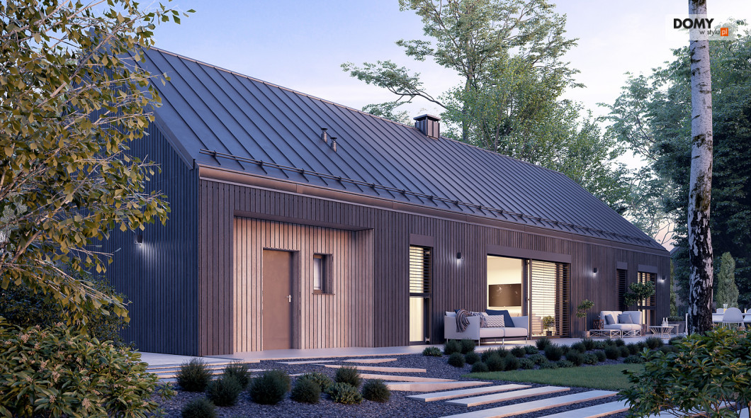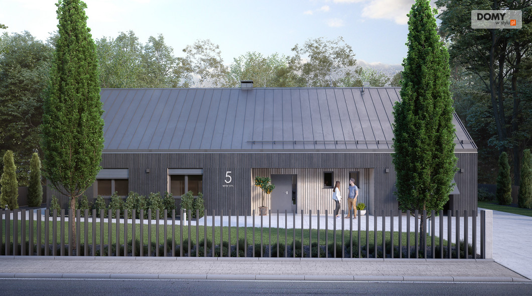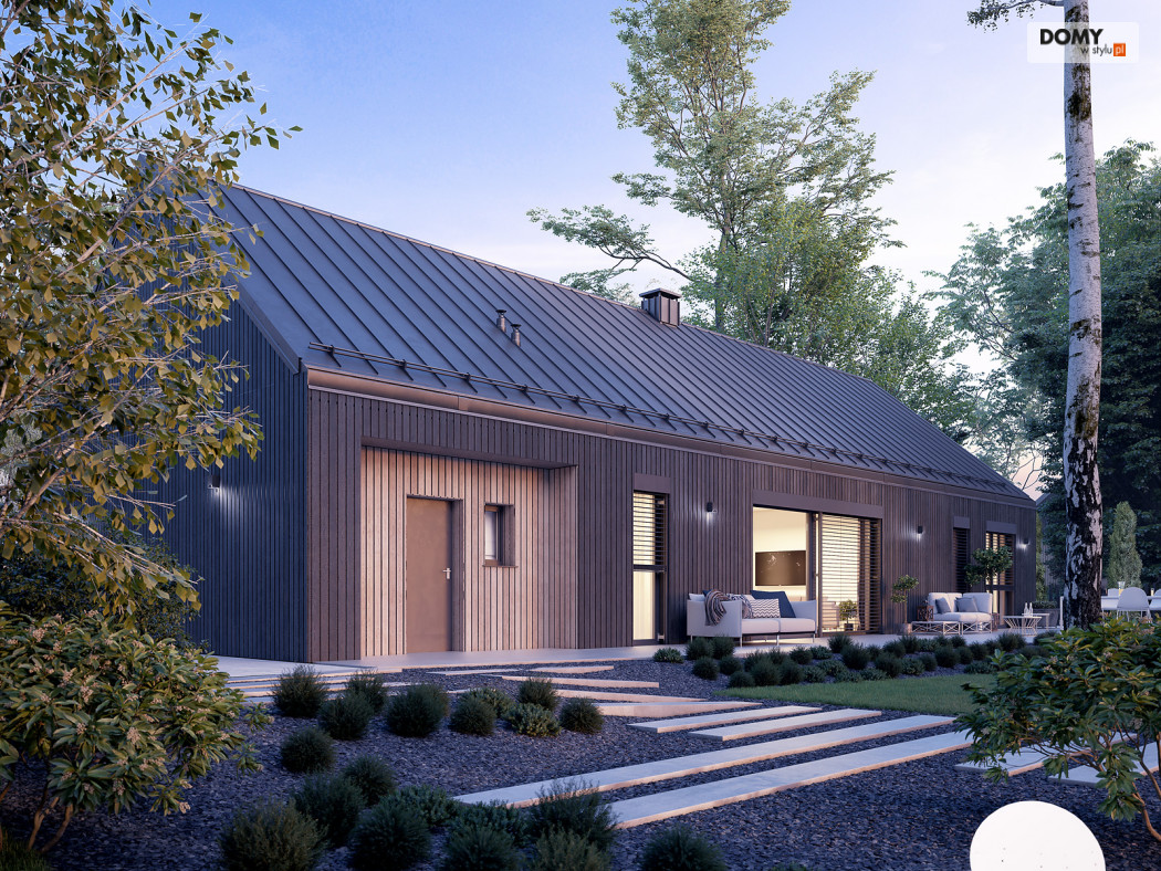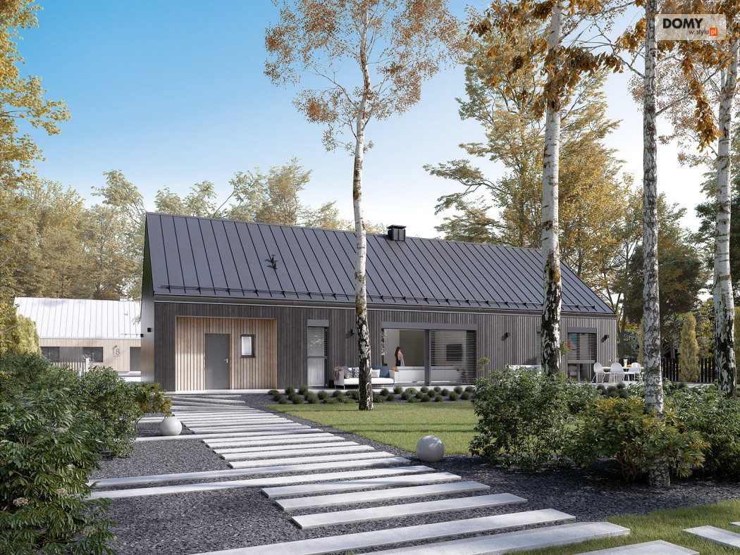 Jemioła 5 to nowoczesny projekt domu parterowego zaprojektowany w stylu nowoczesnej stodoły. Projekt wyróżnia się oryginalnym wyglądem elewacji oraz funkcjonalnym układem wnętrza. Prosta bryła budynku została przykryta dwuspadowym dachem pozbawionym okapów. Cała elewacja została wykończona czarnym drewnem opalanym ogniem, co pozwoliło uzyskać niezwykle niepowtarzalny efekt wizualny oraz trwały materiał wykończeniowy. Minimalistyczny wygląd budynku potęguje bezokapowy dach pokryty grafitową blachą na rąbek. Wnętrze zostało podzielona na strefę dzienną, nocną oraz gospodarczą. Strefę dzienną tworzy otwarta przestrzeń z salonem, jadalnią oraz kuchnię z przylegającą do niej spiżarnią. Obok kuchni znajduje się również dodatkowe pomieszczenie gospodarcze z przeznaczeniem na pralnię. W strefie nocnej zaprojektowano trzy sypianie, łazienkę oraz oddzielną toaletę. Główna sypialnia tworzy apartament gospodarzy z prywatną łazienką oraz garderobą. W strefie gospodarczej znajduje się jednostanowiskowy garaż oraz pomieszczenie gospodarcze z oddzielnym wejściem od strony ogrodu. Atutem projektu są liczne wysokie przeszklenia w części dziennej domu, które nie tylko stanowią źródło naturalnego światła, ale również łączą wnętrze domu z otaczającym go krajobrazem.