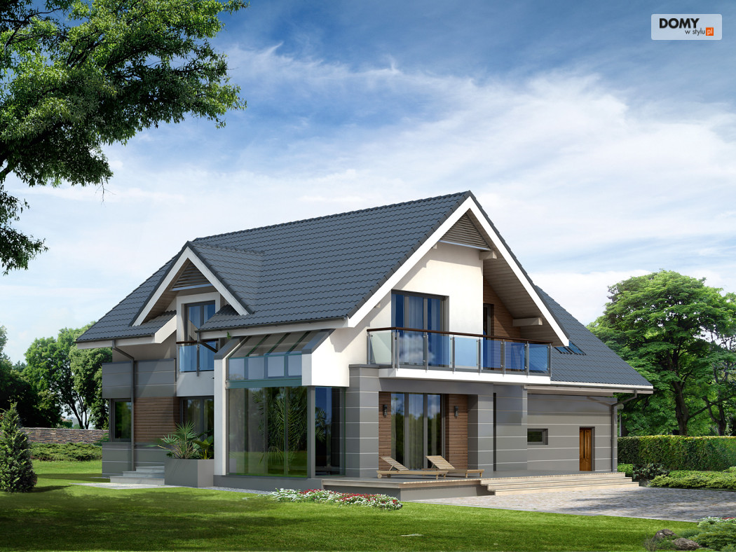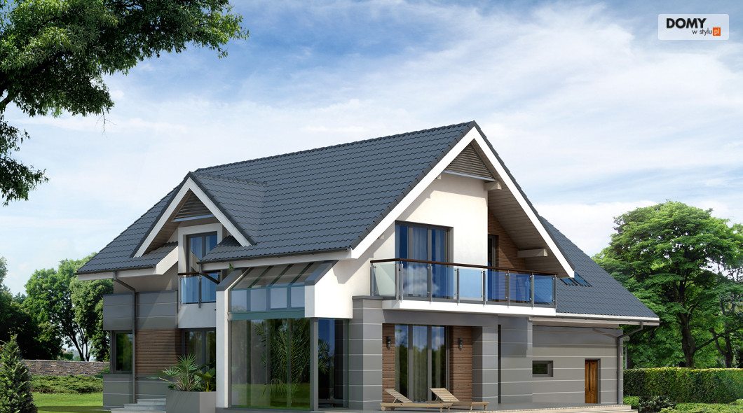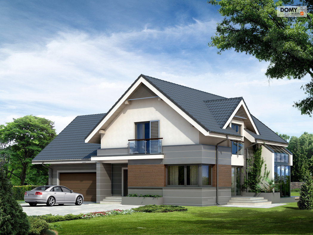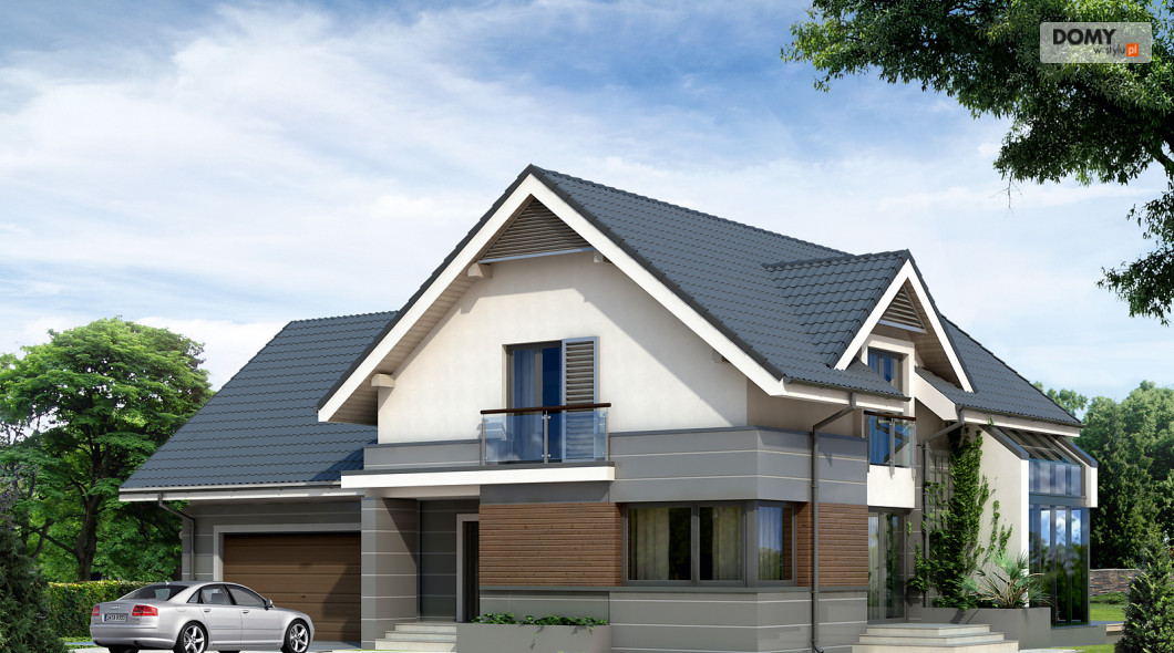 Nowoczesny dom mieszkalny projektowany według standardów przyjętych w domach energooszczędnych. W dużych przestronnych wnętrzach parteru zaprojektowano oranżerię. Na poddaszu zaprojektowano trzy sypialnie oraz pokój zabaw lub hobby nad garażem. Na parterze znajduje się dodatkowy pokój.