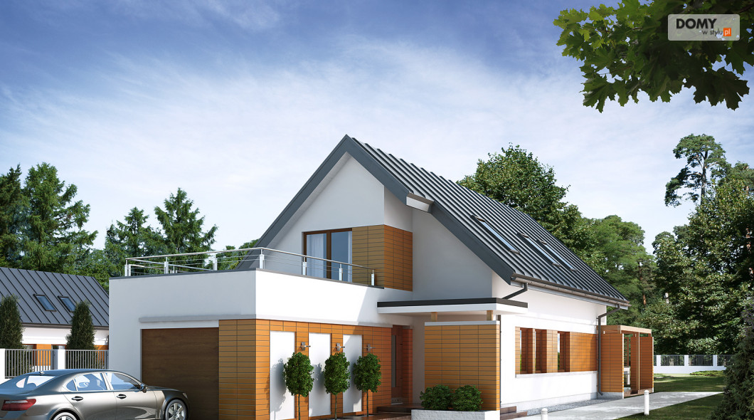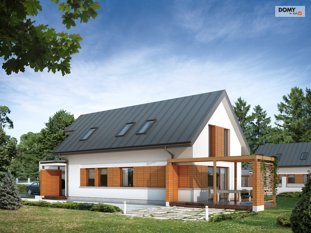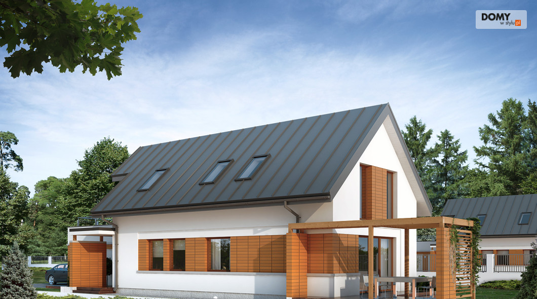 Niewielki, ale wygodny dom na wąską działkę. Zlokalizowana na parterze część dzienna mieści w sobie przestronny pokój dzienny, jadalnię i kuchnię ze spiżarnią, dodatkowo znajdują się tu duża kotłownia i jednostanowiskowy garaż. Na poddaszu zaprojektowano trzy sypialnie, jedną z wydzielonym miejscem do pracy i obszernym tarasem, dwie łazienki i garderobę. Wersją domu bez garażu jest AMELIA