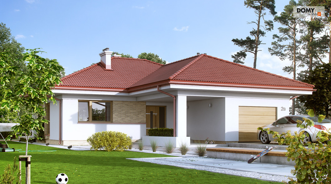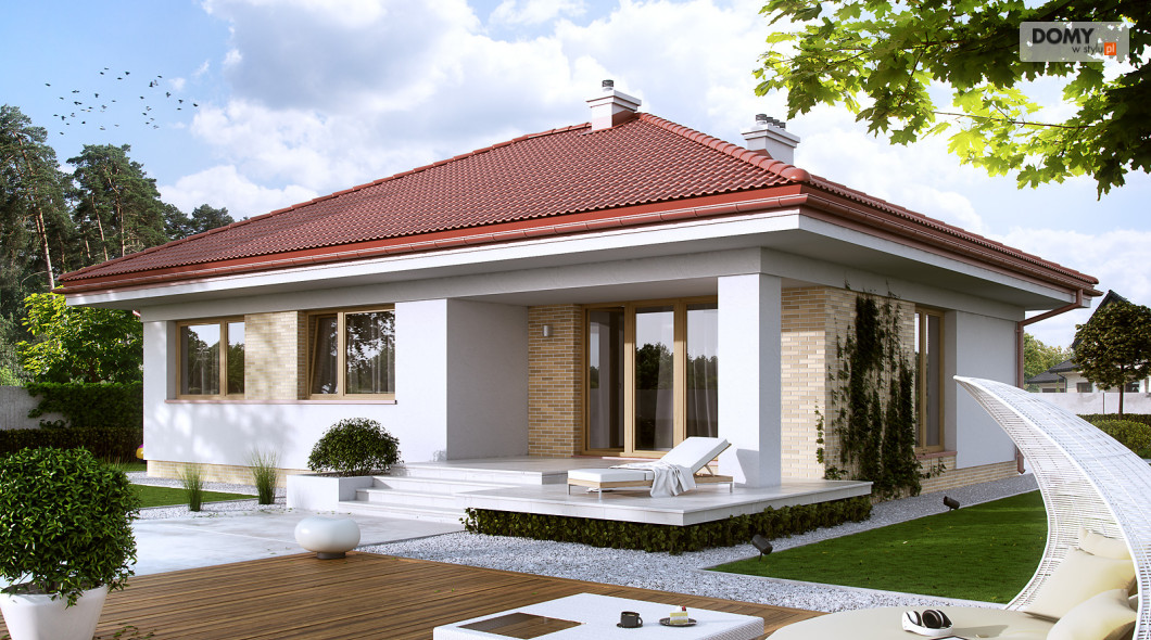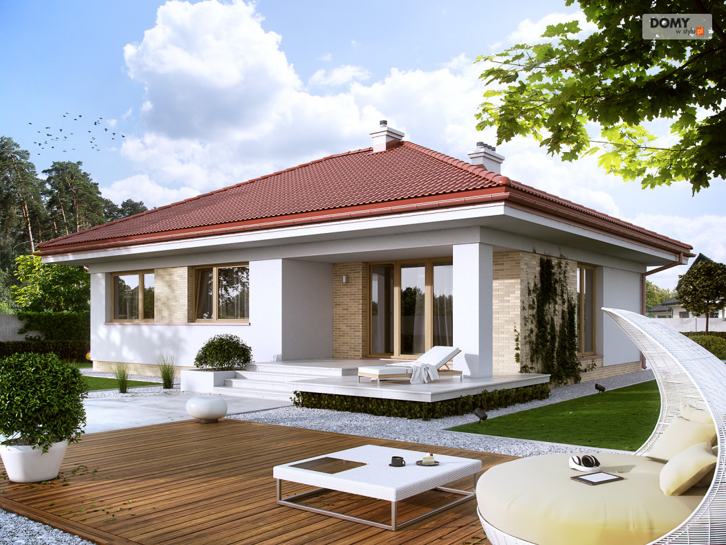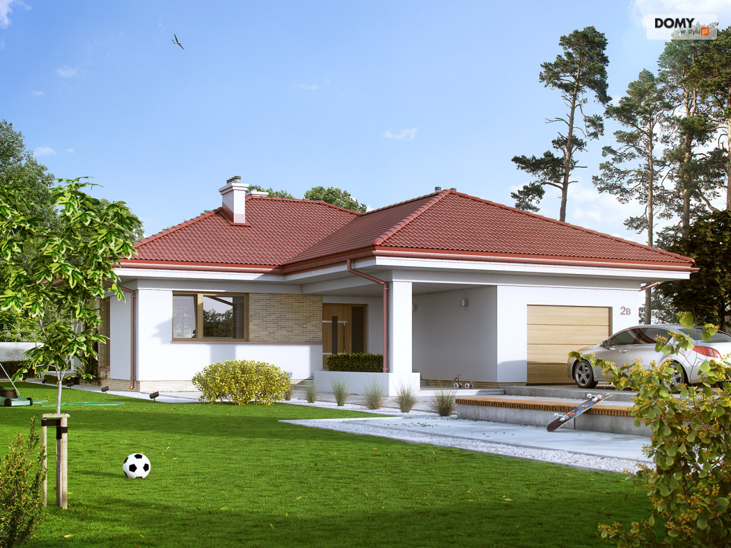 Jednorodzinny budynek mieszkalny, parterowy, niepodpiwniczony. Optymalny układ pomieszczeń zapewnia komfort 4-osobowej rodzinie. W części dziennej domu zaprojektowano kuchnię z jadalnią oraz salon otwierający się na zewnątrz poprzez szereg przeszkleń. Część nocna to trzy sypialnie oraz łazienka. W części gospodarczej przewidziano kotłownię oraz jednostanowiskowy garaż.