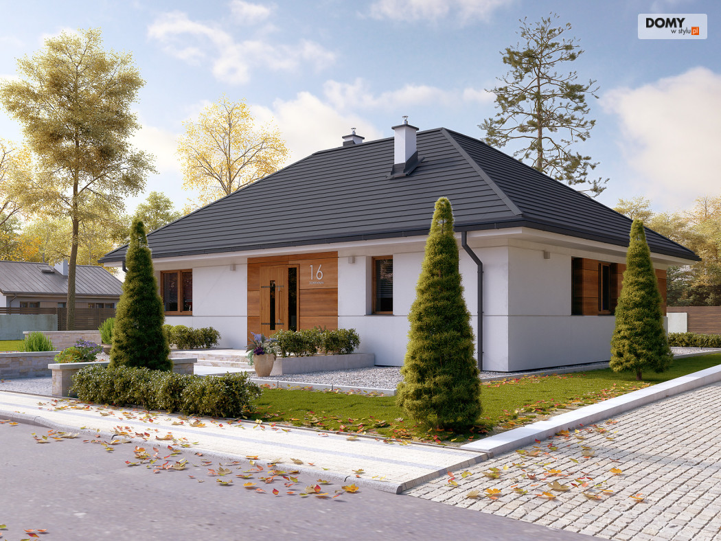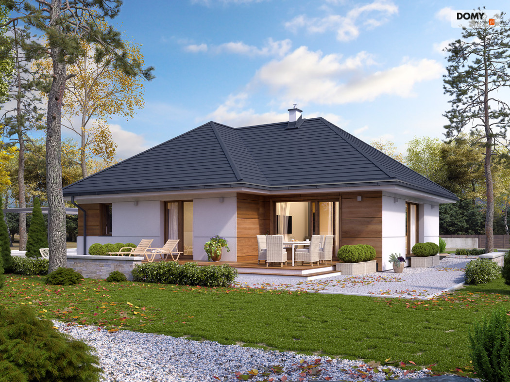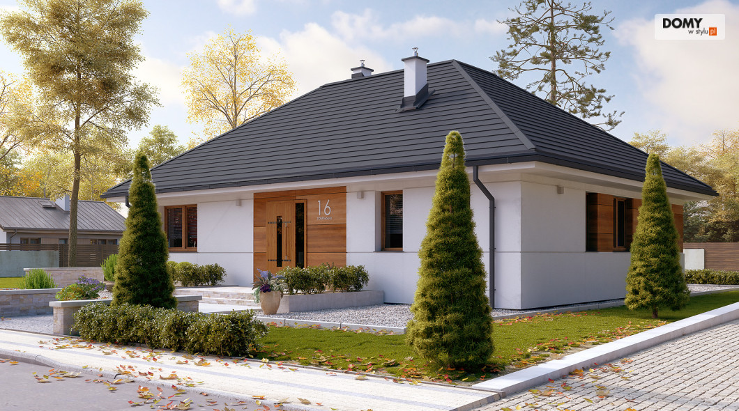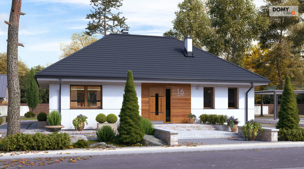 Parterowy projekt domu łączący nowoczesną estetykę z tradycyjną sprawdzoną funkcją. Biała bryła obiektu z drewnianymi akcentami na elewacji w połączeniu z grafitowym dachem i stolarką tworzy elegancką kolorystykę. Układ funkcjonalny to sprawdzony podział na strefę dzienną i nocną. Rozległy salon ze wspaniałym oknem może być miejscem wypoczynku całej rodziny. Kuchnia mimo iż połączona funkcjonalnie z salonem jest jednocześnie wizualnie wydzielona. W kuchni zaprojektowano spiżarnię. W części nocnej znajdziemy dwie sypialnie jedna z nich została zaprojektowana z oddzielną garderobą i łazienką. Na uwagę zasługuje wydzielona funkcjonalnie pralnia oraz duża kotłownia.