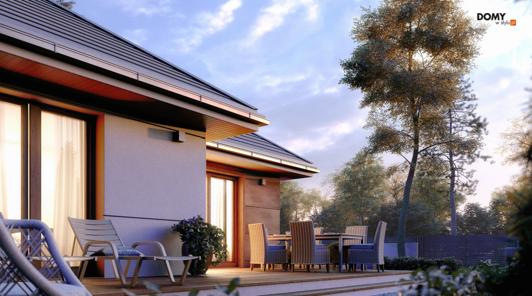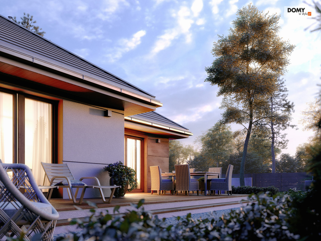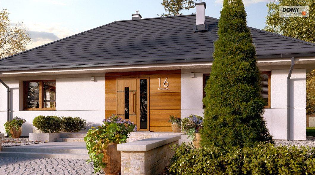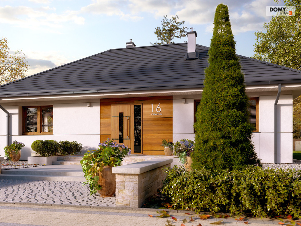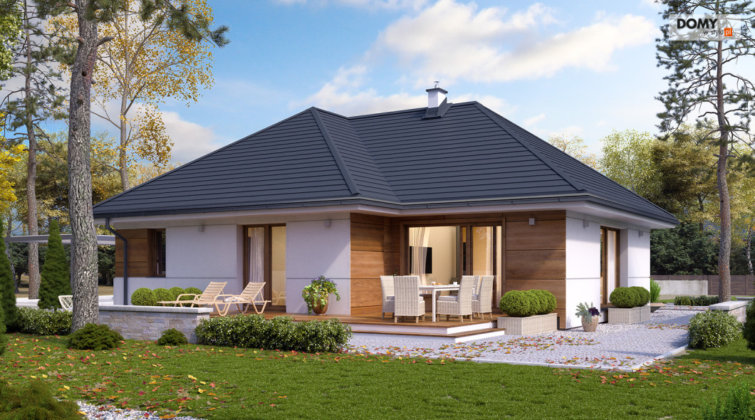 Parterowy projekt domu łączący nowoczesną estetykę z tradycyjną sprawdzoną funkcją. Biała bryła obiektu z drewnianymi akcentami na elewacji w połączeniu z grafitowym dachem i stolarką tworzy elegancką kolorystykę. Układ funkcjonalny to sprawdzony podział na strefę dzienną i nocną. Rozległy salon ze wspaniałym oknem może być miejscem wypoczynku całej rodziny. Kuchnia mimo iż połączona funkcjonalnie z salonem jest jednocześnie wizualnie wydzielona. W kuchni zaprojektowano spiżarnię. W części nocnej znajdziemy dwie sypialnie jedna z nich została zaprojektowana z oddzielną garderobą i łazienką. Na uwagę zasługuje wydzielona funkcjonalnie pralnia oraz duża kotłownia.