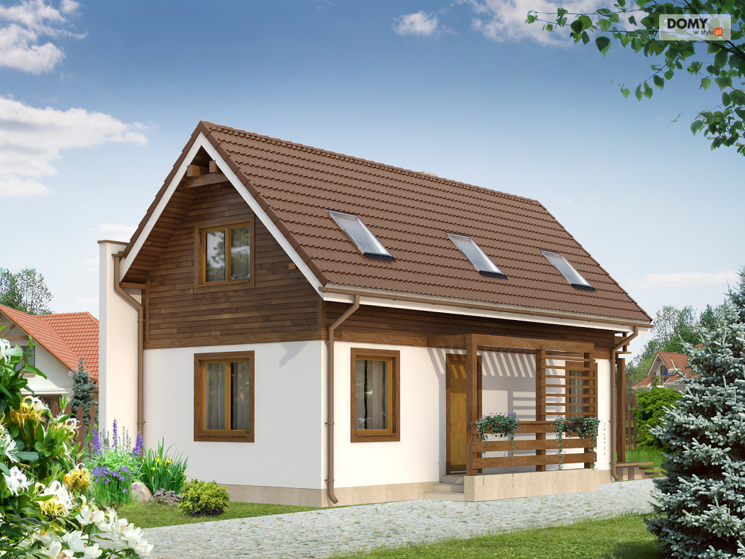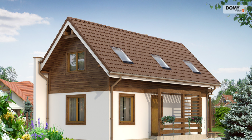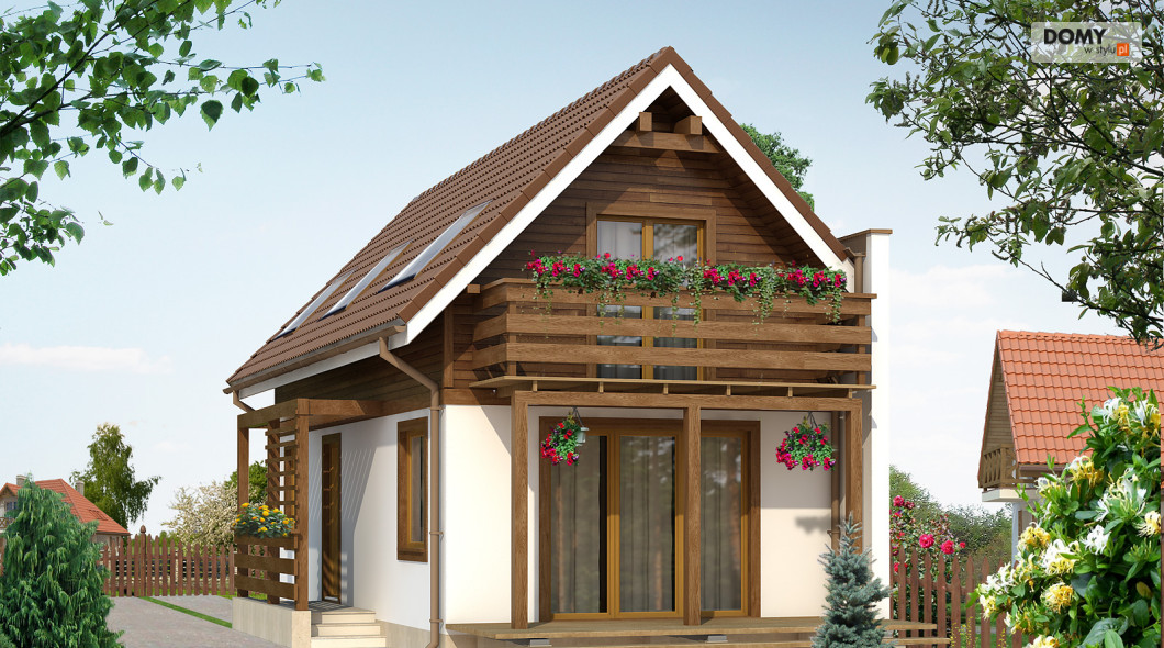 Budynek jednorodzinny z użytkowym poddaszem przeznaczony dla 3 – 4-osobowej rodziny. Typowy projekt na wąską działkę. Budynek ma ścianę przeciwpożarową, przez co można go postawić po granicy działki. Na parterze znajduje się salon z aneksem kuchennym, pokój i łazienka. Na poddaszu zaprojektowano dwa pokoje i wc.