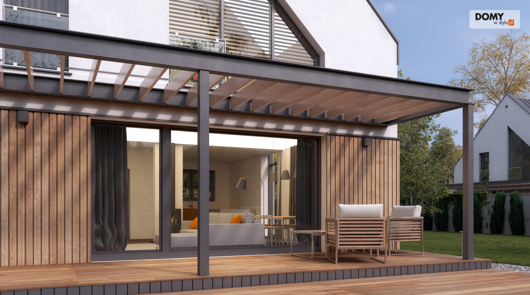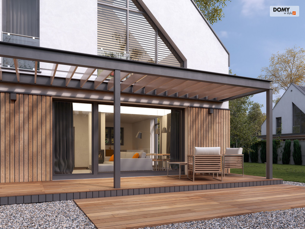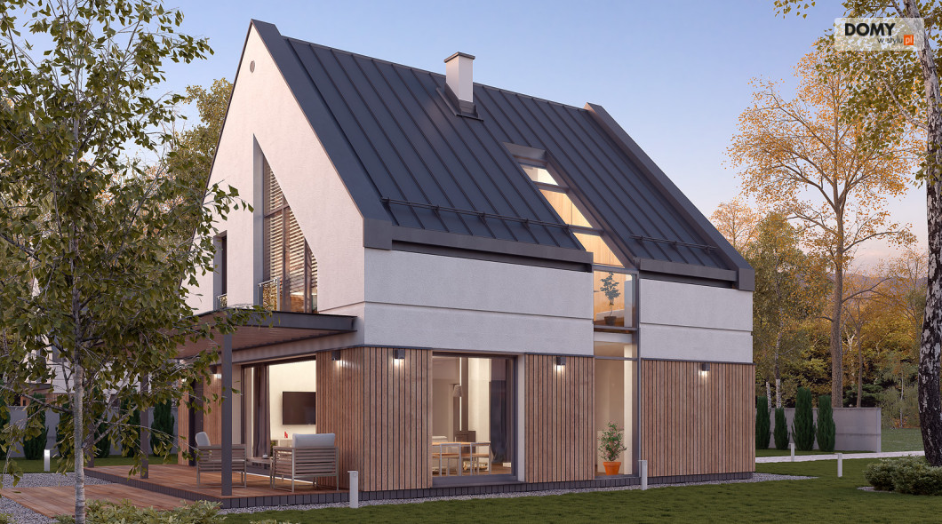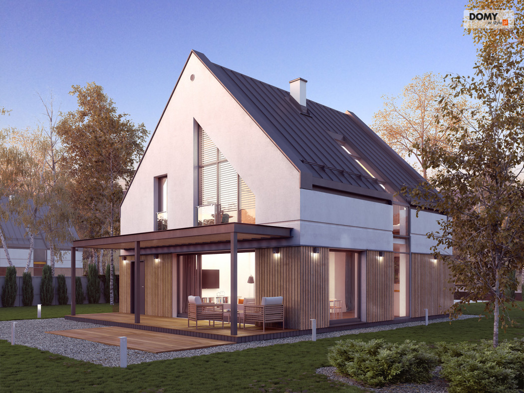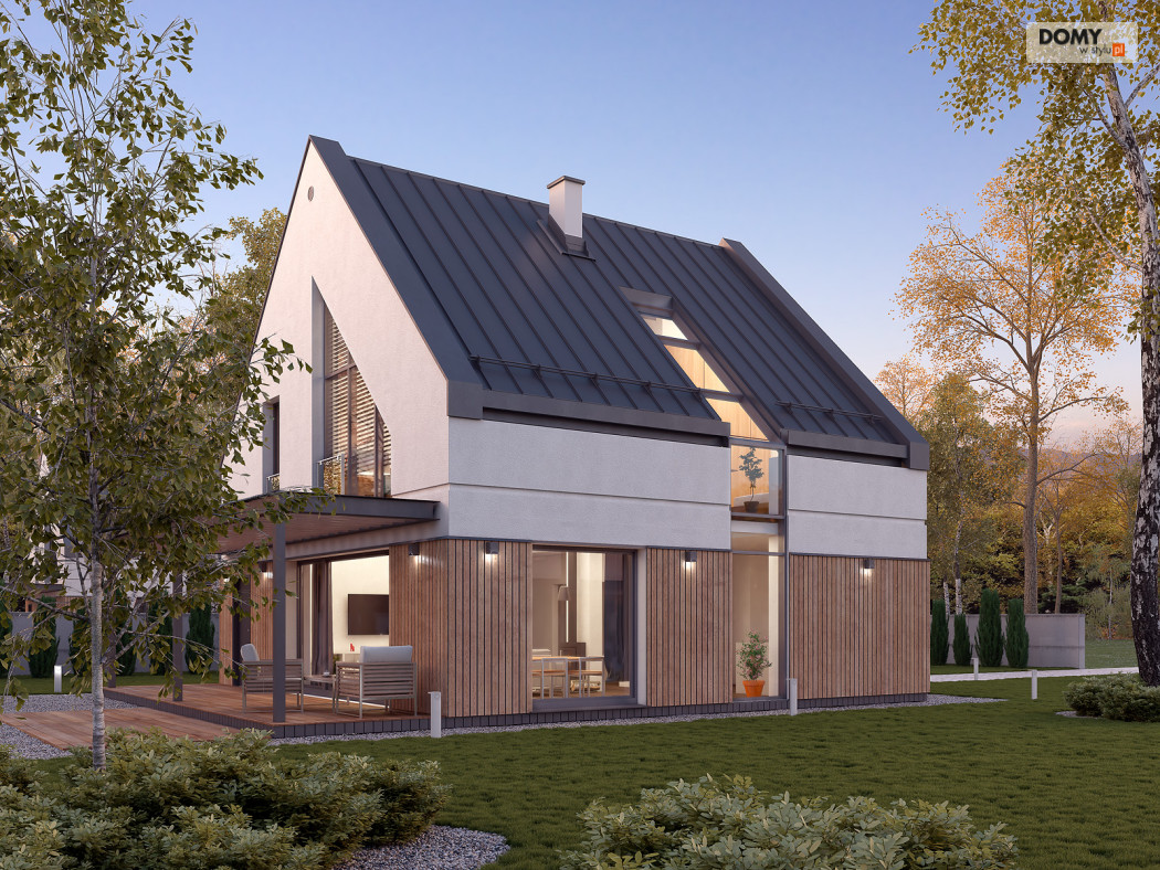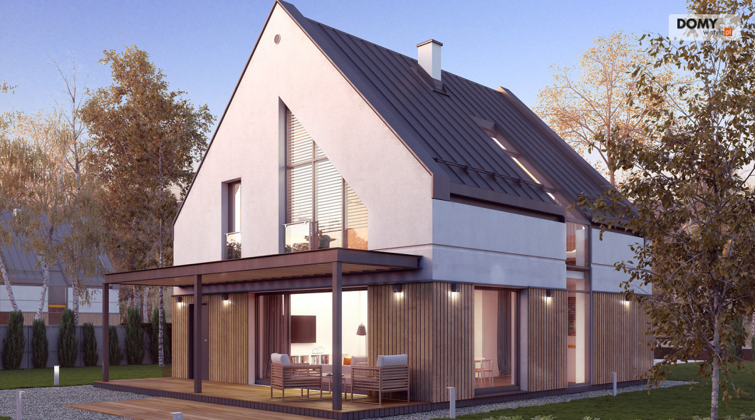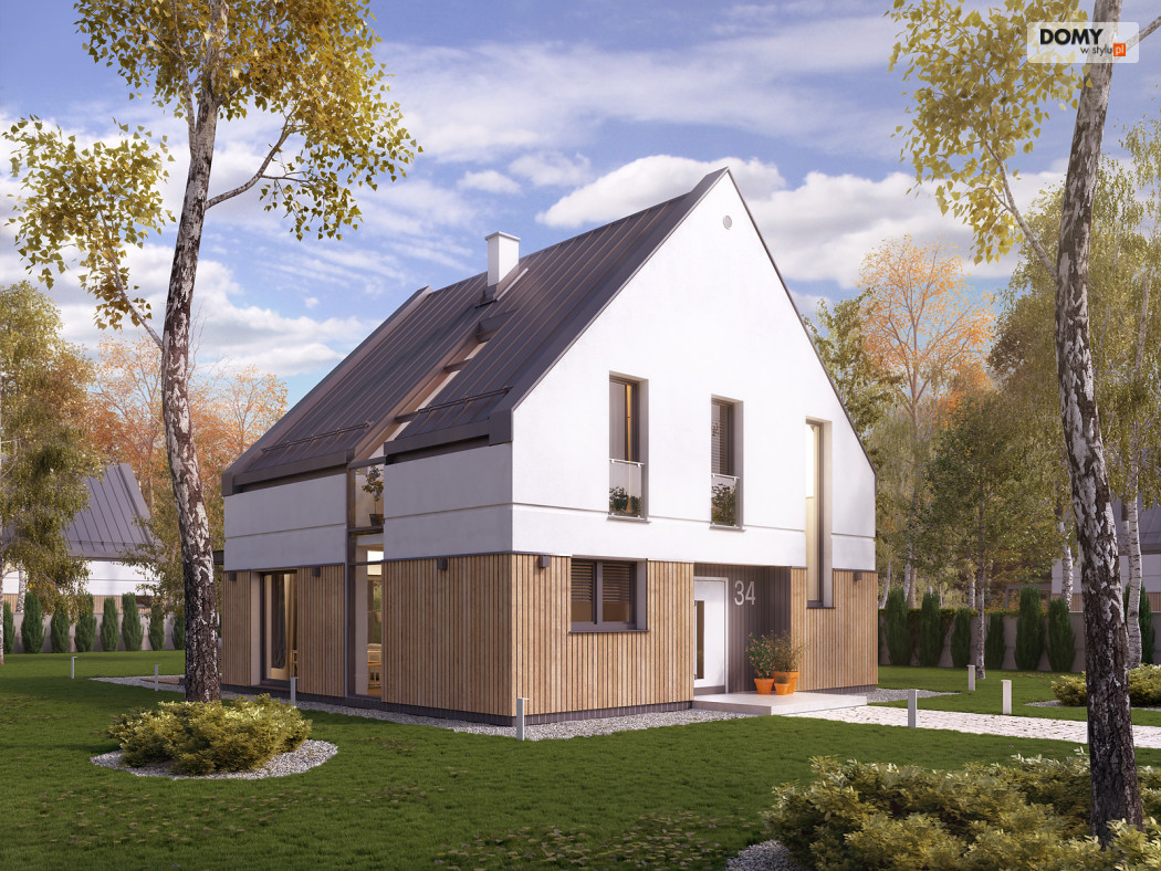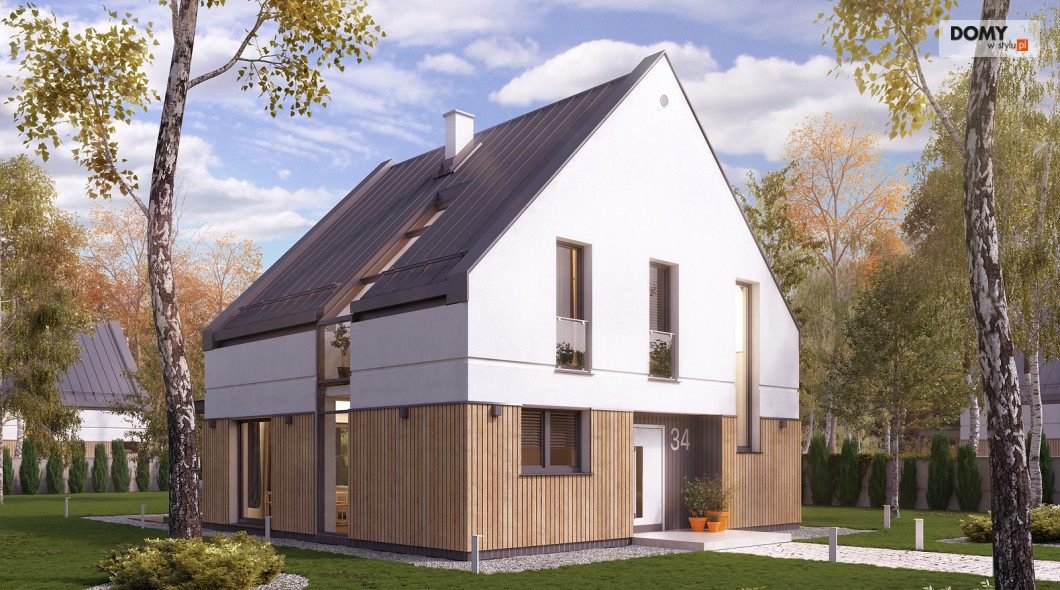 Projekt domu Bogatka mimo tradycyjnej bryły i klasycznego dwuspadowego dachu, dzięki starannie dobranym detalom prezentuje się niezwykle nowocześnie. Na uwagę zasługują duże przeszklenia na parterze, które rozświetlają część dzienną domu oraz skośne okna w dachu biegnące przez całą wysokość parteru. Okna te doświetlają zarówno kuchnię i korytarz na parterze, jak również jedną z sypialni i korytarz na poddaszu. Mimo niewielkich gabarytów wszystkie pomieszczenia w domu są niezwykle przestronne i funkcjonalne. Na parterze oprócz części dziennej domu, którą tworzą salon, jadalnia i kuchnia, pojawiło się niewielkie WC oraz duża kotłownia z niezależnym wyjściem na zewnątrz. W każdej sypialni na poddaszu zaprojektowano pojemną szafę, miejsce do pracy i wypoczynku. Układ funkcjonalny poddasza dopełnia łazienka z pełnym programem funkcjonalnym.