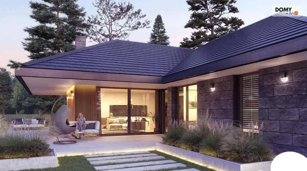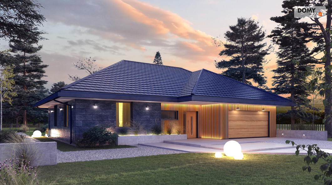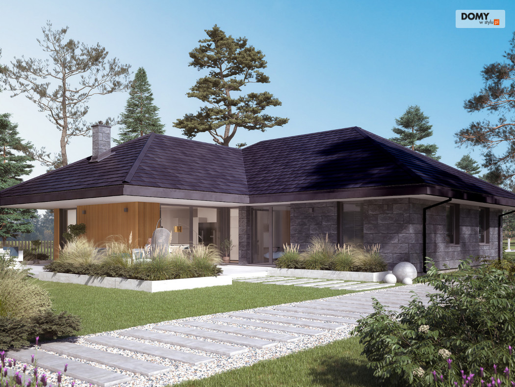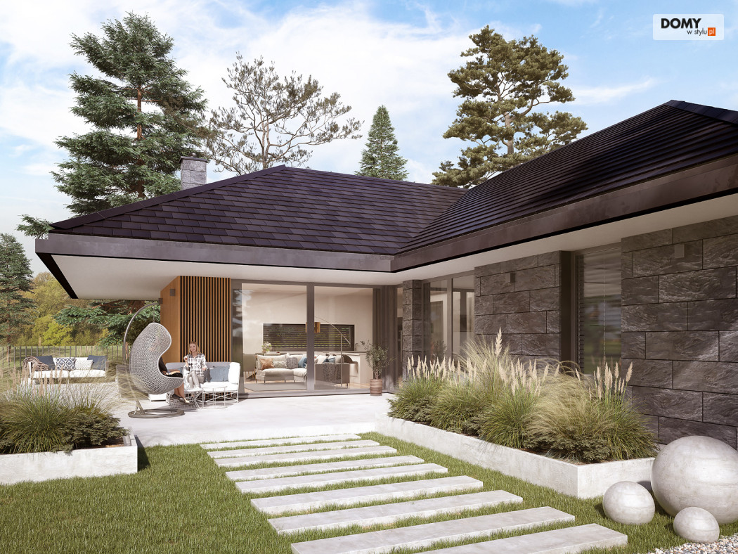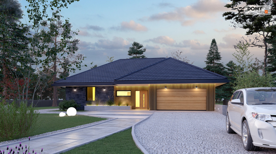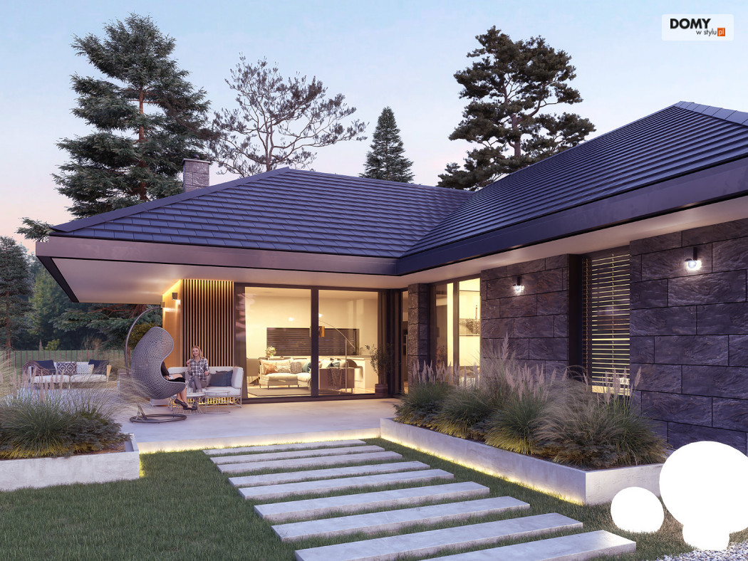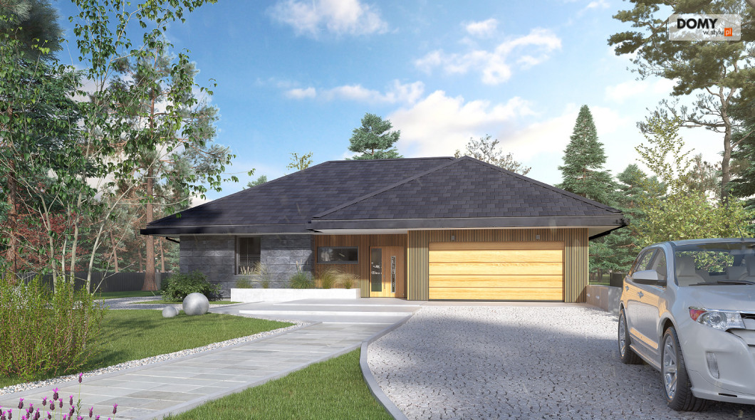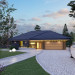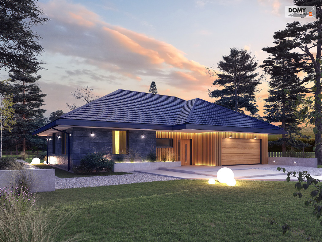 Projekt domu Ares to nowoczesny projekt domu parterowego, który wyróżnia się oryginalnym wykończeniem elewacji oraz funkcjonalnie zaplanowanym układem wnętrz. Zwarta bryła budynku została przykryta wielospadowym dachem pokrytym płaską dachówką ceramiczną. Na elewacji znajduje się kamień elewacyjny, który kolorystyką nawiązuje do grafitowego dachu oraz kontrastuje z pionowymi lamelami, którymi wykończono strefę wejściową oraz tarasową. Wnętrze zostało podzielone na strefę dzienną oraz nocną. Część dzienną tworzy otwarta przestrzeń składająca się z salonu, kuchni z wyspą oraz jadalni. Cechą charakterystyczną tej przestrzeni są panoramiczne przeszklenia otwierając wnętrze na otoczenie. Przy kuchni znajduje się pomieszczenie gospodarcze z funkcją spiżarni oraz pralni, które stanowi jednocześnie praktyczne przejście do garażu. W części nocnej wyróżniamy trzy sypialnie oraz ogólnodostępną łazienkę. Główna sypialnia tworzy prywatny apartament gospodarzy z garderobą, łazienką oraz bezpośrednim wyjściem na taras. Układ funkcjonalny domu uzupełnia dwustanowiskowy garaż z kotłownią.