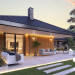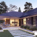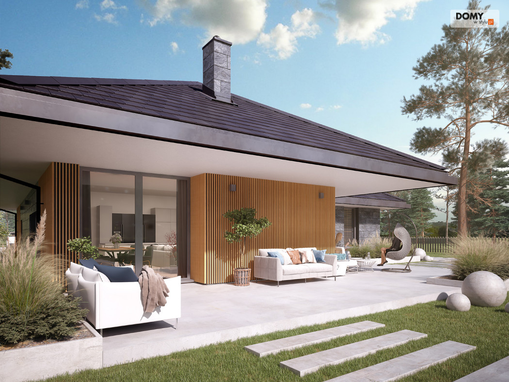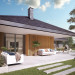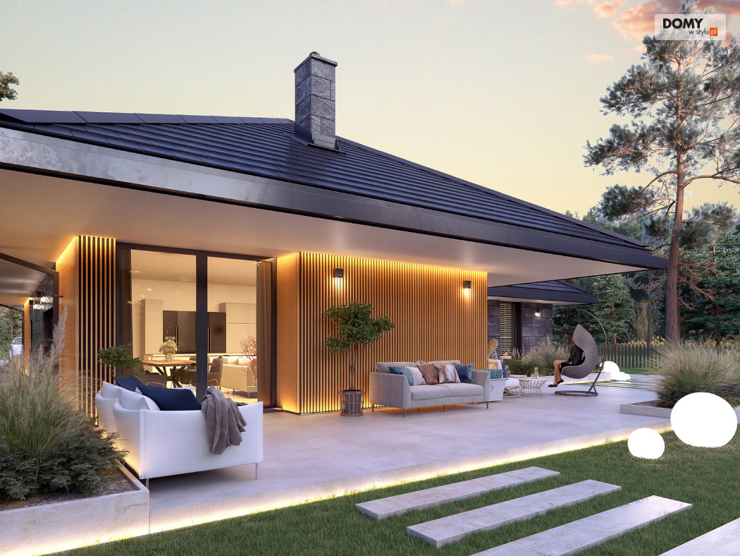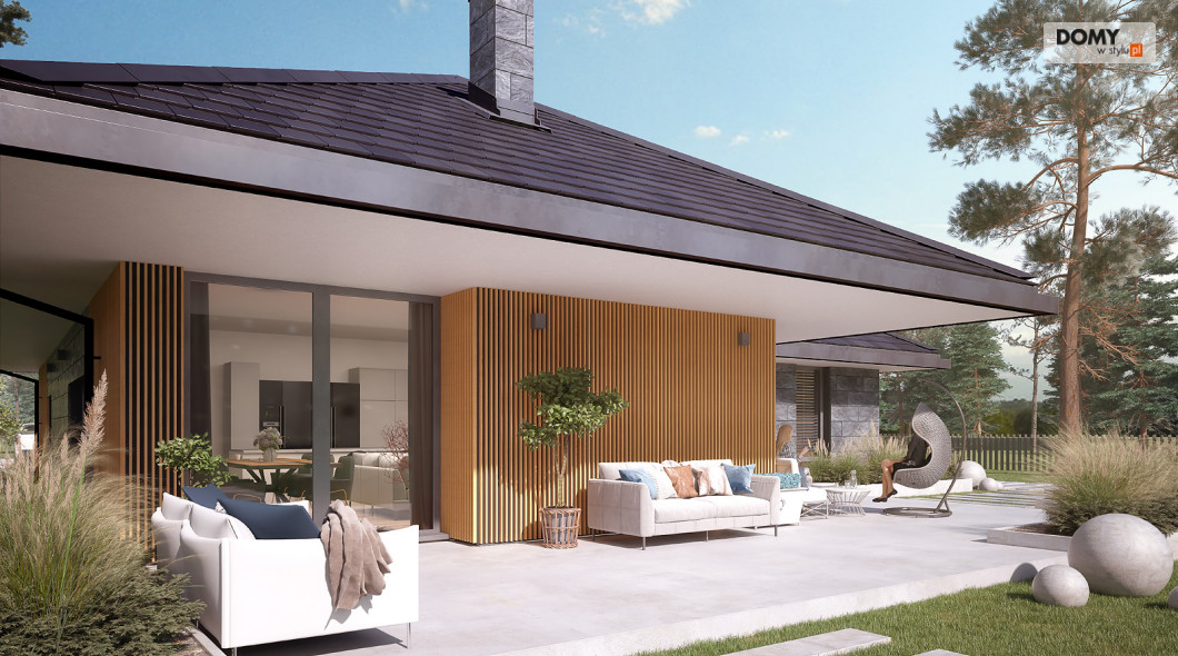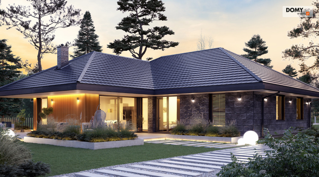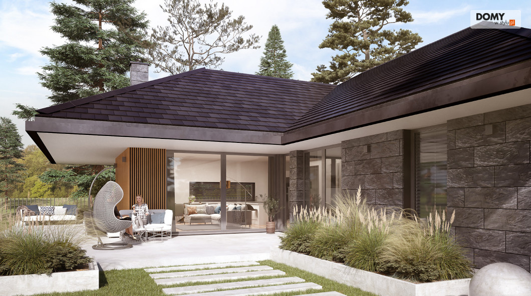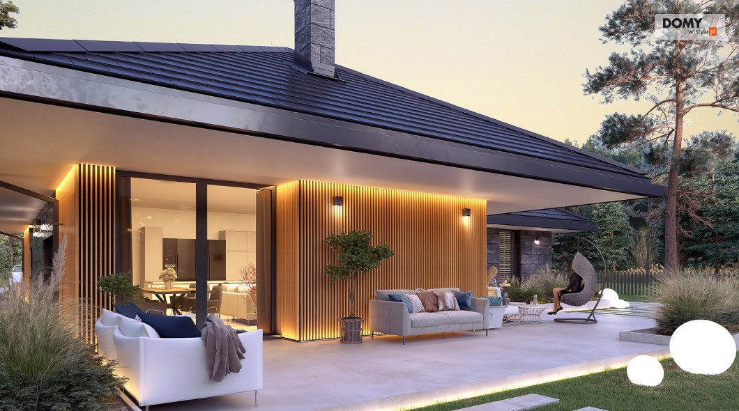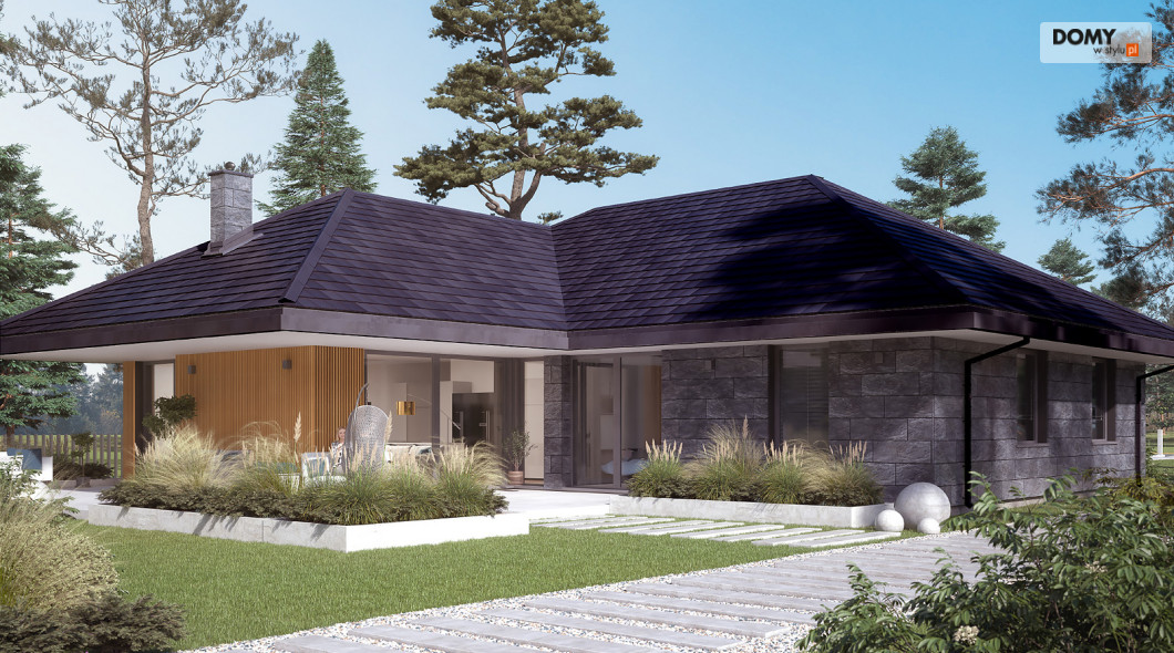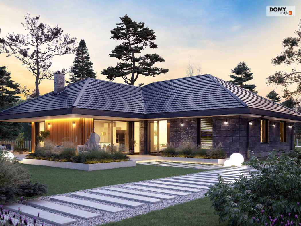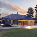 Projekt domu Ares to nowoczesny projekt domu parterowego, który wyróżnia się oryginalnym wykończeniem elewacji oraz funkcjonalnie zaplanowanym układem wnętrz. Zwarta bryła budynku została przykryta wielospadowym dachem pokrytym płaską dachówką ceramiczną. Na elewacji znajduje się kamień elewacyjny, który kolorystyką nawiązuje do grafitowego dachu oraz kontrastuje z pionowymi lamelami, którymi wykończono strefę wejściową oraz tarasową. Wnętrze zostało podzielone na strefę dzienną oraz nocną. Część dzienną tworzy otwarta przestrzeń składająca się z salonu, kuchni z wyspą oraz jadalni. Cechą charakterystyczną tej przestrzeni są panoramiczne przeszklenia otwierając wnętrze na otoczenie. Przy kuchni znajduje się pomieszczenie gospodarcze z funkcją spiżarni oraz pralni, które stanowi jednocześnie praktyczne przejście do garażu. W części nocnej wyróżniamy trzy sypialnie oraz ogólnodostępną łazienkę. Główna sypialnia tworzy prywatny apartament gospodarzy z garderobą, łazienką oraz bezpośrednim wyjściem na taras. Układ funkcjonalny domu uzupełnia dwustanowiskowy garaż z kotłownią.