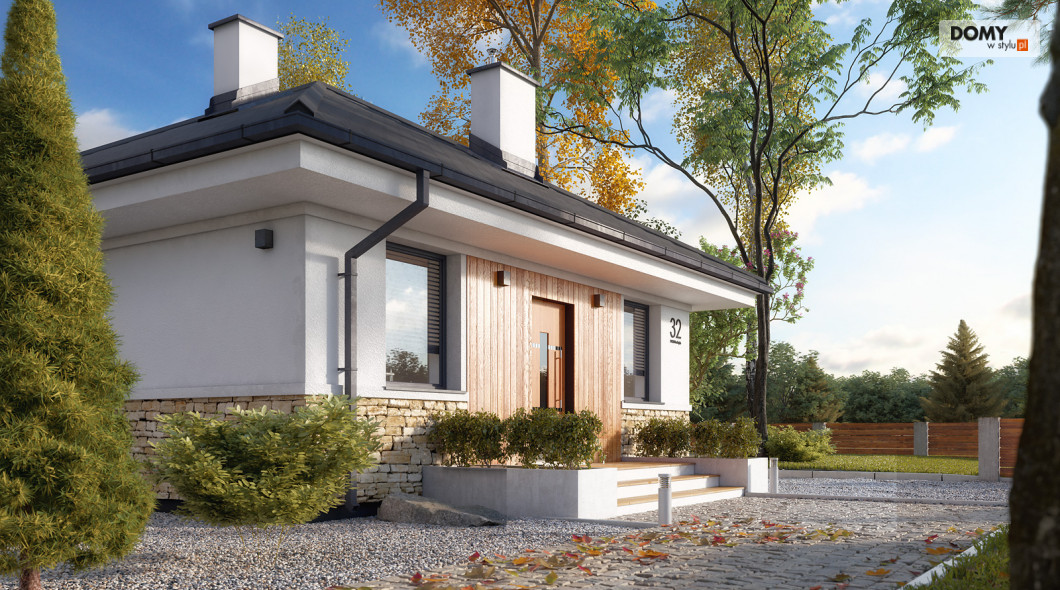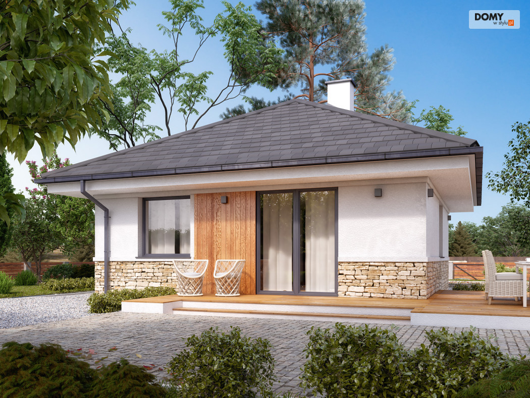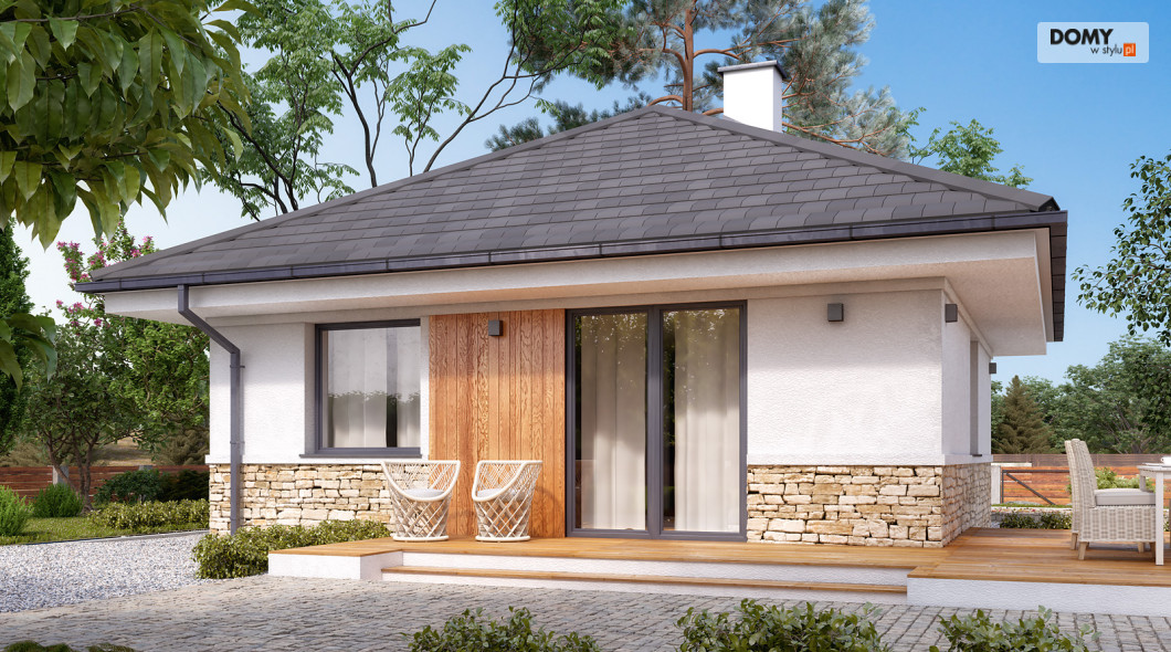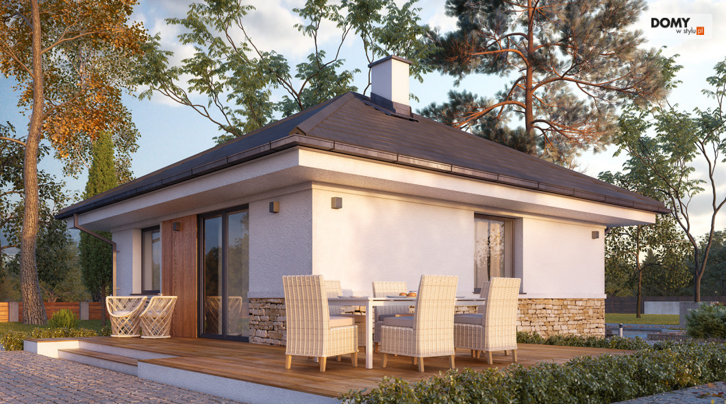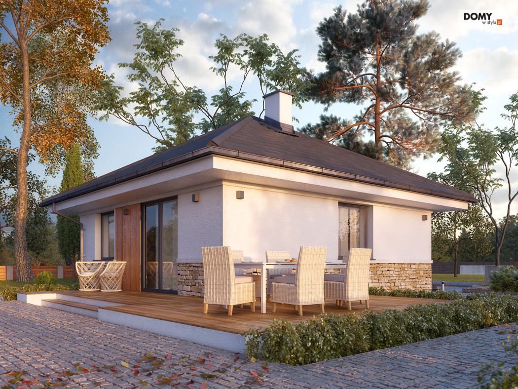 Projekt Imbir 5 to projekt domu parterowego, który stanowi alternatywę dla mieszkania w bloku. Prosta bryła przykryta dwuspadowym dachem czynią ten projekt niedrogim w realizacji oraz utrzymaniu. Pomimo niedużej powierzchni układ funkcjonalny zapewnia maksymalny komfort użytkowania. Z przedsionka znajduje się wejście do otwartej strefy dziennej z kuchnią połączoną z jadalnią oraz salonem. W salonie przewidziano miejsce na narożną kanapę do odpoczynku przy kominku oraz kącik telewizyjny. W projekcie znajduje się również sypialnia, która pomieści duże łóżko oraz pojemną szafę. Uzupełnieniem układu funkcjonalnego jest łazienka oraz pomieszczenie gospodarcze dostępne z przedsionka. Dodatkowym atutem projektu jest taras okalający budynek z dwóch stron, który dzięki przesuwnym drzwiom może stanowić przedłużenie salonu w ciepłe letnie dni.