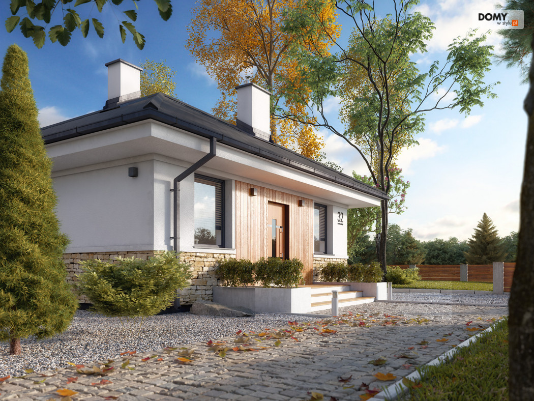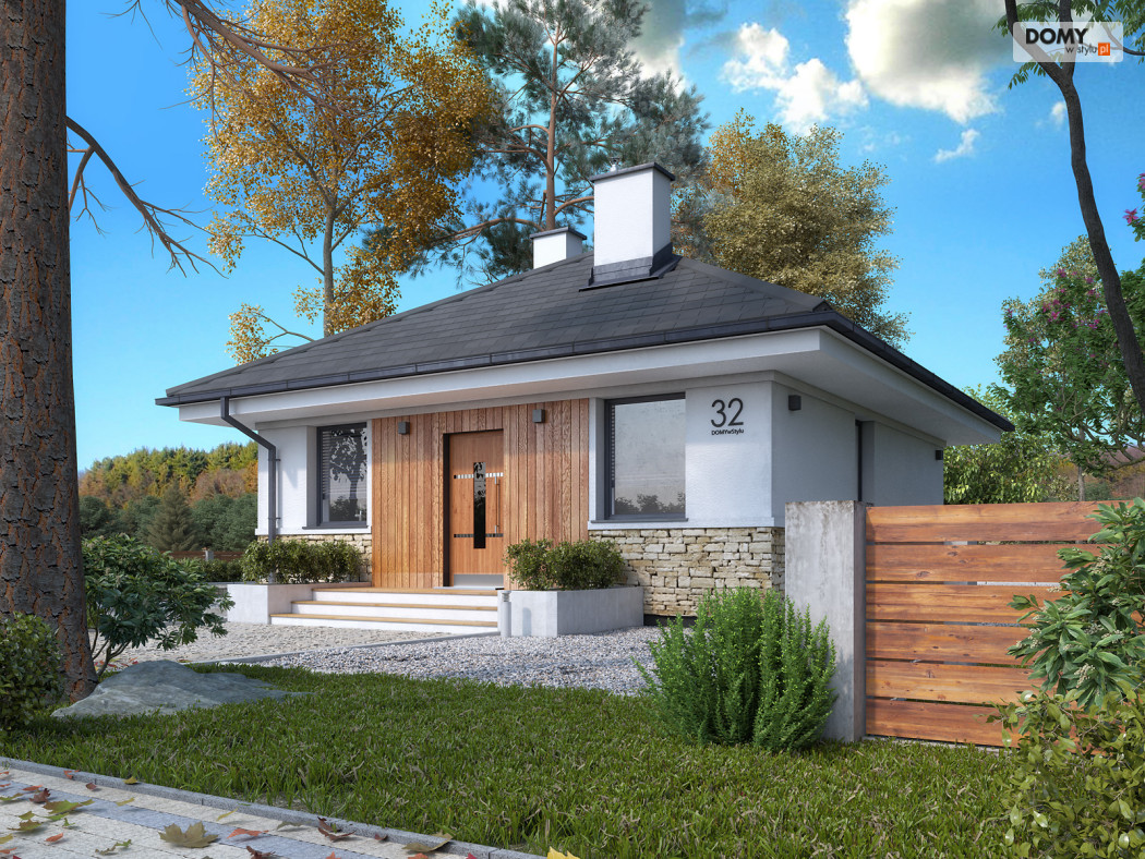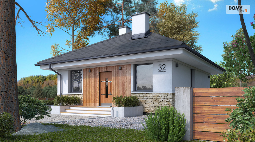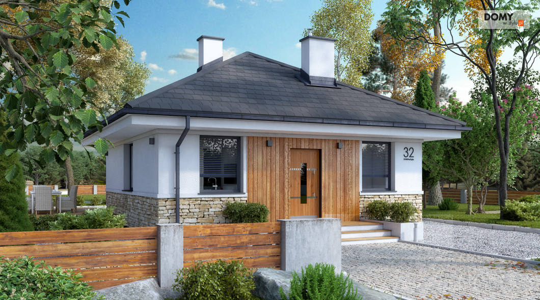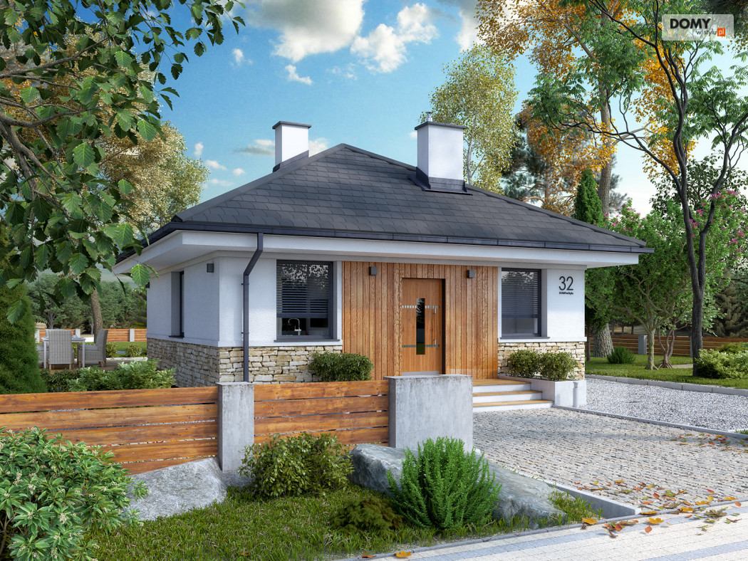 Projekt Imbir 5 to projekt domu parterowego, który stanowi alternatywę dla mieszkania w bloku. Prosta bryła przykryta dwuspadowym dachem czynią ten projekt niedrogim w realizacji oraz utrzymaniu. Pomimo niedużej powierzchni układ funkcjonalny zapewnia maksymalny komfort użytkowania. Z przedsionka znajduje się wejście do otwartej strefy dziennej z kuchnią połączoną z jadalnią oraz salonem. W salonie przewidziano miejsce na narożną kanapę do odpoczynku przy kominku oraz kącik telewizyjny. W projekcie znajduje się również sypialnia, która pomieści duże łóżko oraz pojemną szafę. Uzupełnieniem układu funkcjonalnego jest łazienka oraz pomieszczenie gospodarcze dostępne z przedsionka. Dodatkowym atutem projektu jest taras okalający budynek z dwóch stron, który dzięki przesuwnym drzwiom może stanowić przedłużenie salonu w ciepłe letnie dni.