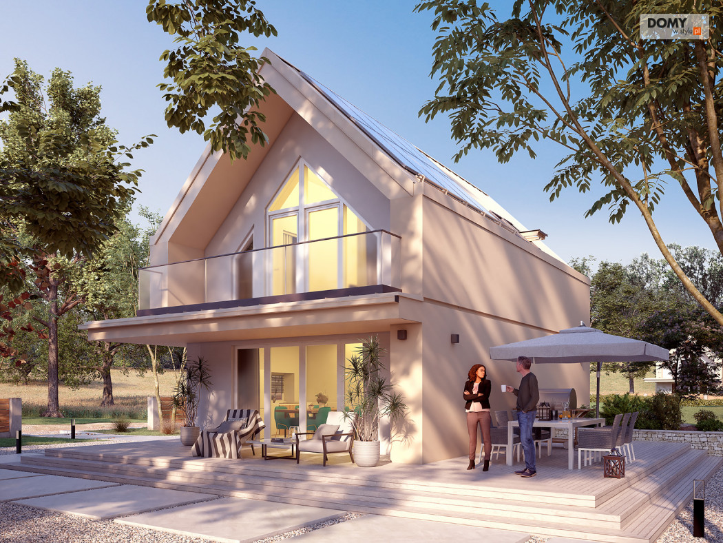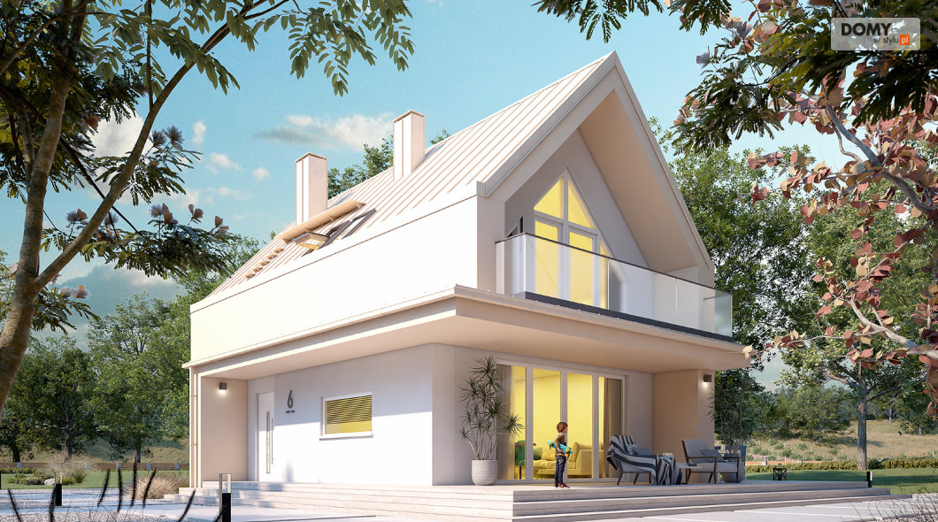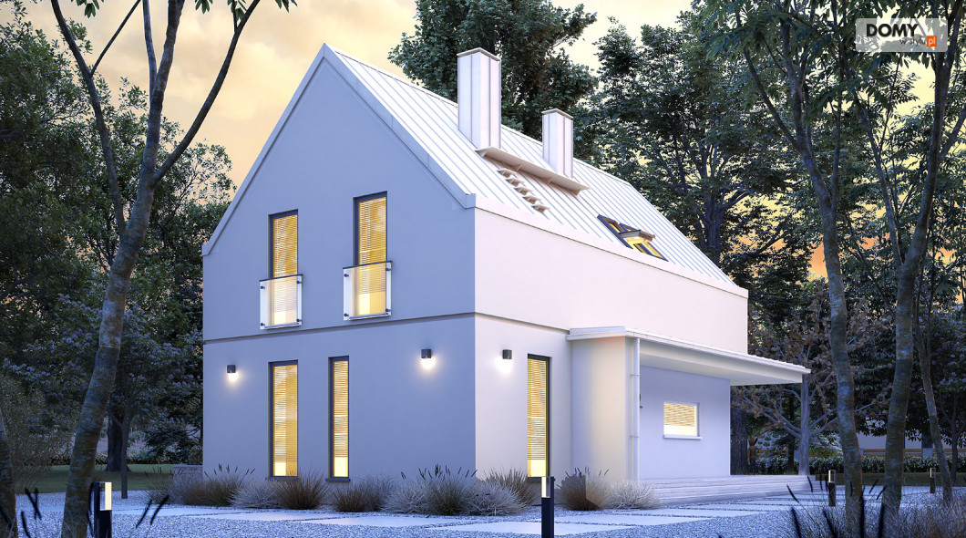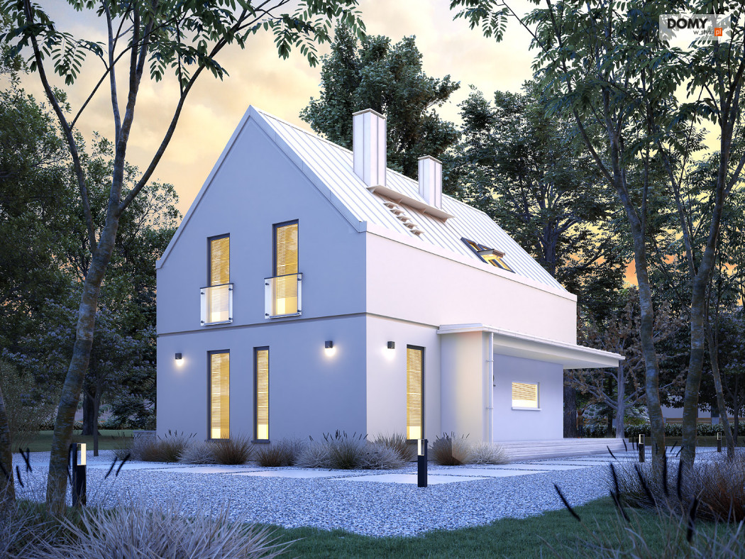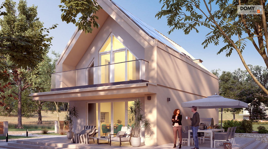 Projekt domu Malutki 8 to projekt domu z użytkowym poddaszem, zaprojektowany w stylu nowoczesnej stodoły. Prosta bryła budynku została przykryta dwuspadowym dachem bez okapów, który przykryto blachą na rąbek w kolorze piaskowym. Elewacja domu została wykończona tynkiem, którego kolorystyka jest spójna z dachem. Oryginalny wygląd budynku, w połączeniu z wysokimi przeszkleniami oraz funkcjonalnym układem wnętrz podkreślają nowoczesny charakter domu. Układ funkcjonalny został podzielony na strefę dzienną na parterze oraz nocną na poddaszu. Strefa dzienna to połączenie salonu z jadalnią oraz kuchnią z przylegającą do niej spiżarnią. Układ parteru uzupełnia sypialnia, łazienka oraz pomieszczenie gospodarcze z wejściem przez przedsionek. Strefa nocna na poddaszu składa się z trzech sypialni oraz łazienki. Główna sypialnia posiada dodatkowo garderobę oraz wyjście na balkon stanowiący jednocześnie zadaszenie tarasu na parterze.