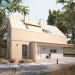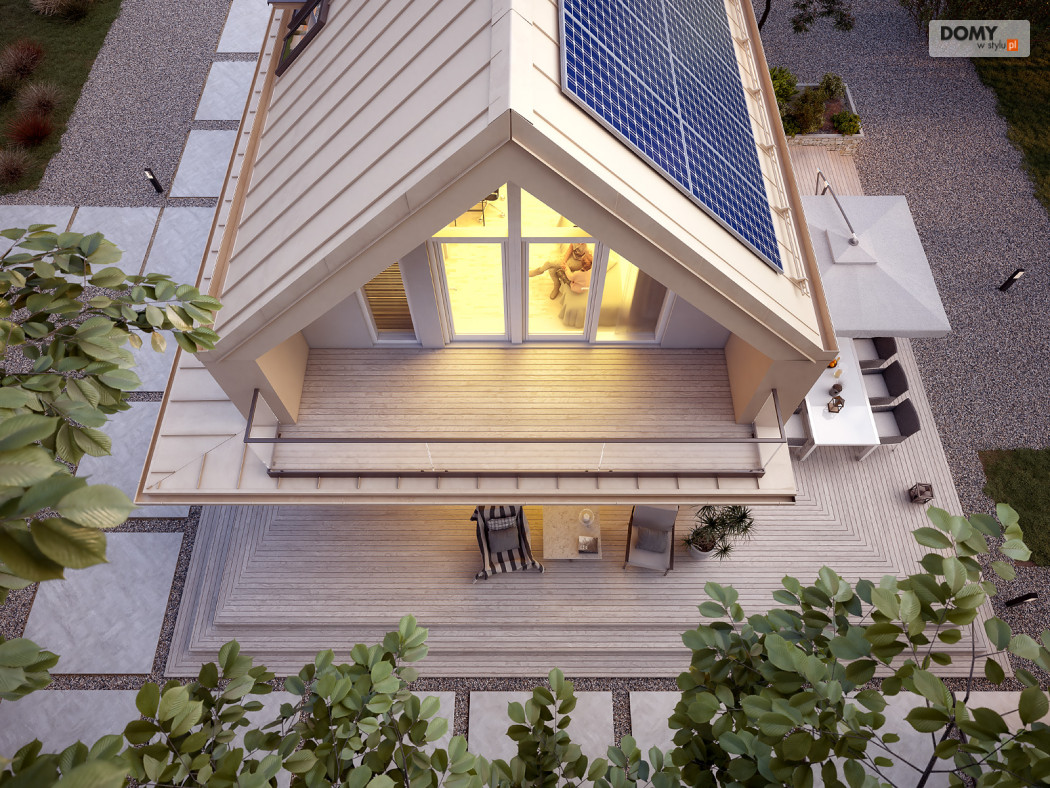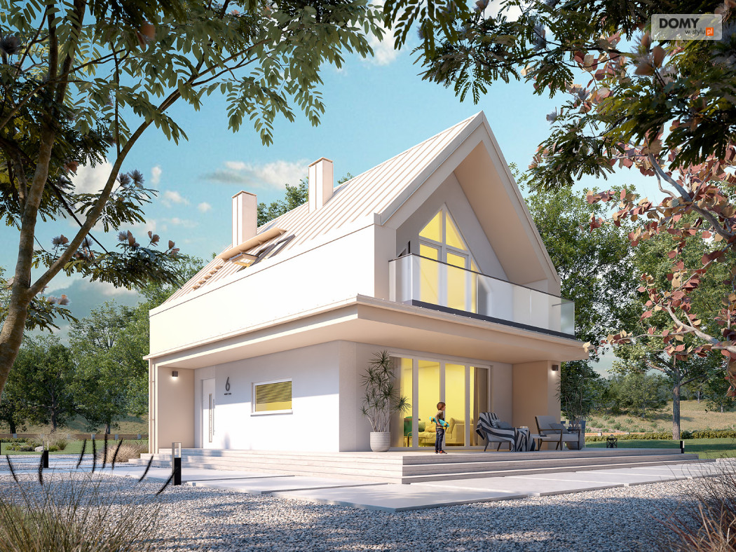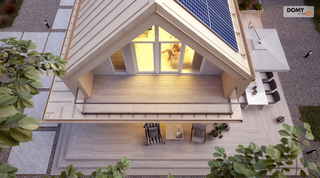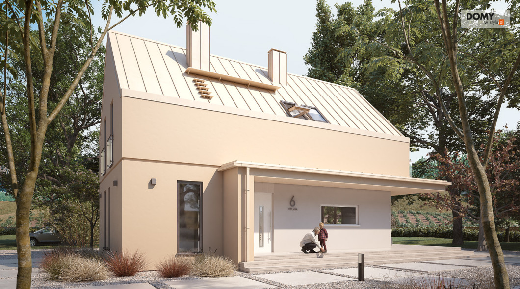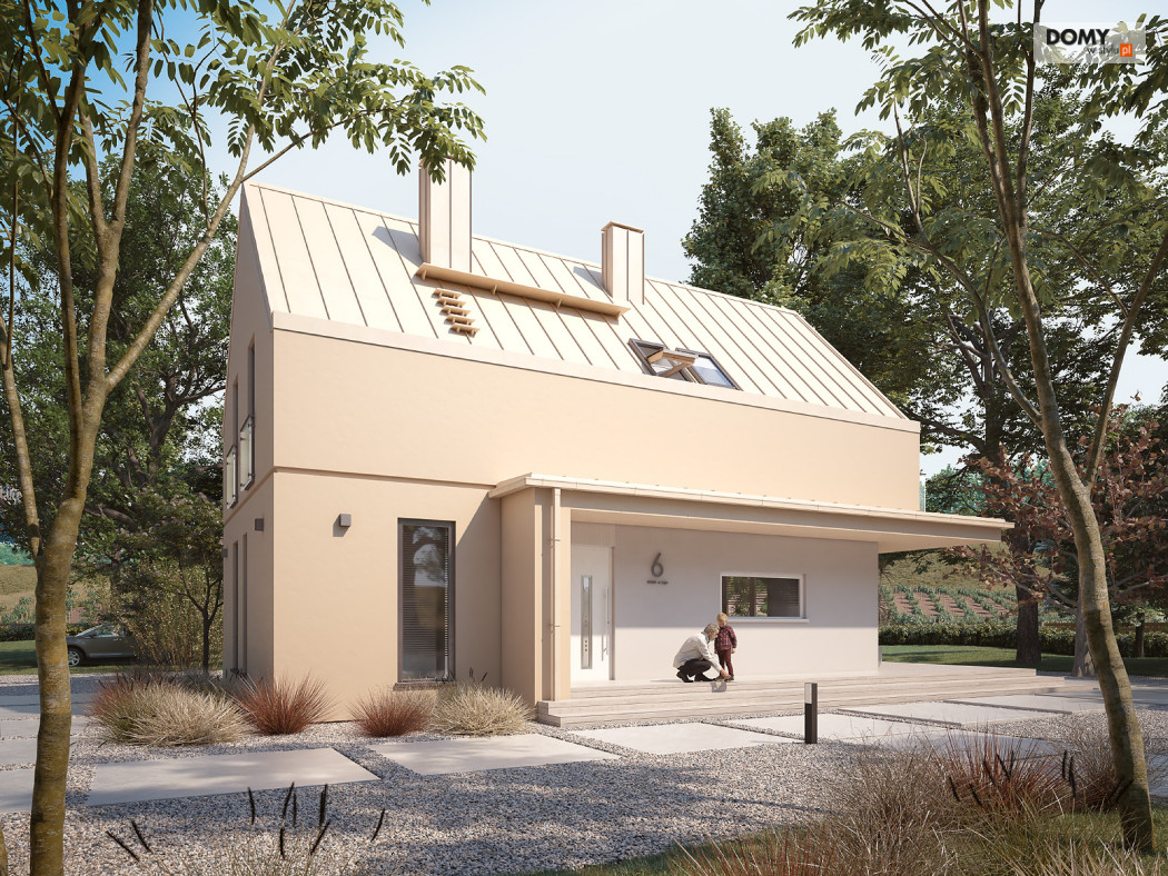 Projekt domu Malutki 8 to projekt domu z użytkowym poddaszem, zaprojektowany w stylu nowoczesnej stodoły. Prosta bryła budynku została przykryta dwuspadowym dachem bez okapów, który przykryto blachą na rąbek w kolorze piaskowym. Elewacja domu została wykończona tynkiem, którego kolorystyka jest spójna z dachem. Oryginalny wygląd budynku, w połączeniu z wysokimi przeszkleniami oraz funkcjonalnym układem wnętrz podkreślają nowoczesny charakter domu. Układ funkcjonalny został podzielony na strefę dzienną na parterze oraz nocną na poddaszu. Strefa dzienna to połączenie salonu z jadalnią oraz kuchnią z przylegającą do niej spiżarnią. Układ parteru uzupełnia sypialnia, łazienka oraz pomieszczenie gospodarcze z wejściem przez przedsionek. Strefa nocna na poddaszu składa się z trzech sypialni oraz łazienki. Główna sypialnia posiada dodatkowo garderobę oraz wyjście na balkon stanowiący jednocześnie zadaszenie tarasu na parterze.