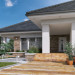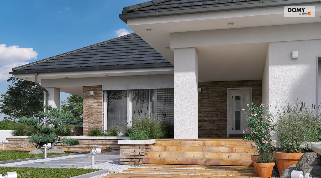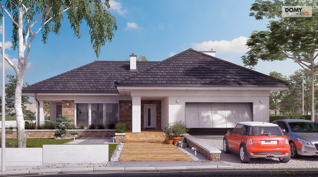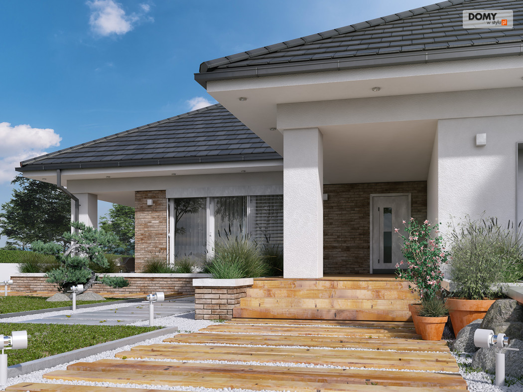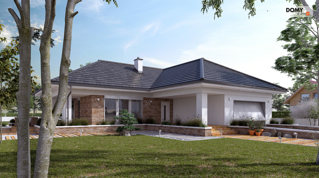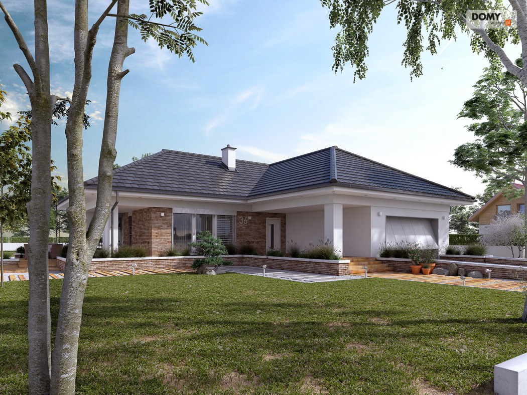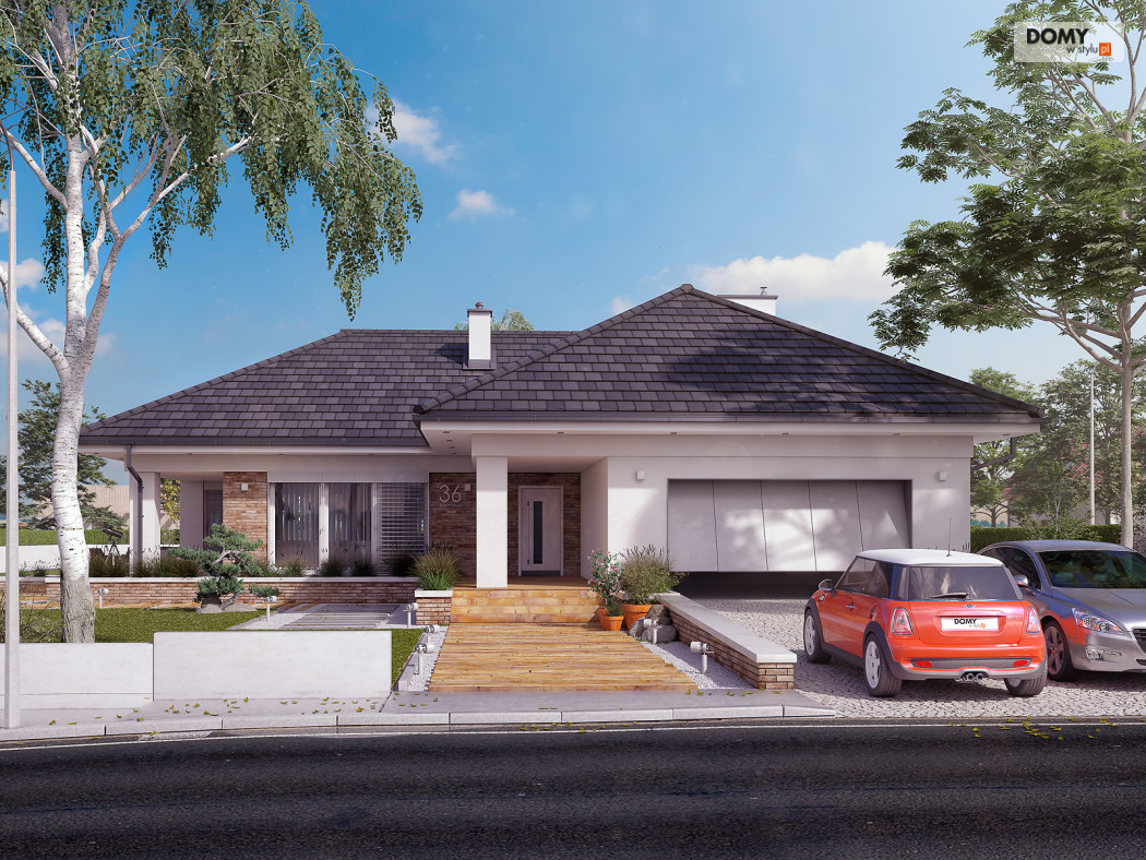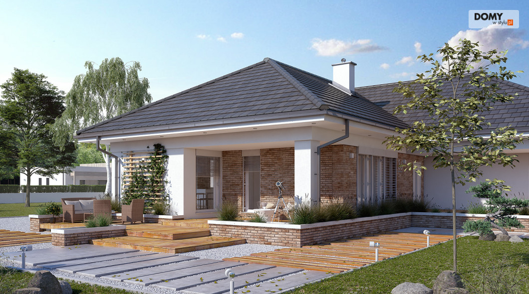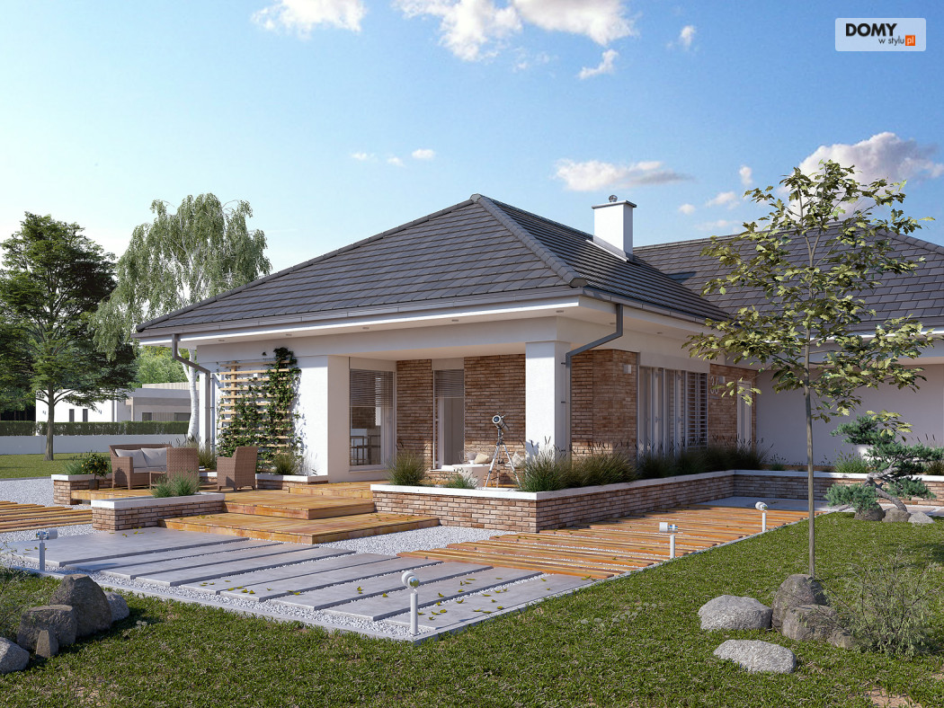 Aksamit 8 to projekt nowoczesnego domu parterowego. Układ funkcjonalny został dostosowany do potrzeb 5-osobowej rodziny. Bryła budynku przykryta wielospadowym dachem. Część dzienną tworzą przestronny salon z kominkiem, otwarta kuchnia oraz jadalnia z bezpośrednim wyjściem na zadaszony taras. Część nocna to cztery wygodne sypialnie oraz wspólna łazienka. Jedna z sypialni posiada własną łazienkę i garderobę tzw. apartament gospodarzy. W części gospodarczej przewidziano dużą kotłownię z niezależnym wyjściem na zewnątrz oraz dwustanowiskowy garaż.