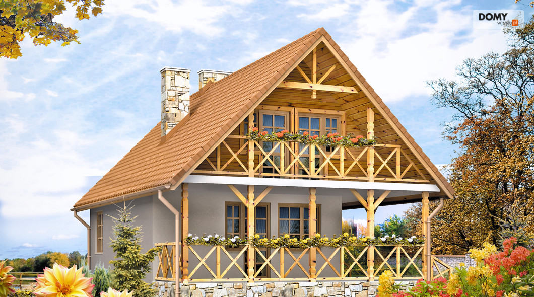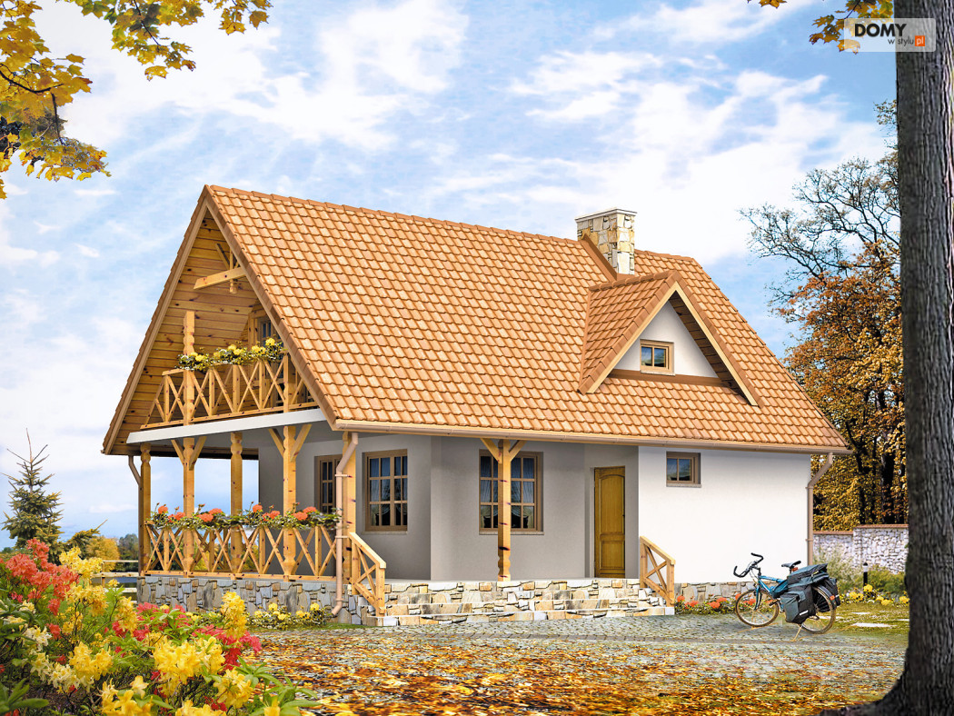 Mały dom jednorodzinny lub letniskowy z użytkowym poddaszem i możliwością podpiwniczenia. Prosty, funkcjonalny układ. Duży taras.