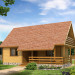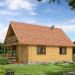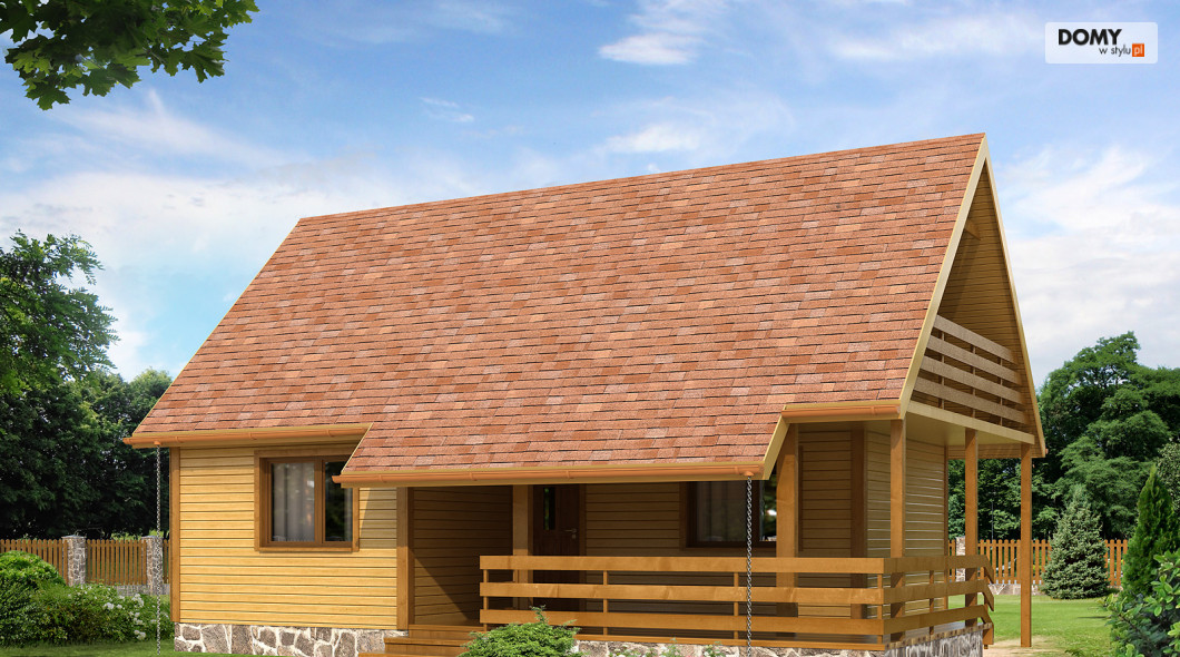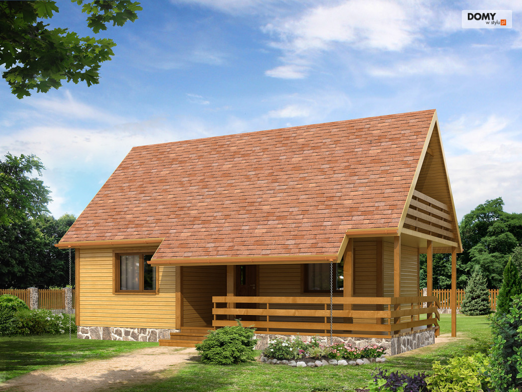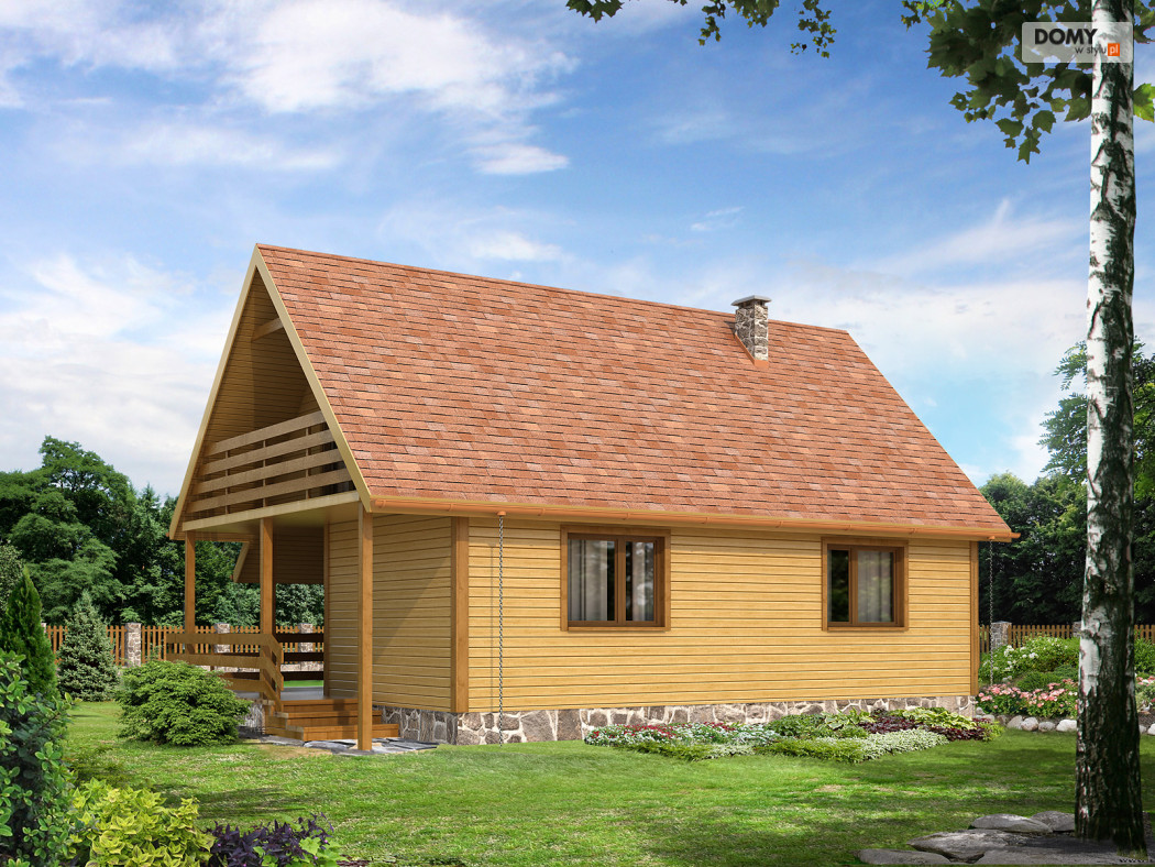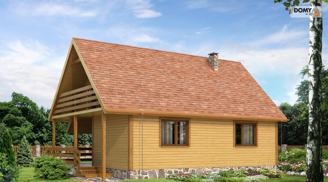 Mały letniskowy domek z poddaszem i dużym zadaszonym tarasem.