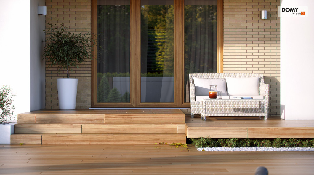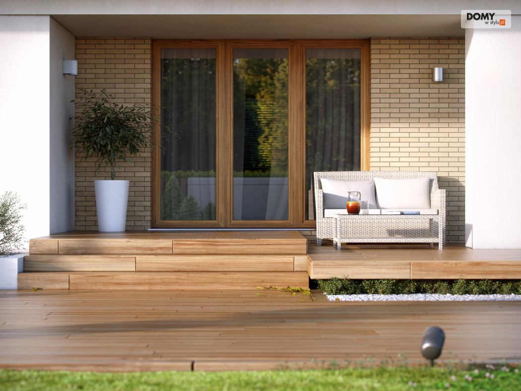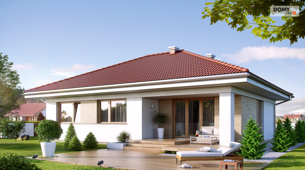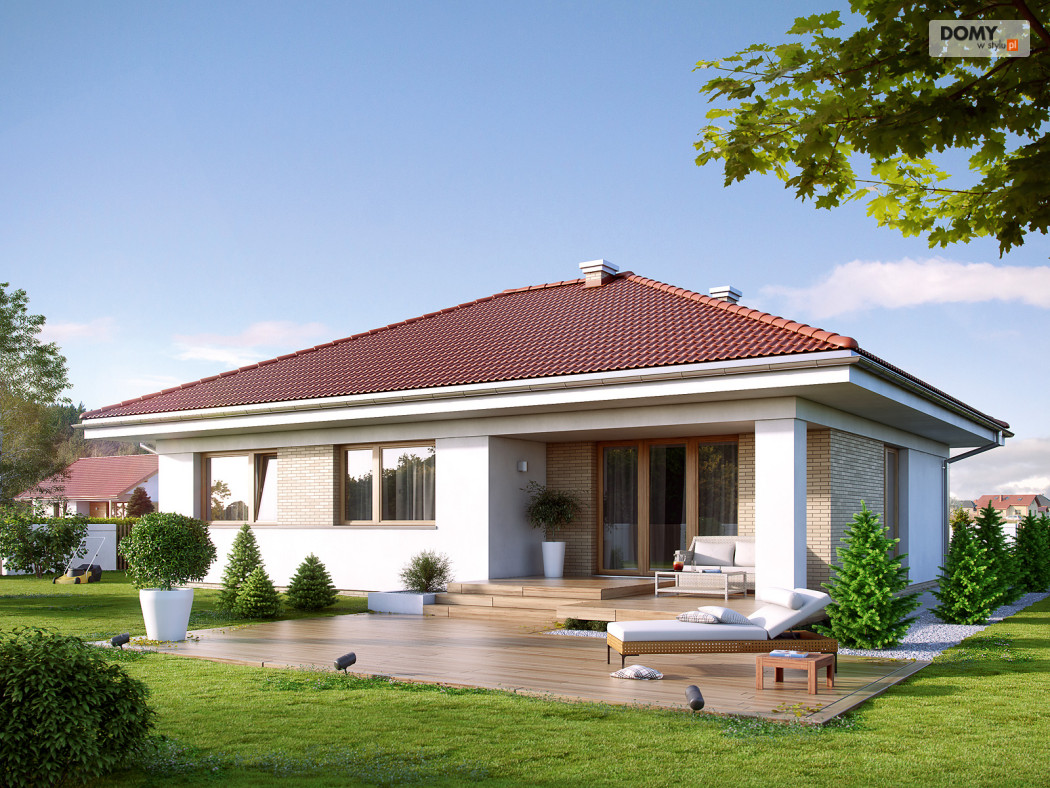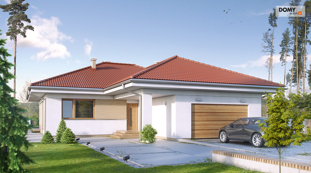 Jednorodzinny budynek mieszkalny, parterowy, niepodpiwniczony. Optymalny układ pomieszczeń zapewnia komfort 4-osobowej rodzinie. W części dziennej domu zaprojektowano kuchnię ze spiżarnią oraz salon z jadalnią otwierający się na zewnątrz poprzez szereg przeszkleń. Część nocna to trzy sypialnie oraz łazienka. W części gospodarczej przewidziano kotłownię oraz dwustanowiskowy garaż.