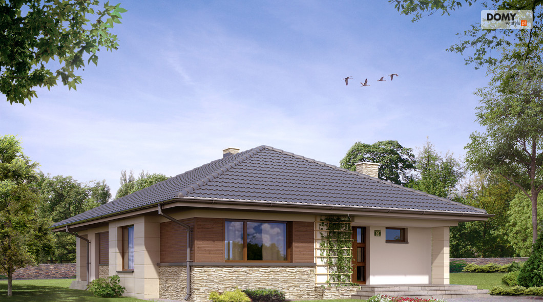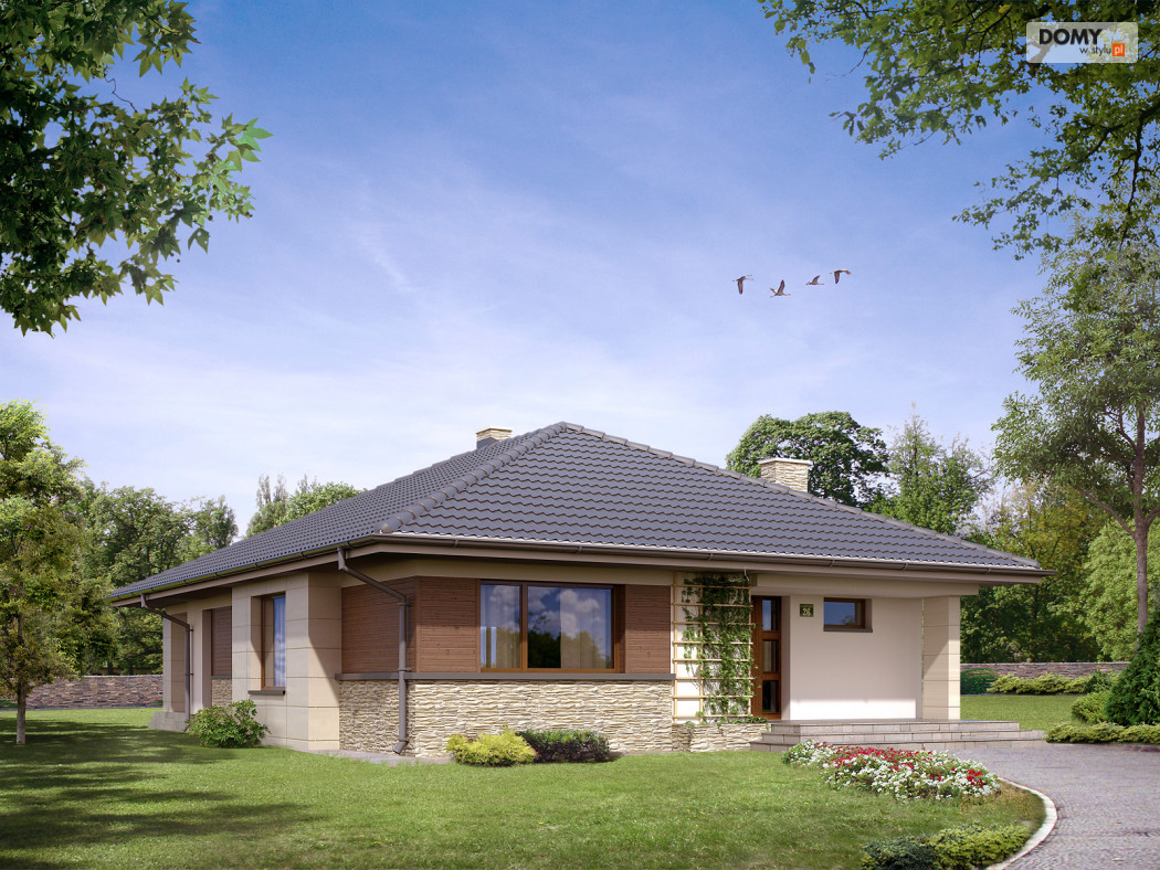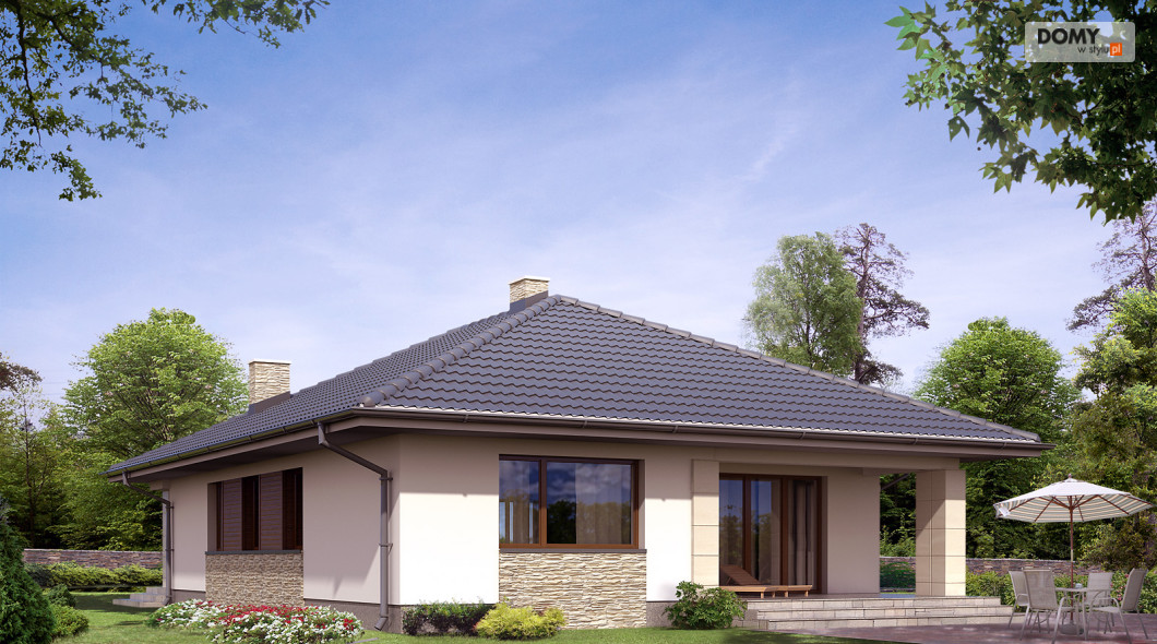 Dom jednorodzinny, parterowy. Posiada zadaszony taras dostępny z salonu. W projekcie zastosowano wyraźny podział na część dzienną i nocną. Dom idealny dla 4-osobowej rodziny.