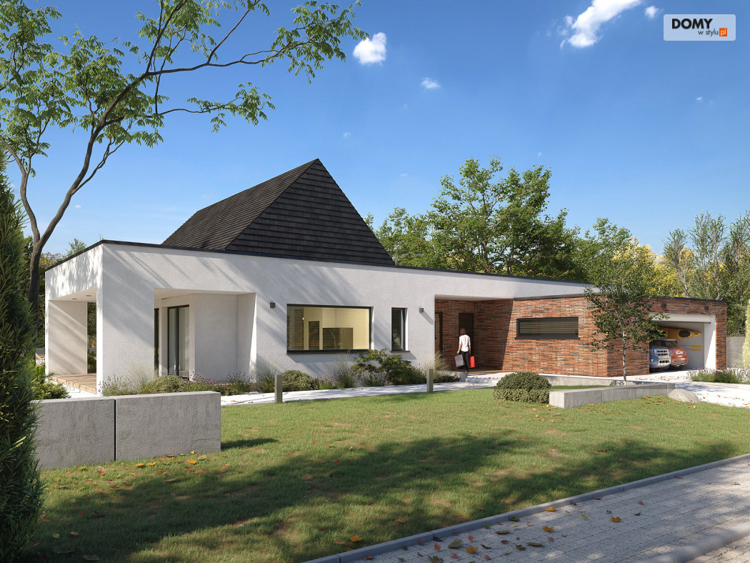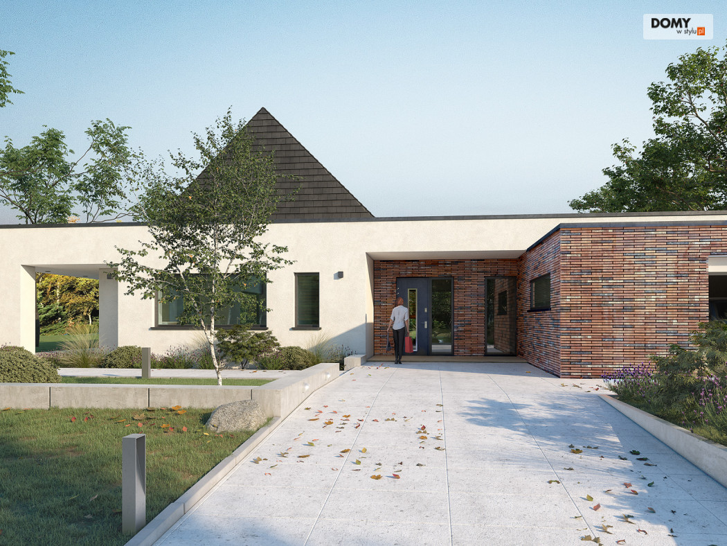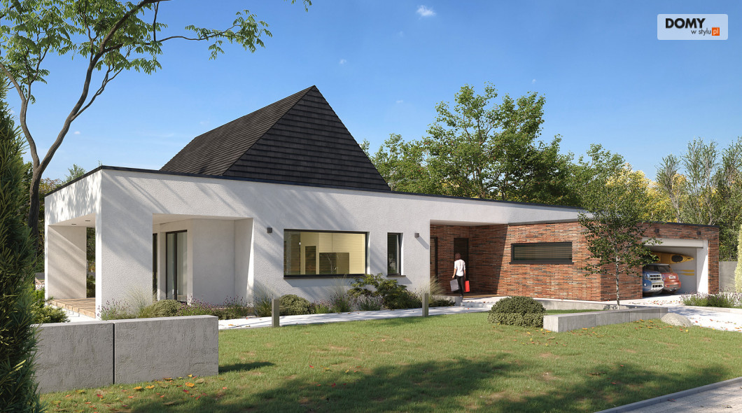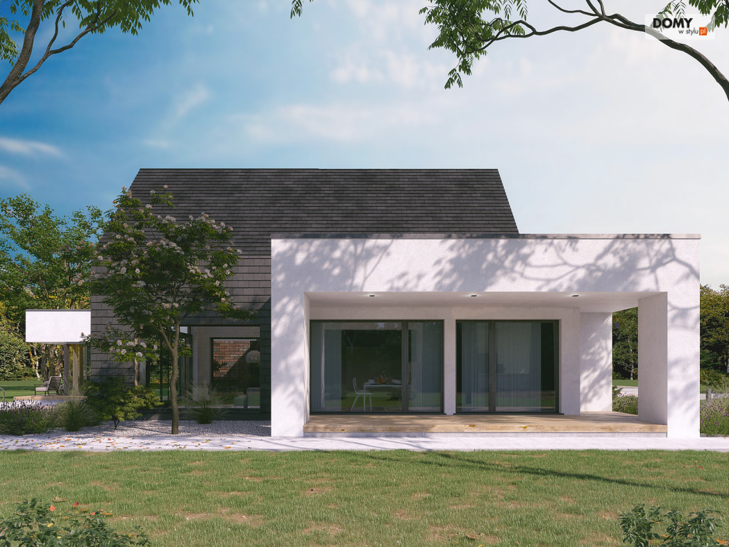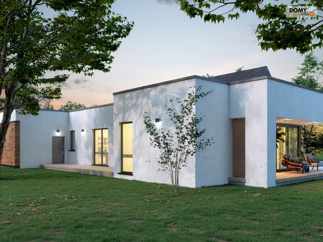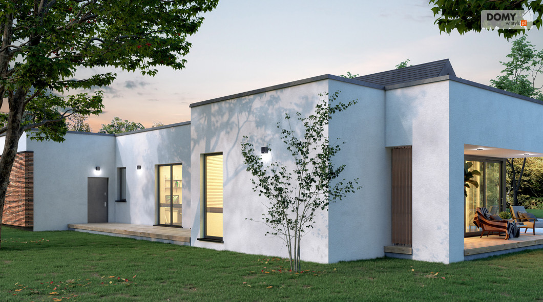 Projekt Temida to nowoczesny projekt domu parterowego, który wyróżnia się nowoczesną stylistyką wykończenia oraz praktycznym układem funkcjonalnym. Rozłożysta bryła budynku wyróżnia się geometrycznymi kształtami, które podkreślają nowoczesny charakter domu. W większości dom został przykryty płaskim dachem, na tle którego wybija się salon przykryty dwuspadowym, bezokapowym dachem. Centralne miejsce w domu zajmuje część dzienna, na którą składa się reprezentacyjny salon, jadalnia oraz otwarta kuchnia. Elementem charakterystycznym są liczne, wysokie przeszklenia oraz wysoki sufit w części dziennej. W dużej kuchni znajduje się centralnie położona wyspa, barek śniadaniowy oraz długi blat roboczy. Zarówno z kuchni jak i z jadalni można wyjść na zadaszony taras. Przy kuchni znajduje się również sporej wielkości spiżarnia. W części nocnej domu zaprojektowano trzy sypialnie oraz ogólnodostępną łazienkę. Główna sypialnia tworzy apartament gospodarzy z własną łazienką, garderobą oraz wyjściem na prywatny, zadaszony taras. Uzupełnieniem układu funkcjonalnego jest szatnia przy wejściu głównym, prowadząca do kotłowni, dwustanowiskowego garażu oraz pomieszczenia technicznego z dodatkowym wyjściem zewnętrznym.