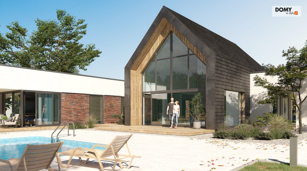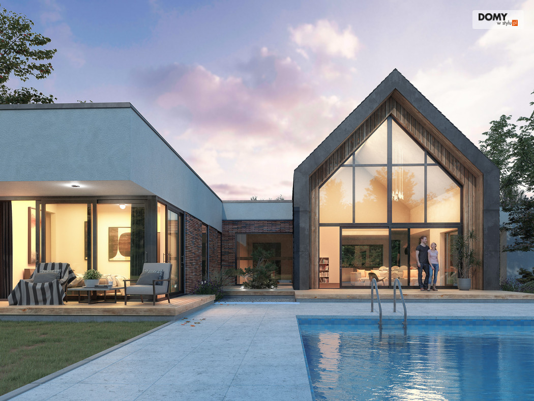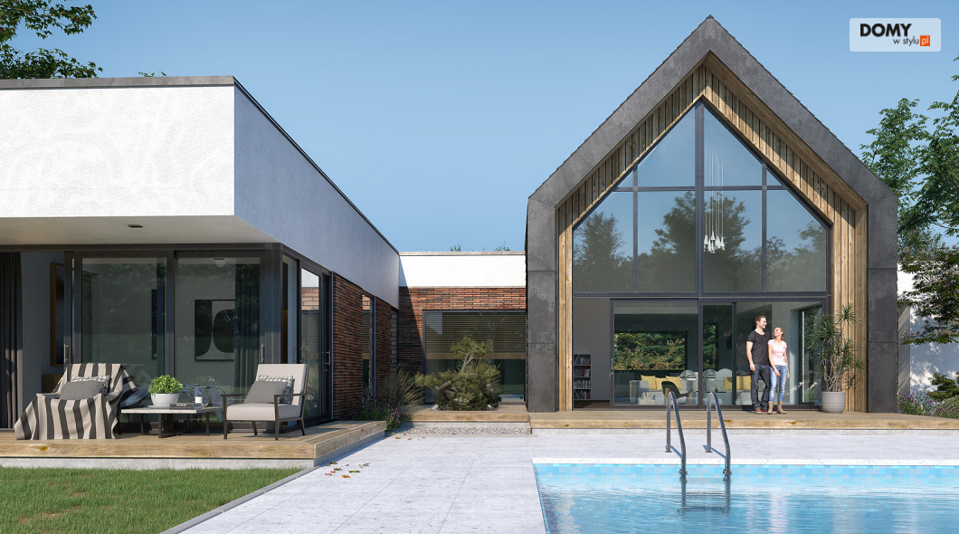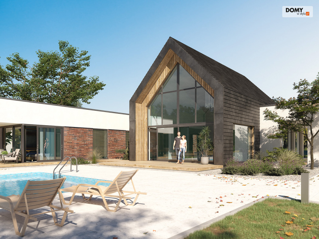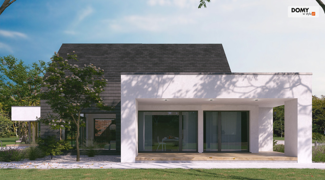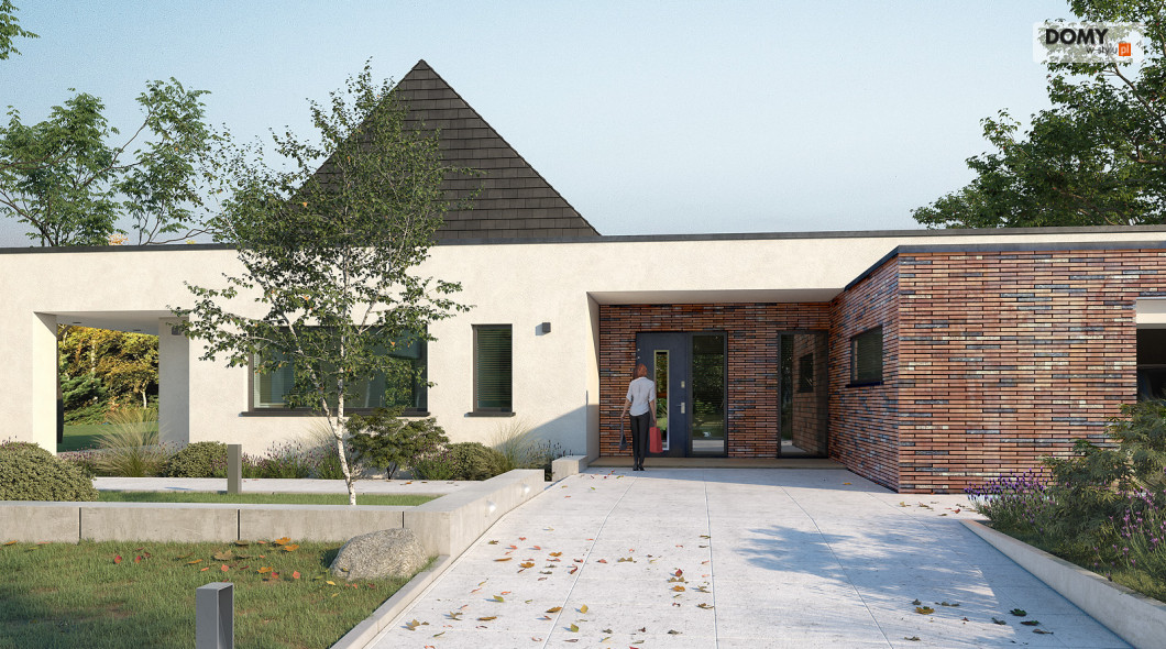 Projekt Temida to nowoczesny projekt domu parterowego, który wyróżnia się nowoczesną stylistyką wykończenia oraz praktycznym układem funkcjonalnym. Rozłożysta bryła budynku wyróżnia się geometrycznymi kształtami, które podkreślają nowoczesny charakter domu. W większości dom został przykryty płaskim dachem, na tle którego wybija się salon przykryty dwuspadowym, bezokapowym dachem. Centralne miejsce w domu zajmuje część dzienna, na którą składa się reprezentacyjny salon, jadalnia oraz otwarta kuchnia. Elementem charakterystycznym są liczne, wysokie przeszklenia oraz wysoki sufit w części dziennej. W dużej kuchni znajduje się centralnie położona wyspa, barek śniadaniowy oraz długi blat roboczy. Zarówno z kuchni jak i z jadalni można wyjść na zadaszony taras. Przy kuchni znajduje się również sporej wielkości spiżarnia. W części nocnej domu zaprojektowano trzy sypialnie oraz ogólnodostępną łazienkę. Główna sypialnia tworzy apartament gospodarzy z własną łazienką, garderobą oraz wyjściem na prywatny, zadaszony taras. Uzupełnieniem układu funkcjonalnego jest szatnia przy wejściu głównym, prowadząca do kotłowni, dwustanowiskowego garażu oraz pomieszczenia technicznego z dodatkowym wyjściem zewnętrznym.